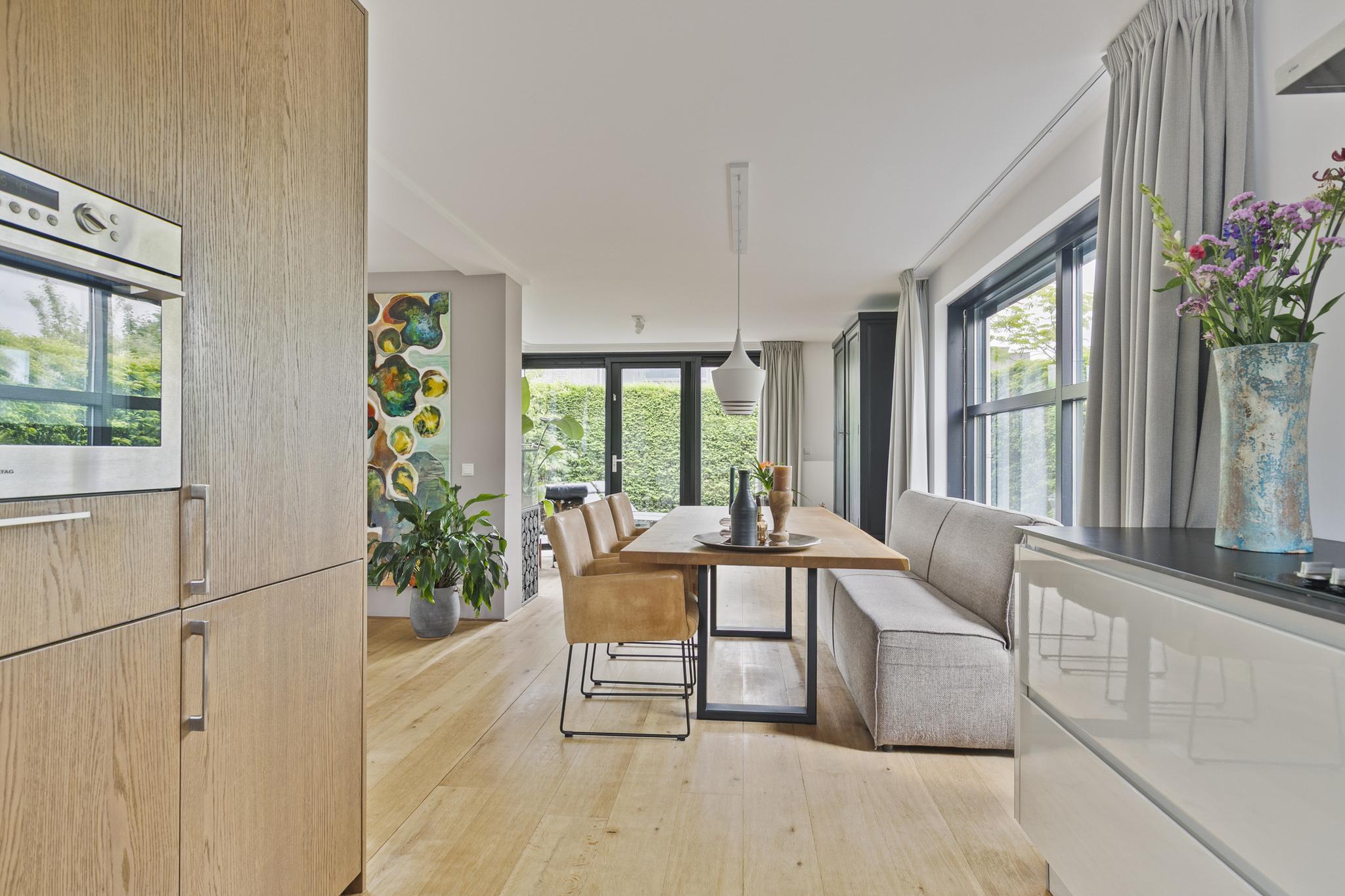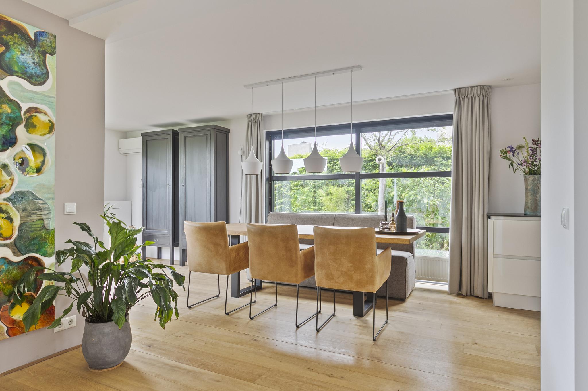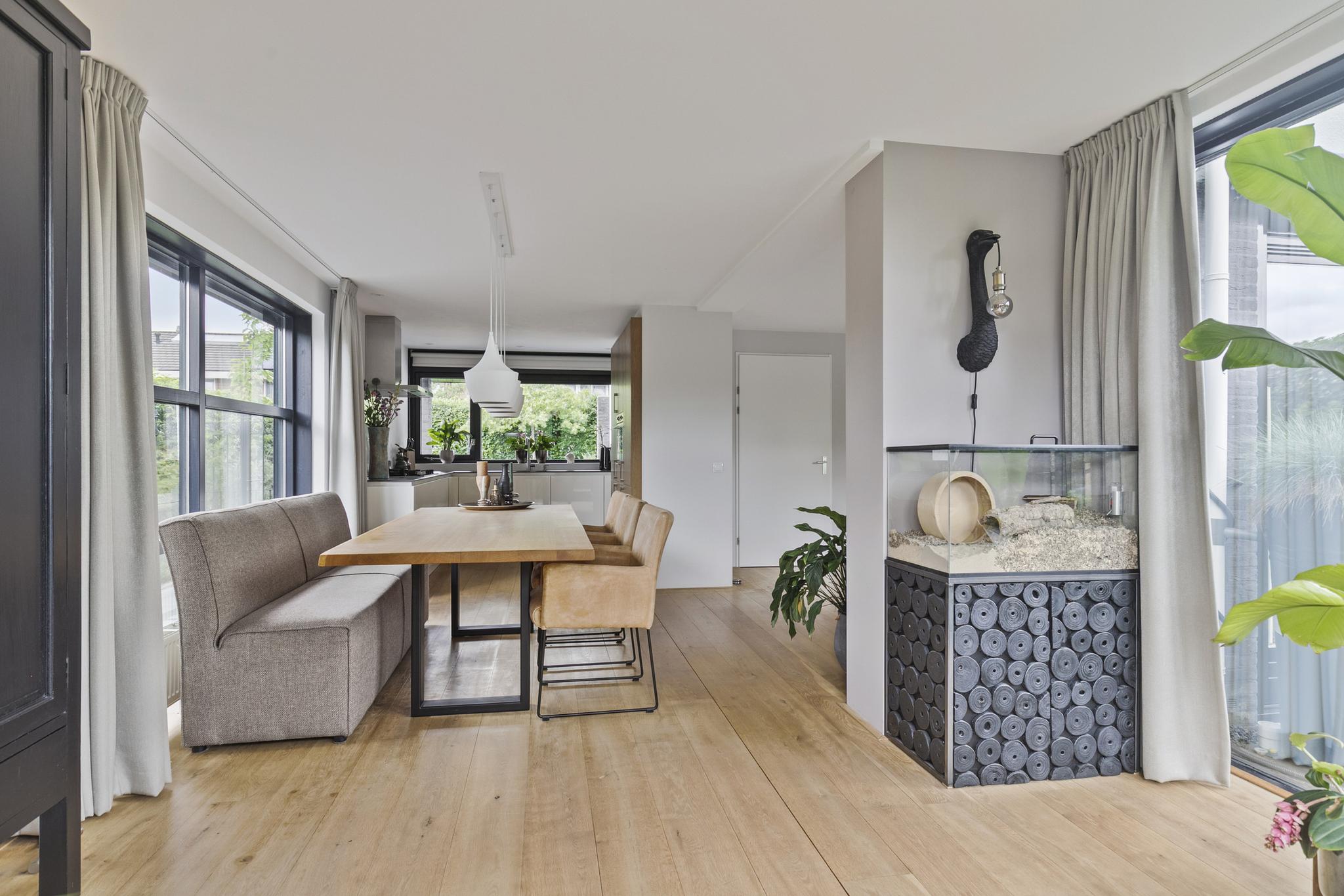 De royale, sfeervolle woon-/eetkamer vormt het hart van het huis, met grote raampartijen rondom. Via de tuindeur en een brede schuifpui is er toegang tot de tuin. De halfopen keuken (hoogglans, met composiet werkblad) is van alle gemakken voorzien: een 5-pits gaskookplaat met wokbrander, rvs-afzuigkap, close-in boiler, koel-vriescombinatie, combi-oven/magnetron en een vaatwasser.