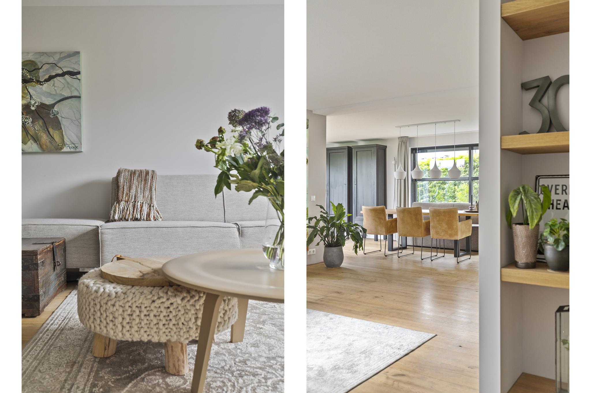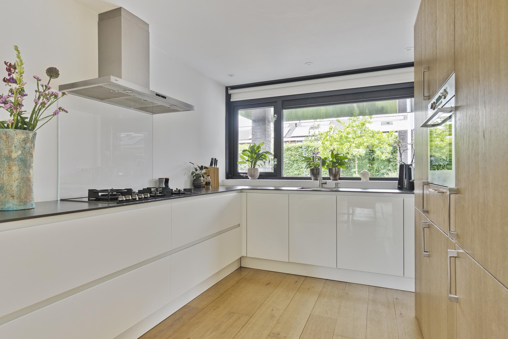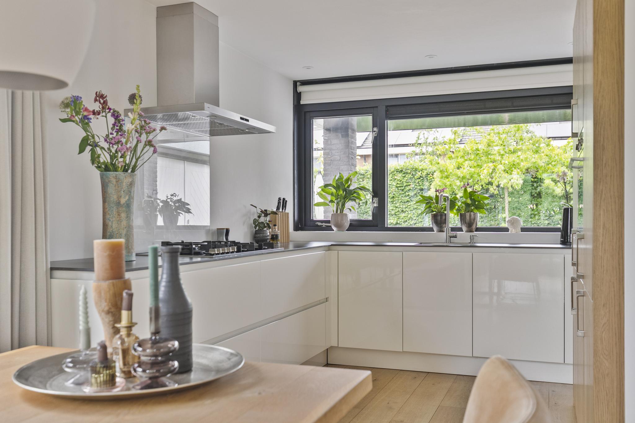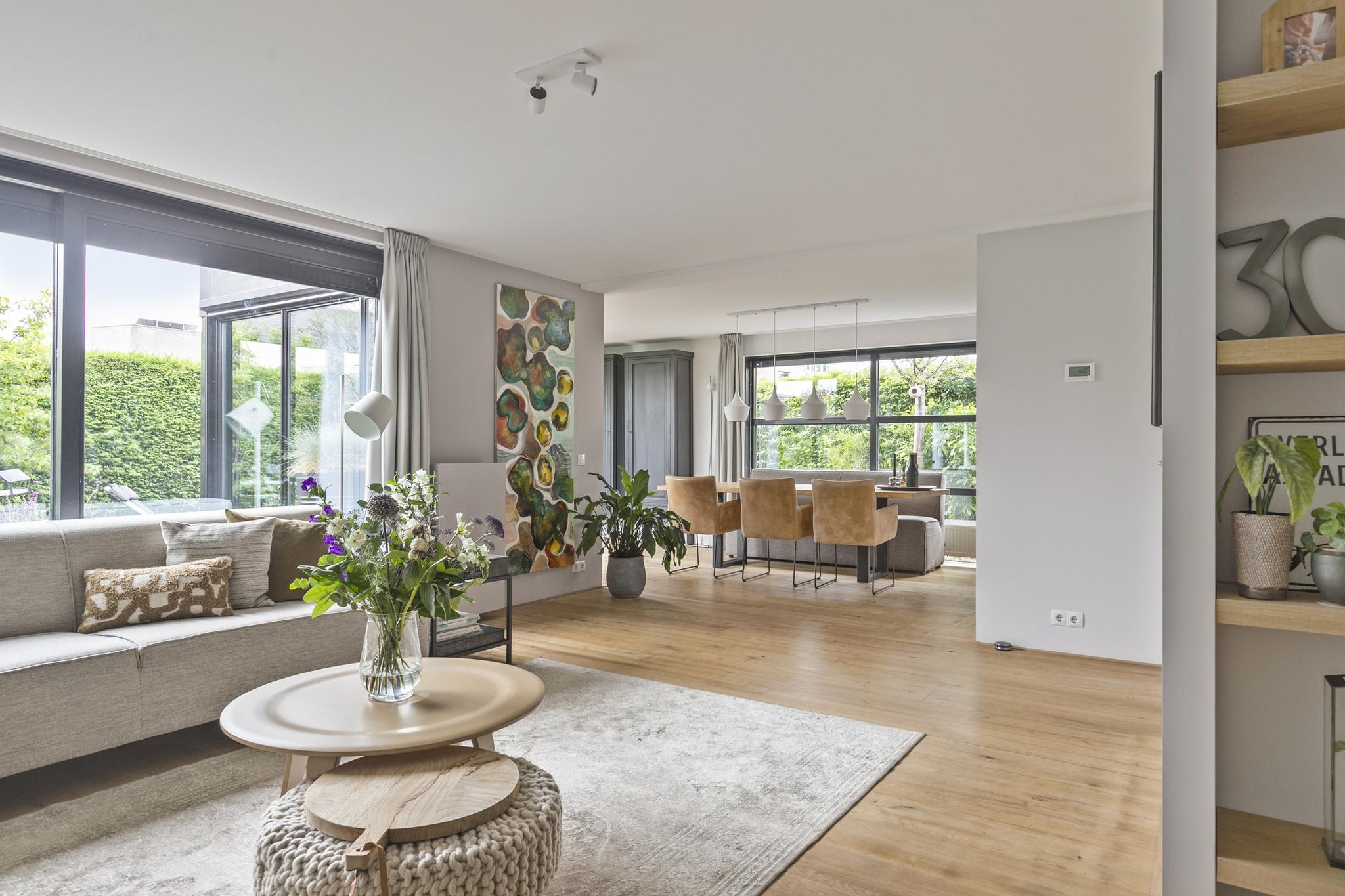 De royale, sfeervolle woon-/eetkamer vormt het hart van het huis, met grote raampartijen rondom. Via de tuindeur en een brede schuifpui is er toegang tot de tuin. De halfopen keuken (hoogglans, met composiet werkblad) is van alle gemakken voorzien: een 5-pits gaskookplaat met wokbrander, rvs-afzuigkap, close-in boiler, koel-vriescombinatie, combi-oven/magnetron en een vaatwasser.