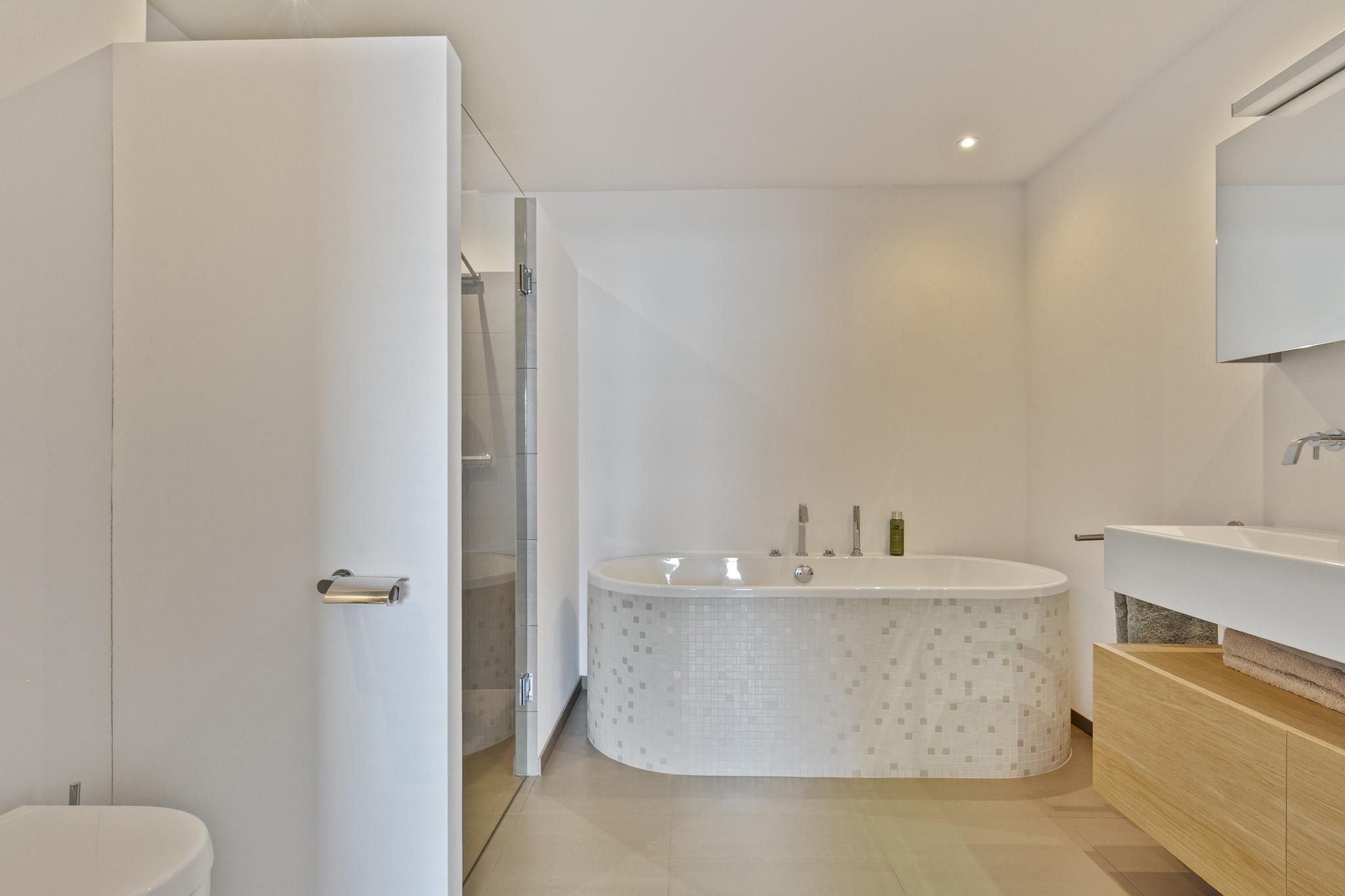 De royale hoofdslaapkamer biedt toegang tot de luxe badkamer met duo-ligbad, inloopdouche met dubbele douchekop, dubbele wastafel, tweede toilet en dimbare spots. De slaapkamer is uitgerust met een stille airco, die niet alleen koelt en verwarmt, maar ook de lucht zuivert.