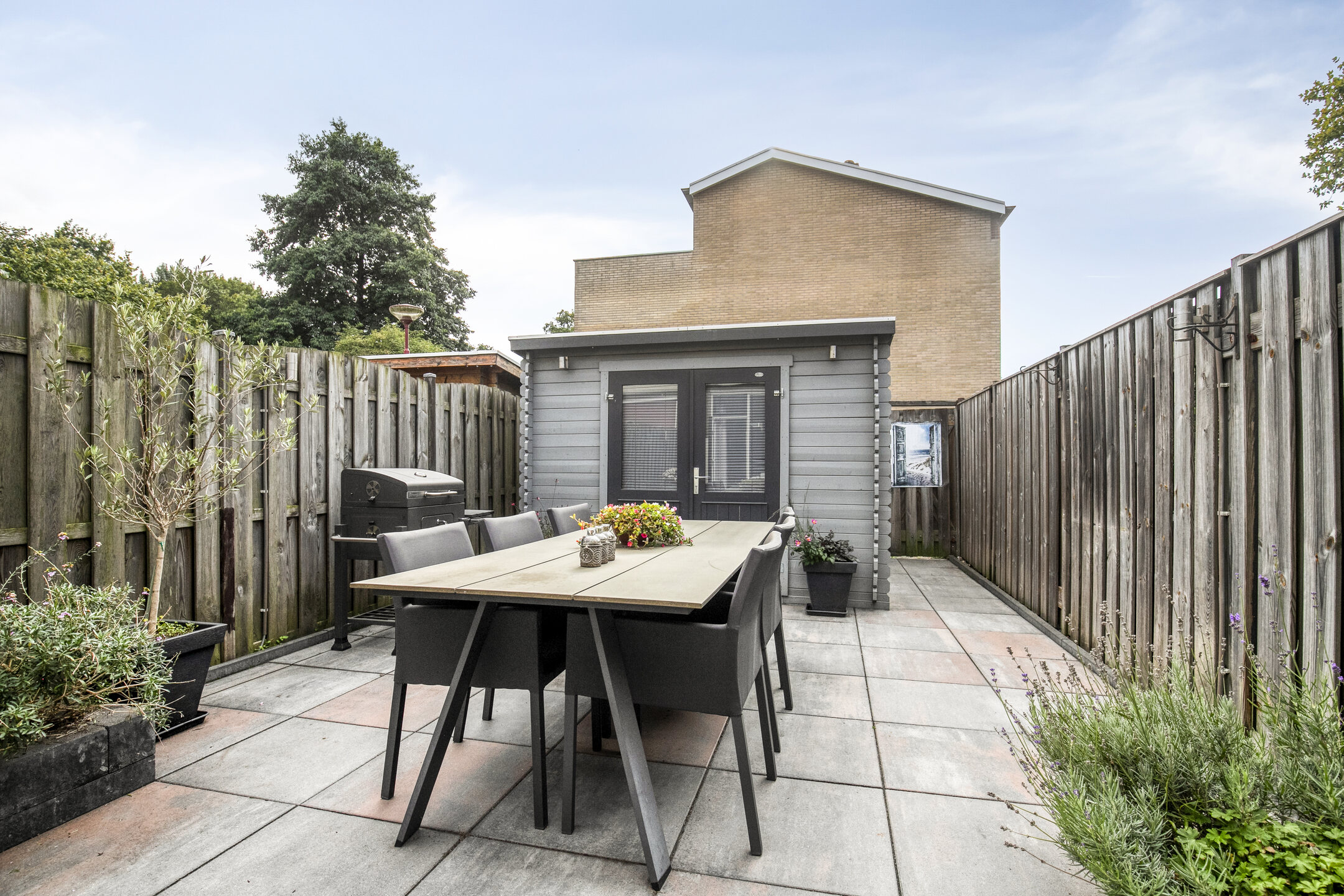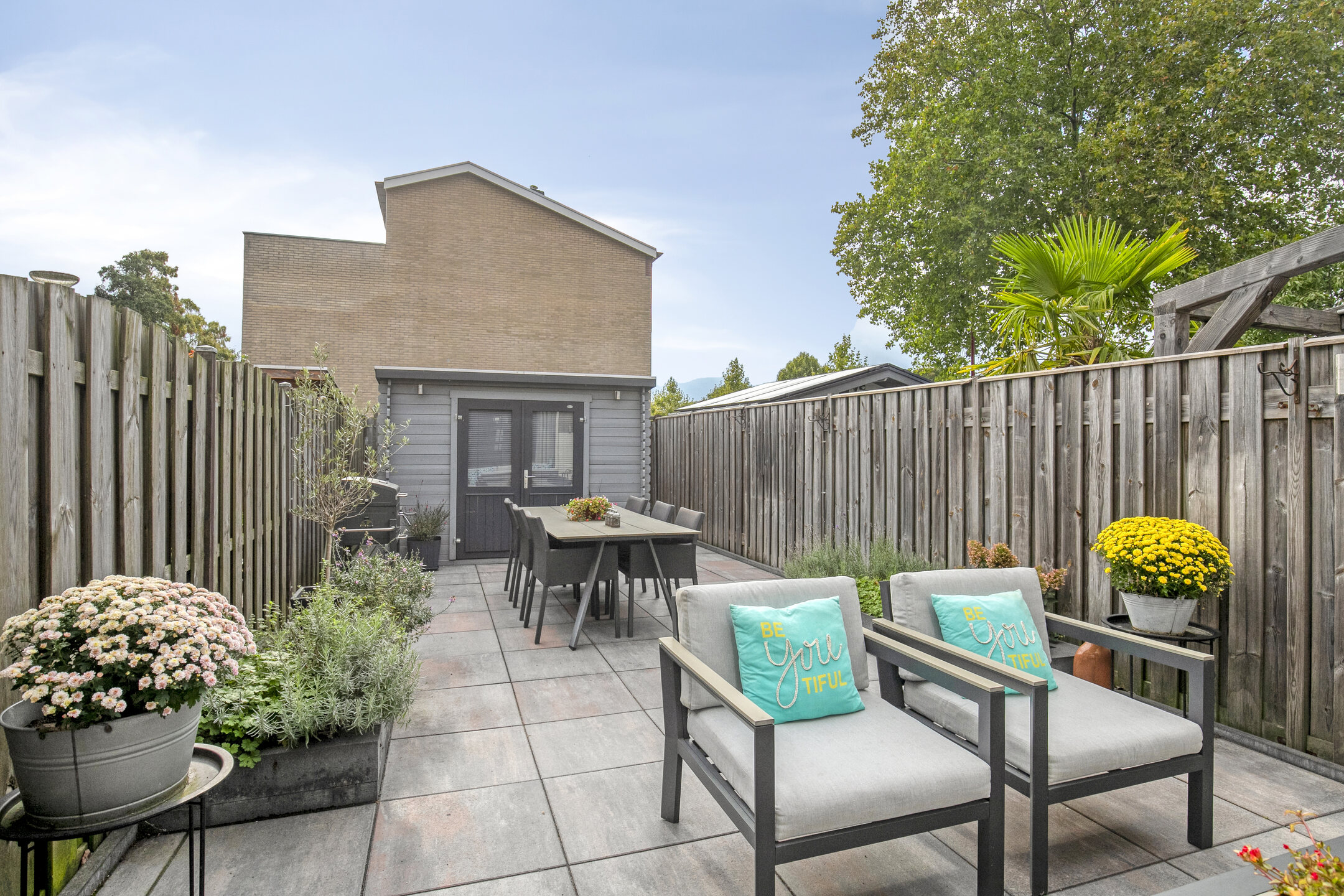 De achtertuin is ruim 12 meter diep en ligt op het zonnige zuidwesten — optimaal genieten dus! Achterin staat een houten chalet/berging en de tuin is onderhoudsarm aangelegd met fraaie grote tuintegels en borders. Er is een elektrische zonwering aanwezig en een achterom. De laatste ca. 2,70 meter grond wordt gehuurd van de gemeente, wat zorgt voor nét dat beetje extra ruimte.