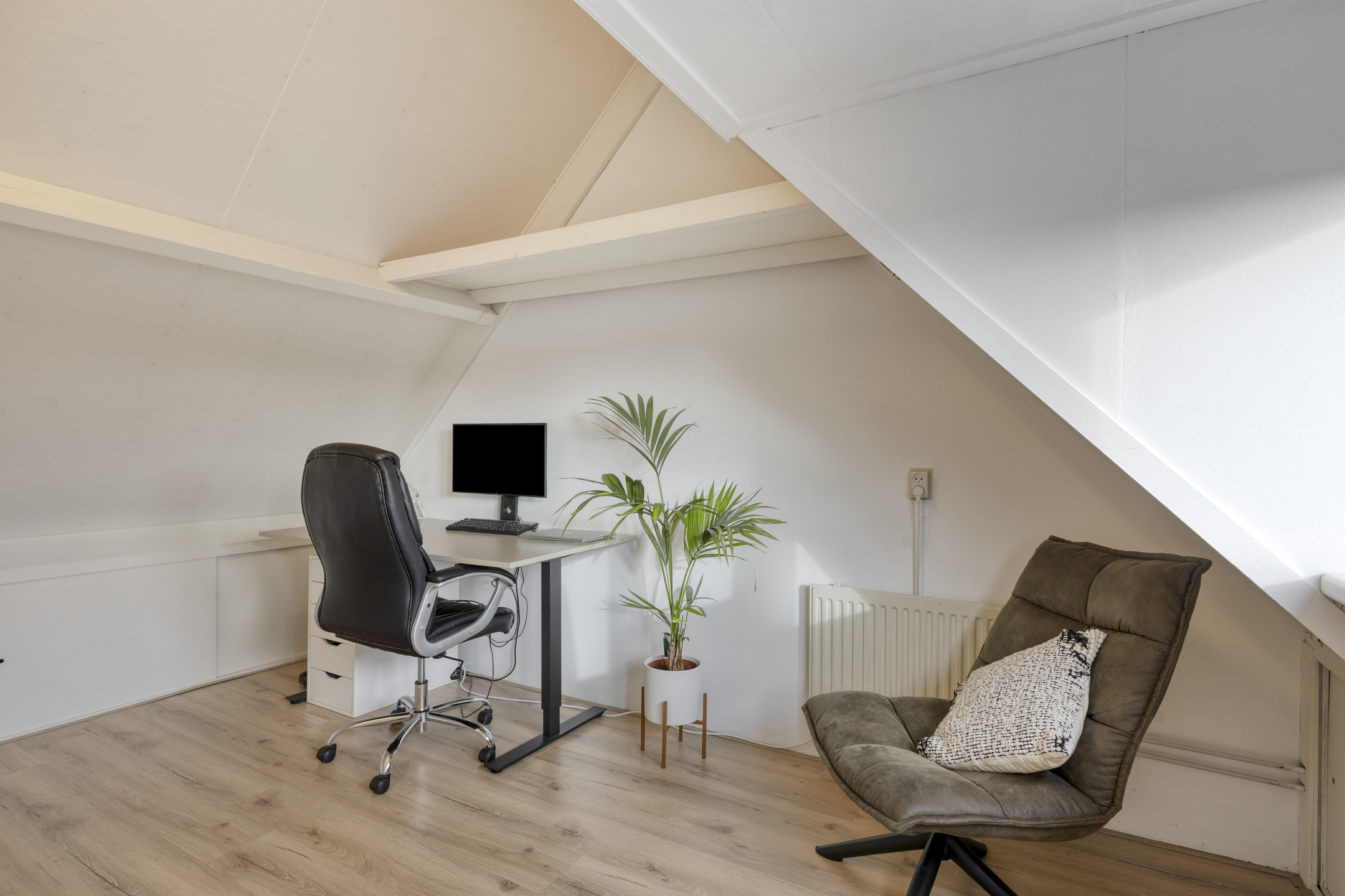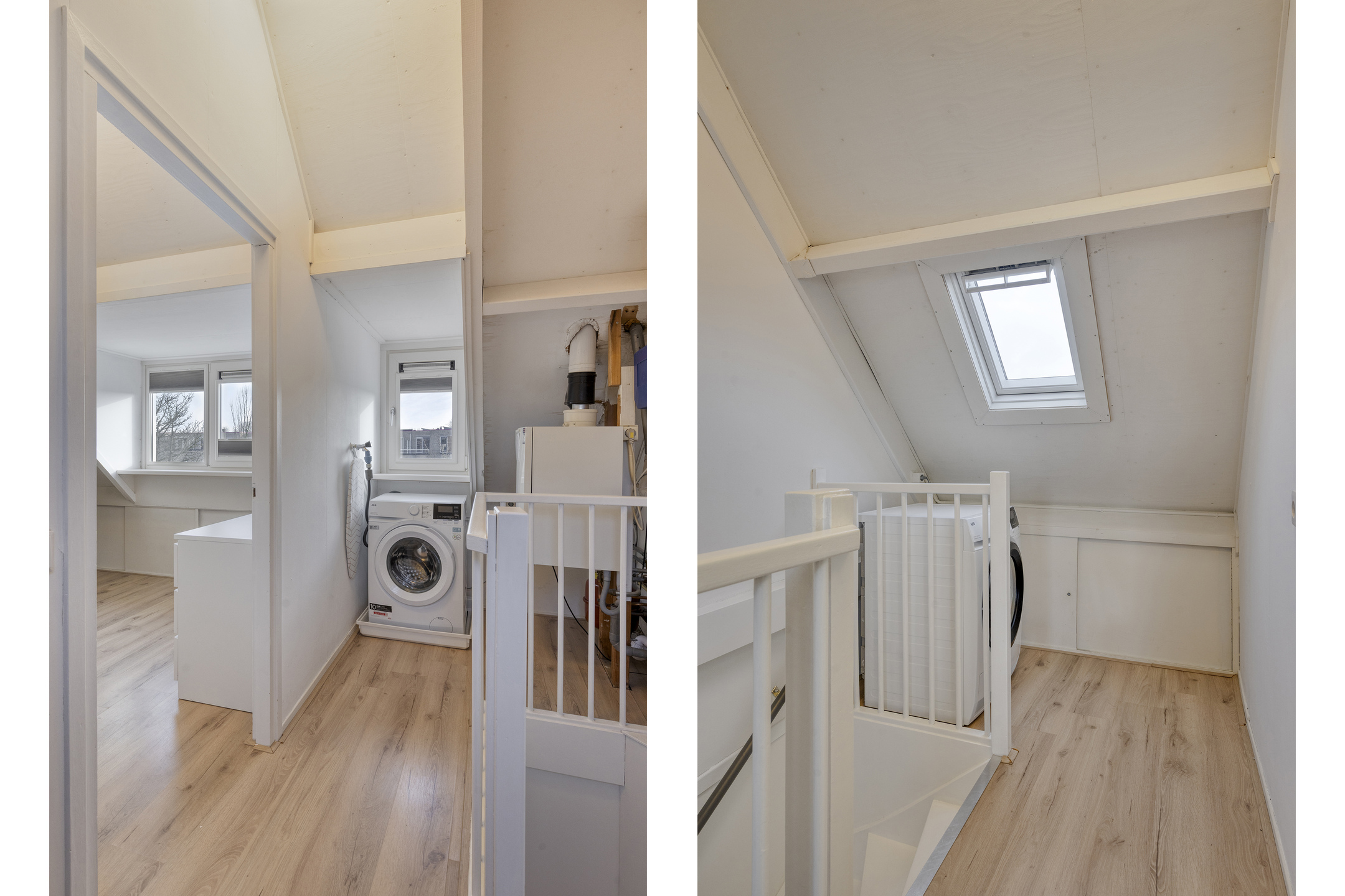 De tweede verdieping biedt een volwaardige vierde slaapkamer (12 m²) met dakkapel en HR++ kunststof kozijnen. De kamer is afgewerkt met laminaat en voorzien van verduisterende bottom-up/top-down plisségordijnen en extra bergruimte onder de schuine kap. Op de overloop bevinden zich de wasmachine- en drogeraansluiting, de Nefit Topline cv-ketel (2009) en de mechanische ventilatie-unit. Ook hier is extra daglicht dankzij een dakkapel en een kunststof Velux dakraam.