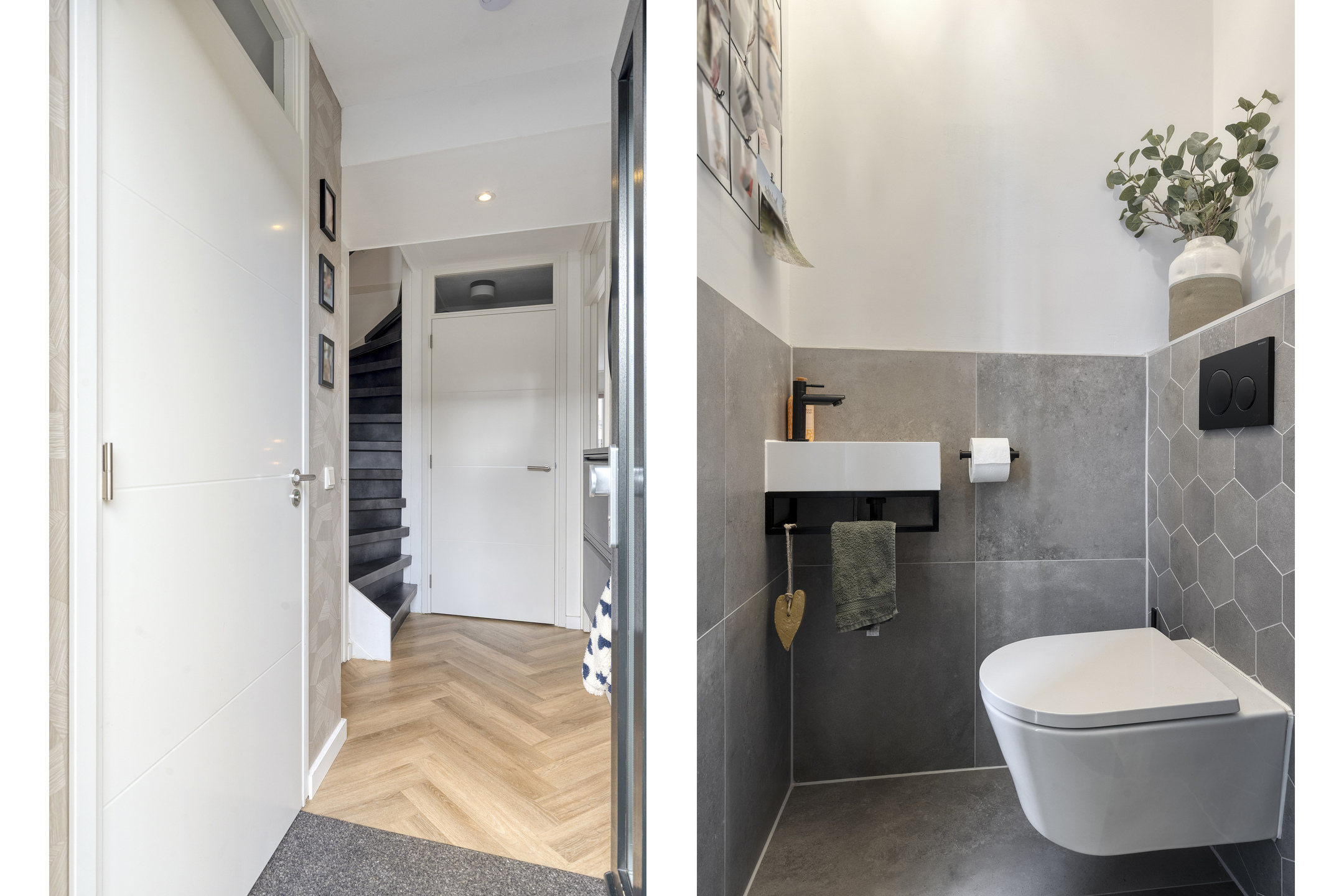 De entree geeft toegang tot de hal met moderne toiletruimte met fonteintje, vernieuwde meterkast, garderobe en een ruime trapkast. Deze trapkast is ideaal voor jonge gezinnen: zelfs een wandelwagen past hier met gemak. De waterontharder is hier netjes geplaatst en blijft achter. De trap is gerenoveerd en via een stijlvolle glasdeur kom je in de woonkamer.