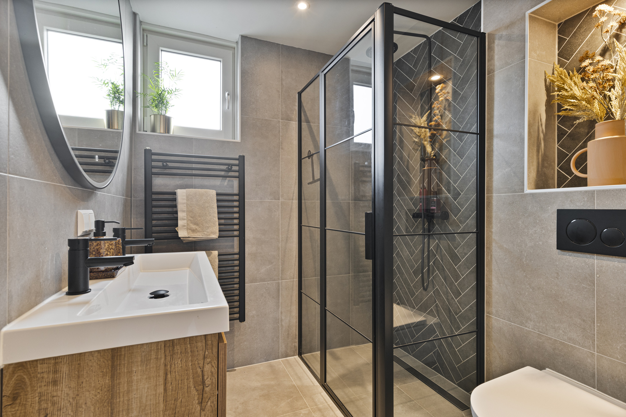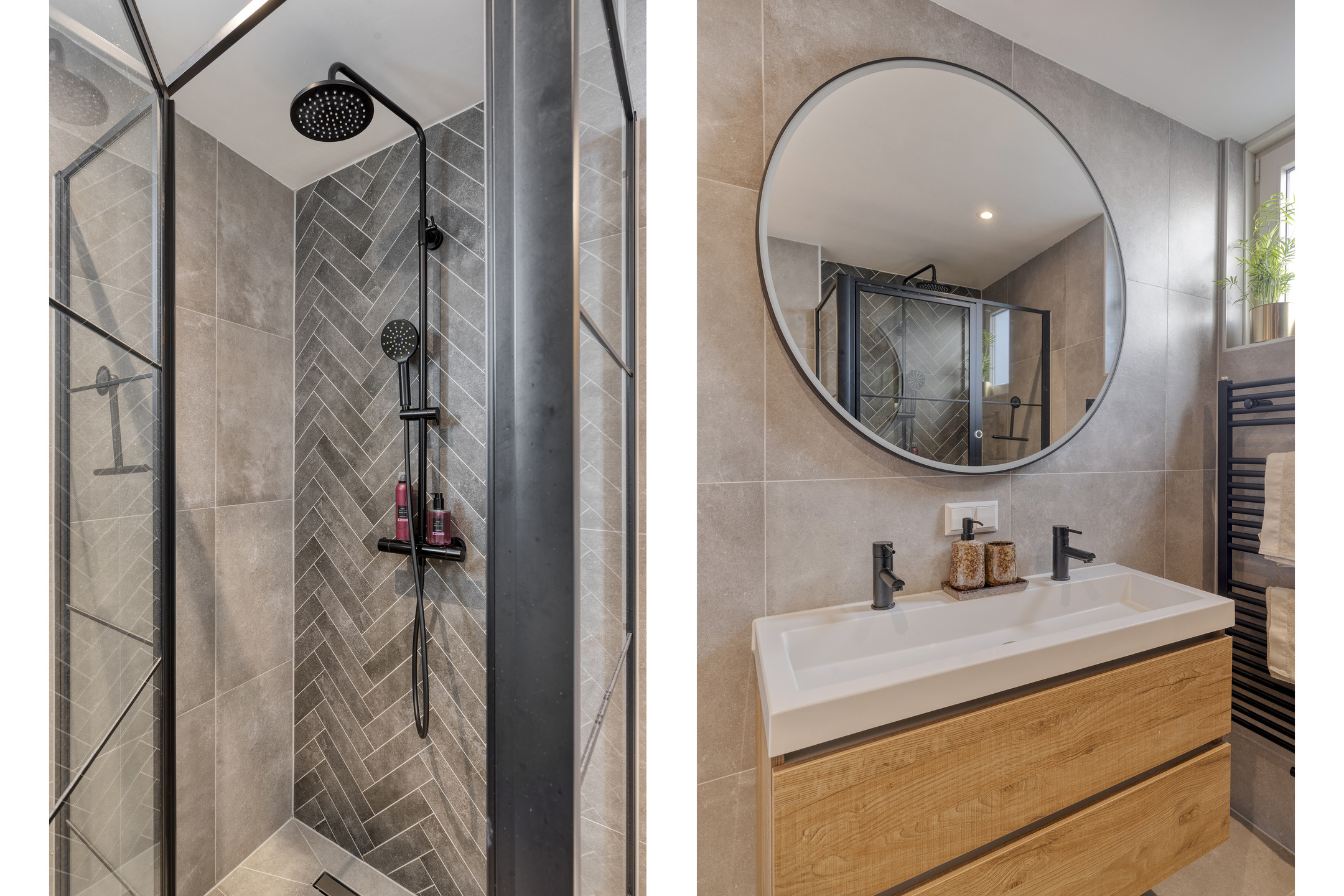 De badkamer is volledig vernieuwd in 2022. Deze is voorzien van elektrische vloerverwarming, mechanische ventilatie, een verwarmde en verlichte spiegel, dubbele wastafel met meubel en een ruime inloopdouche met regendouche. Dimbare spotjes zorgen voor een prettige sfeer.
