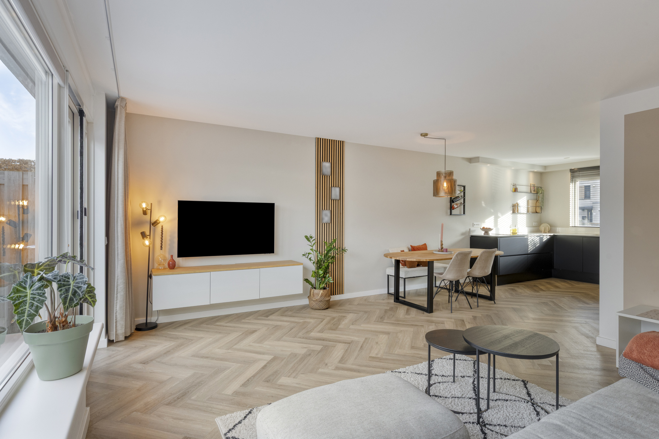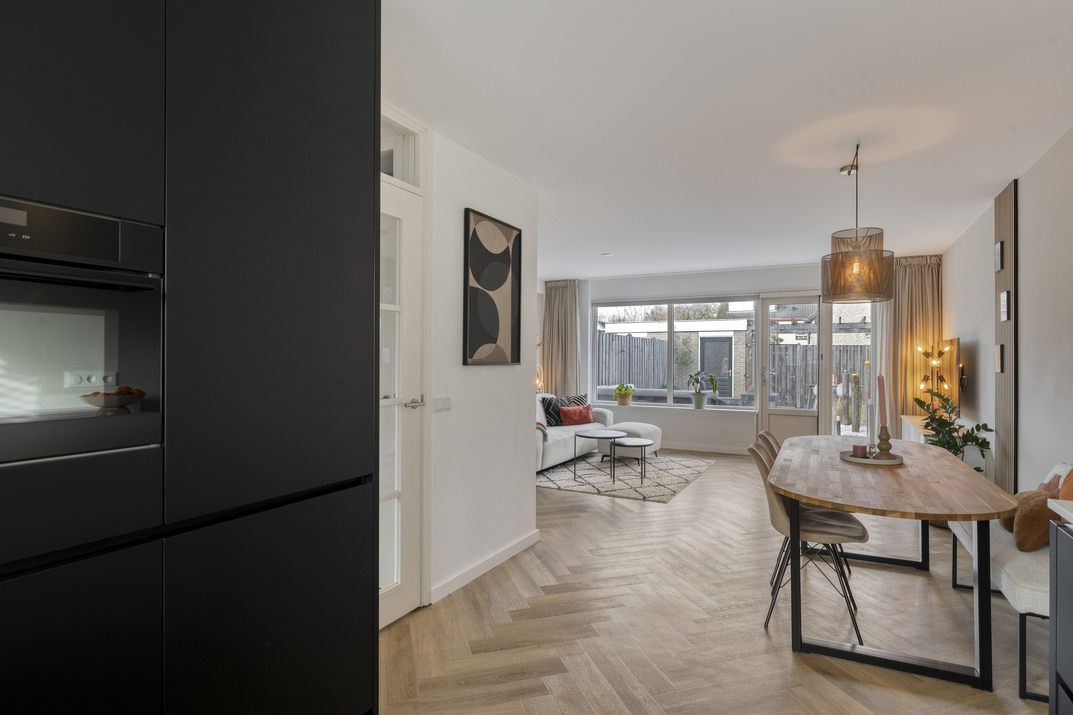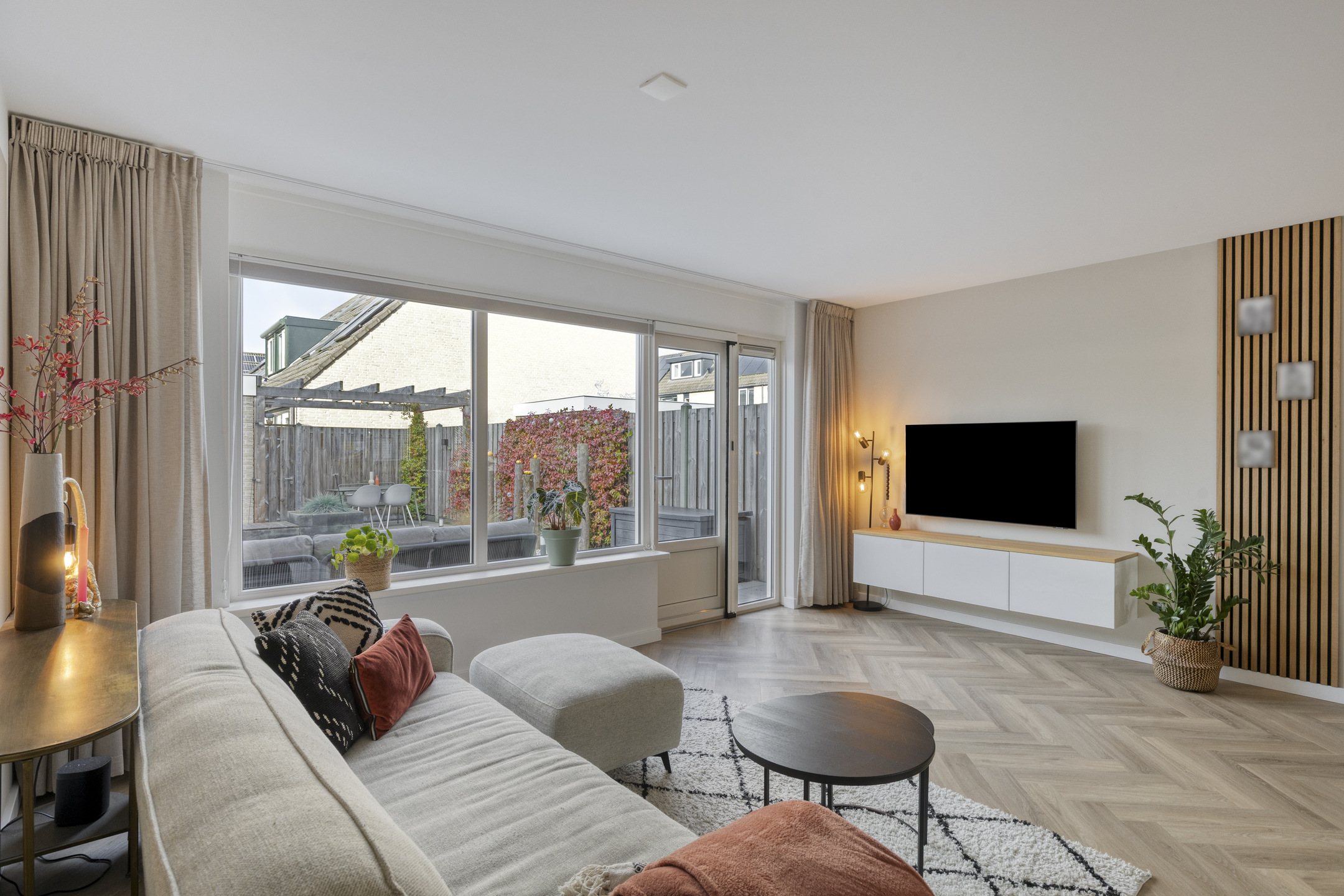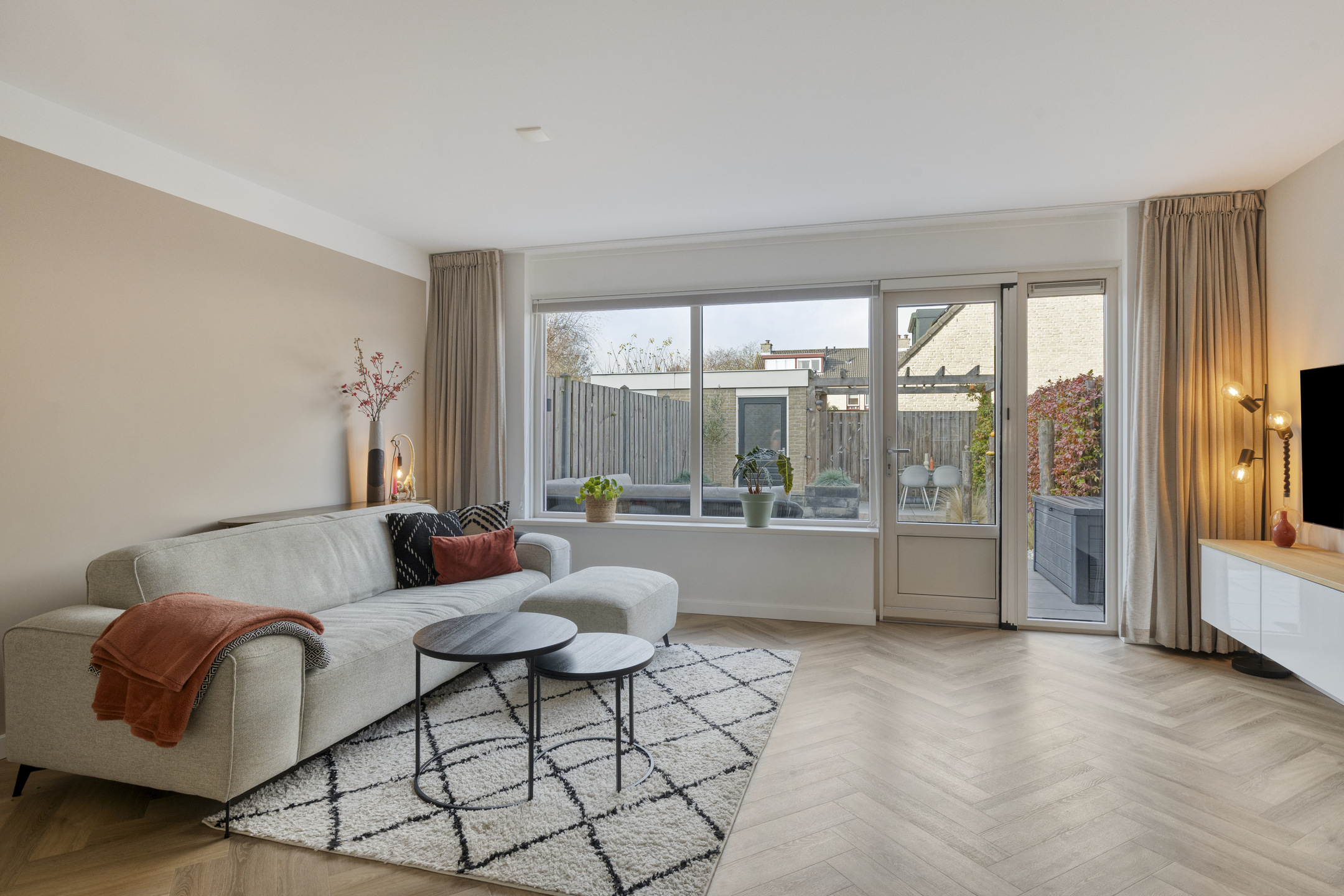 De woonkamer biedt via een loopdeur toegang tot de tuin en is voorzien van een kunststof kozijn met HR++ beglazing en plissé raambekleding.