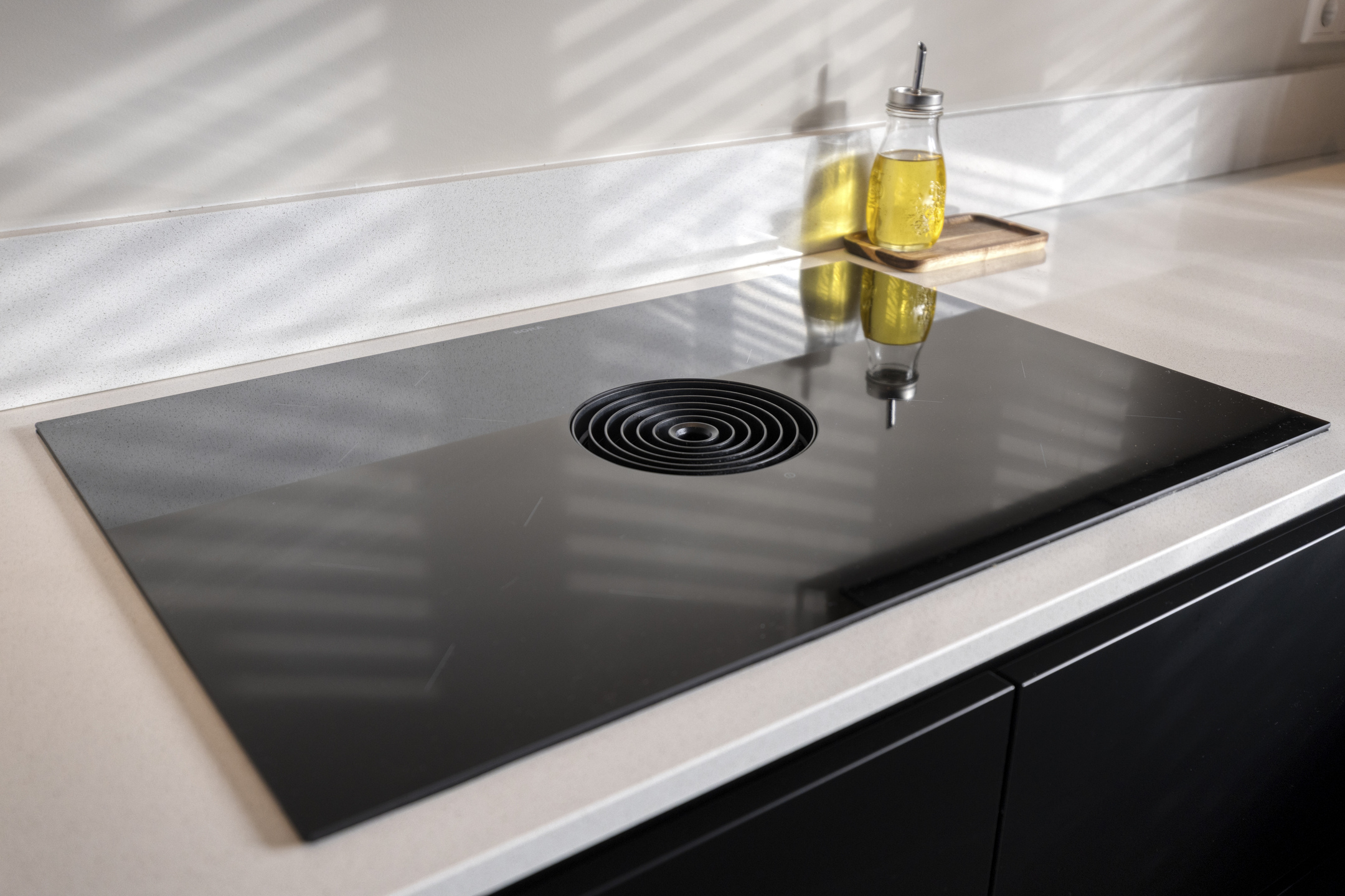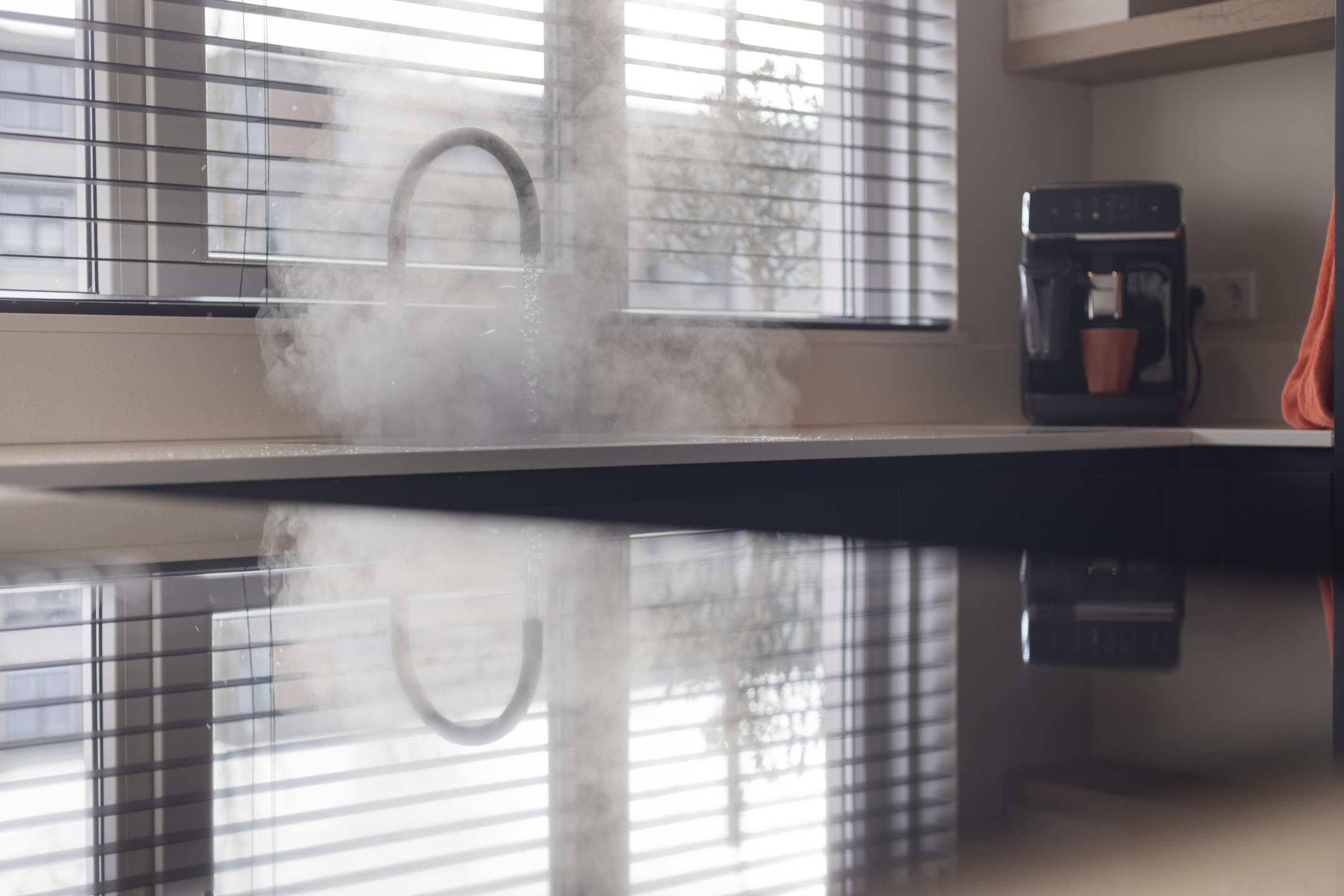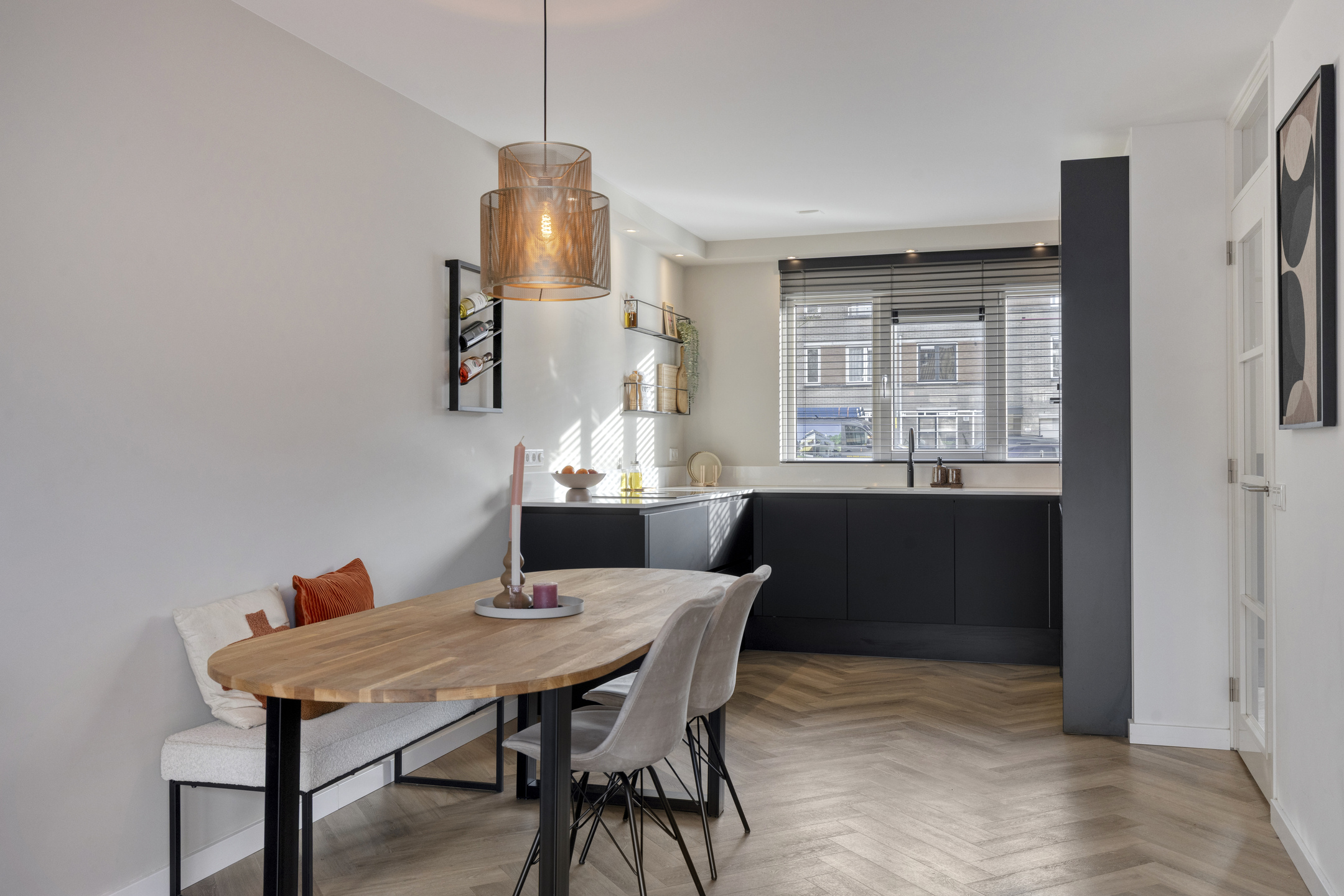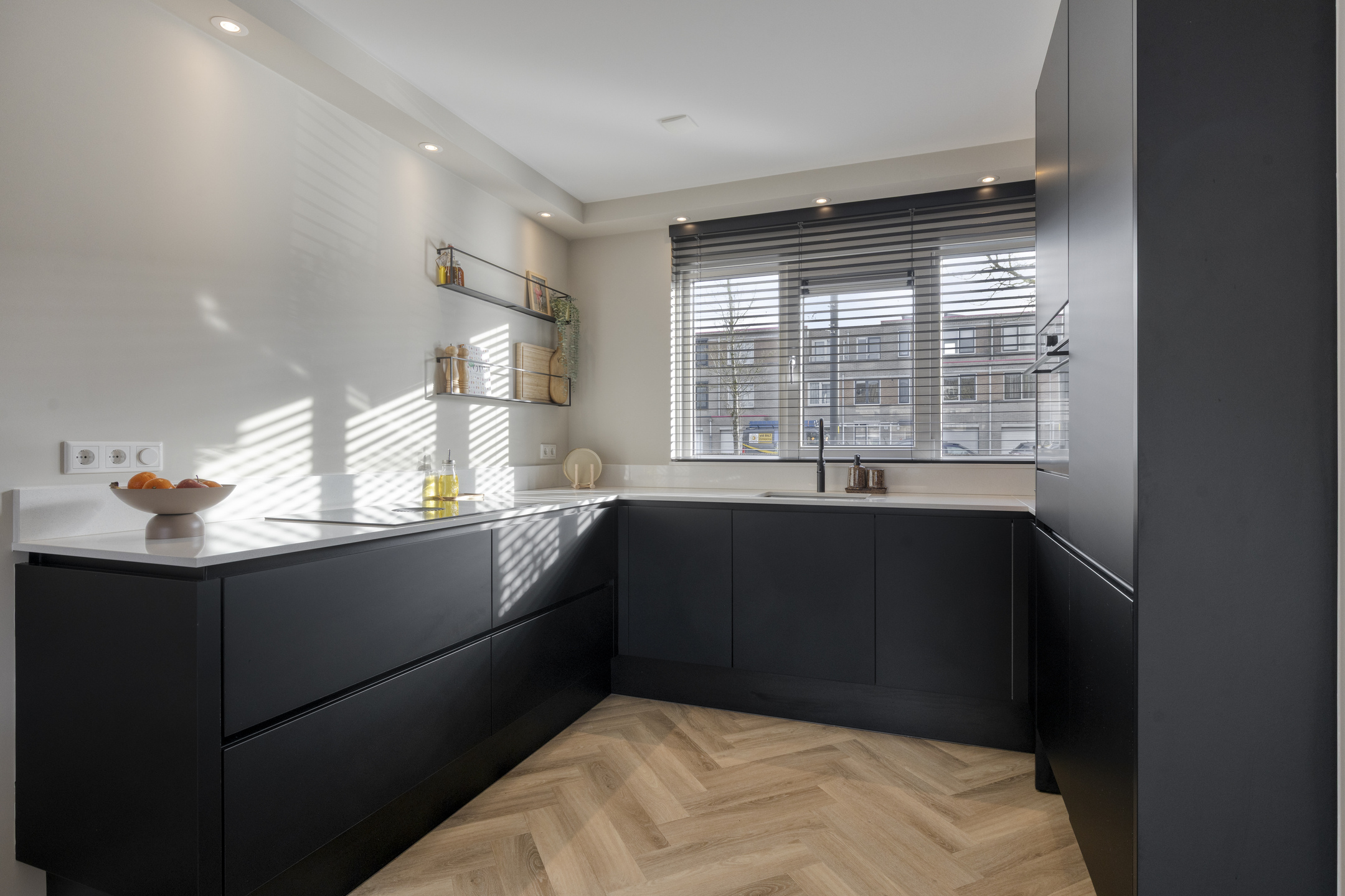 De begane grond is afgewerkt met een visgraat PVC-vloer met vloerverwarming en strak gestuukte wanden en plafond. Aan de voorzijde bevindt zich de open keuken, die in 2022 volledig is vernieuwd. Deze keuken is volledig uitgerust met hoogwaardige en moderne inbouwapparatuur, zoals een Bora 4-pits kookplaat met een geïntegreerd recirculatie-afzuigsysteem, een Quooker Combi (7 liter) voor direct kokend en warm water, combi oven/-magnetron, koelkast, vriezer en een vaatwasser. Alles is fraai gecombineerd met een composiet werkblad en sluit perfect aan bij de moderne uitstraling van de woning.