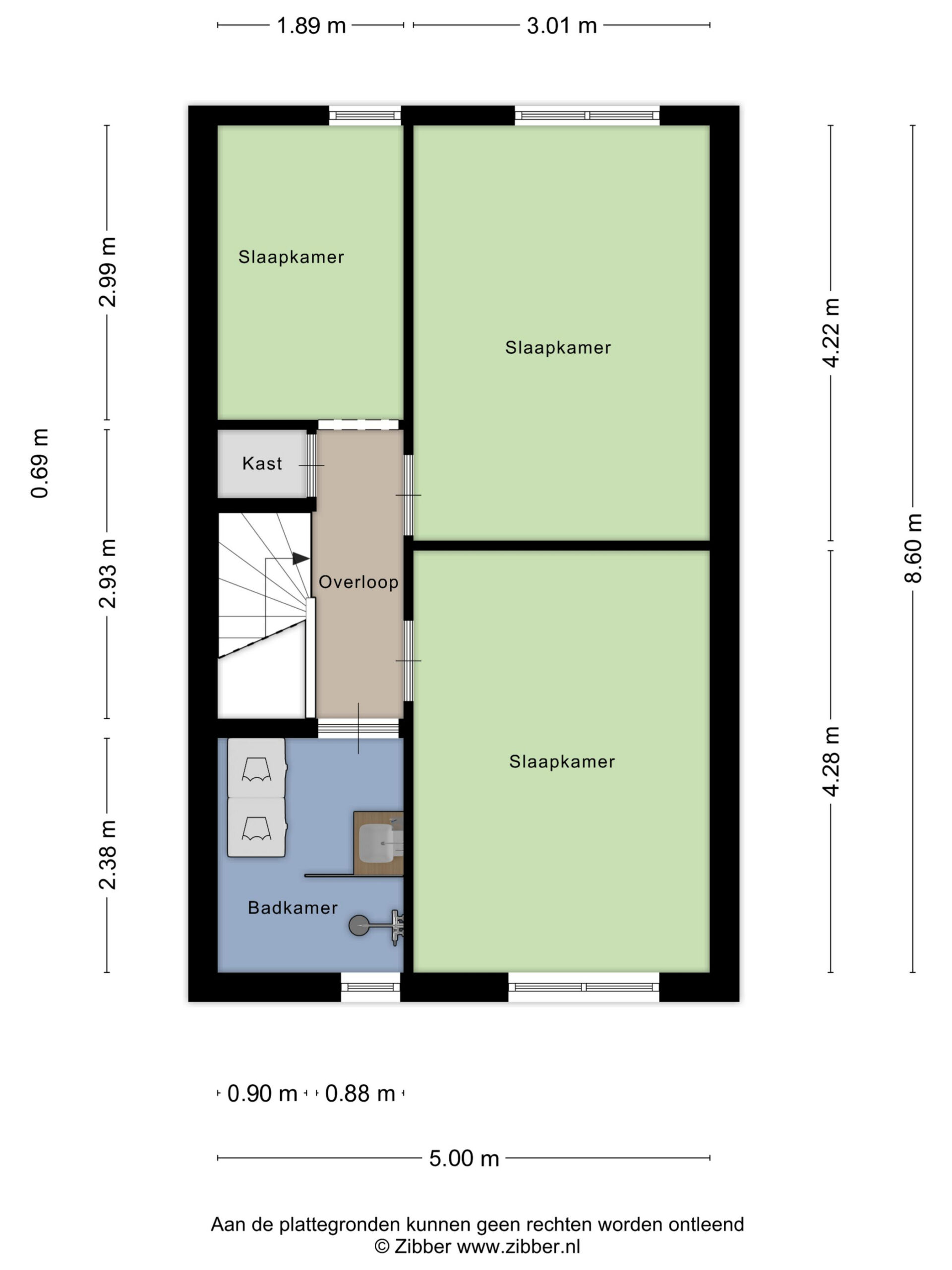 De tweede verdieping biedt verrassend veel ruimte. Vanaf de overloop (met bergkast) is er toegang tot drie slaapkamers en de badkamer. De grootste slaapkamer (ca. 12,9 m²) ligt aan de voorzijde van de woning met toegang tot de praktische bergvliering – ideaal voor spullen die je niet dagelijks nodig hebt. Aan de achterzijde ligt een tweede, ruime kamer (ca. 12.7 m²) en de derde kamer (ca. 5.6 m²). Deze is perfect als werk-, baby- of kleedkamer.