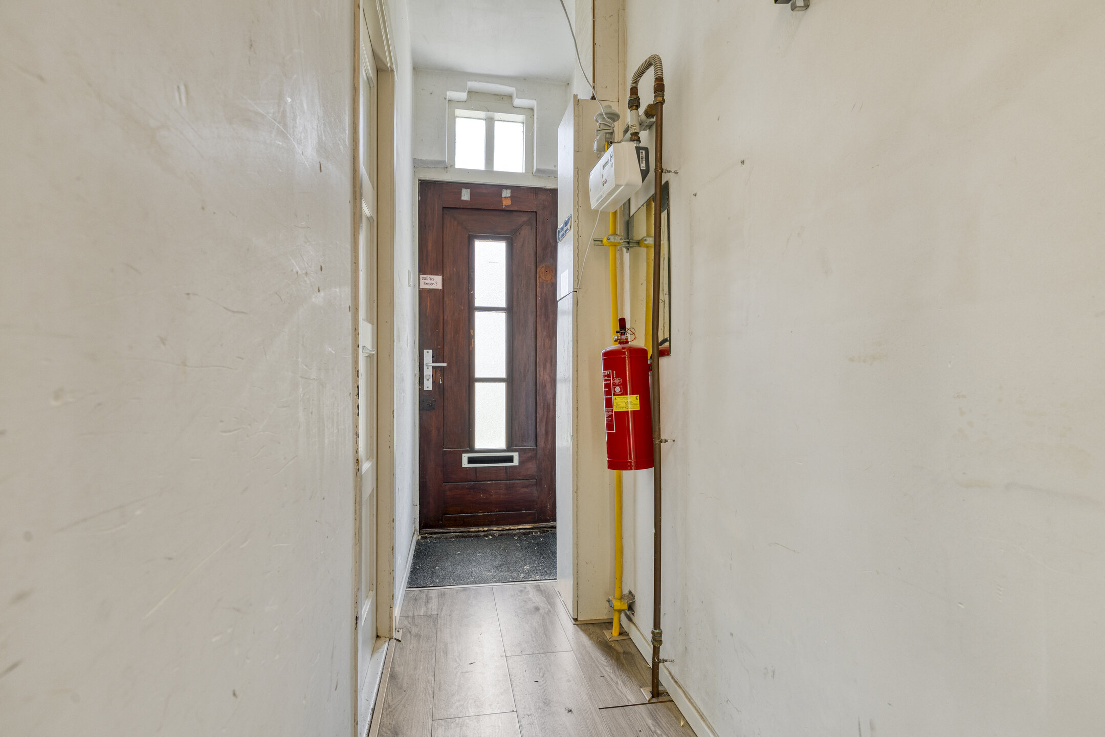 Entree met meterkast en royale hal met trapopgang. Toegang tot de woonkamer met openslaande deuren naar de achtertuin, keuken met deur naar het zijpad, slaapkamer (ca. 8,5 m²) en badkamer voorzien van douche, toilet en wastafel.