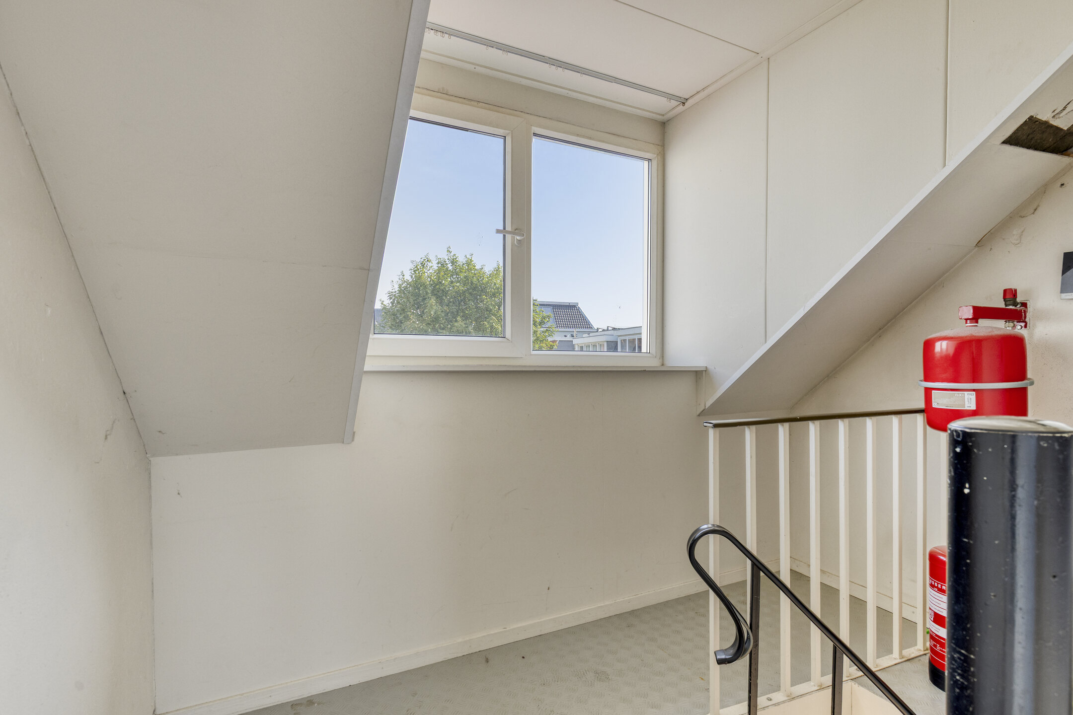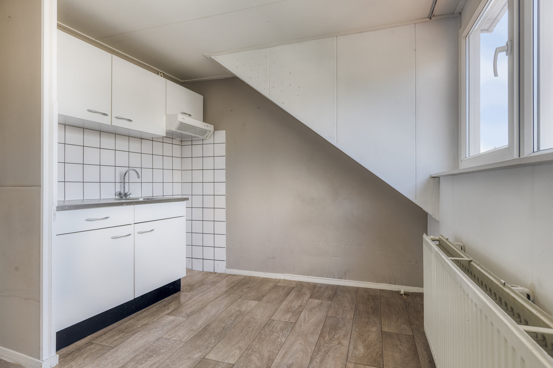 Centrale overloop met eenvoudig keukenblok. Twee ruime kamers (ca. 15 m² en 16,1 m²), waarvan de achterkamer toegang biedt tot een ruim en zonnig balkon.