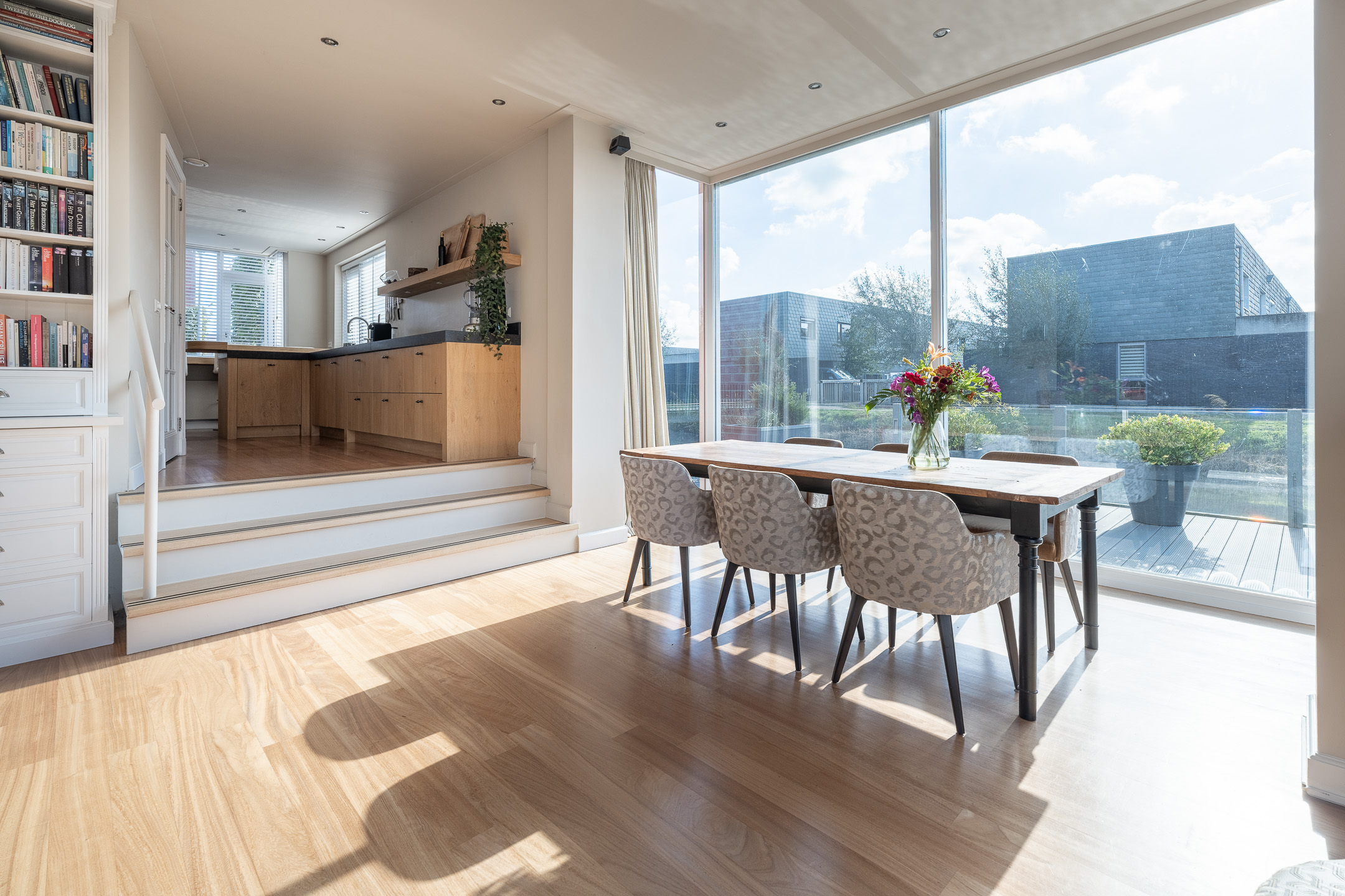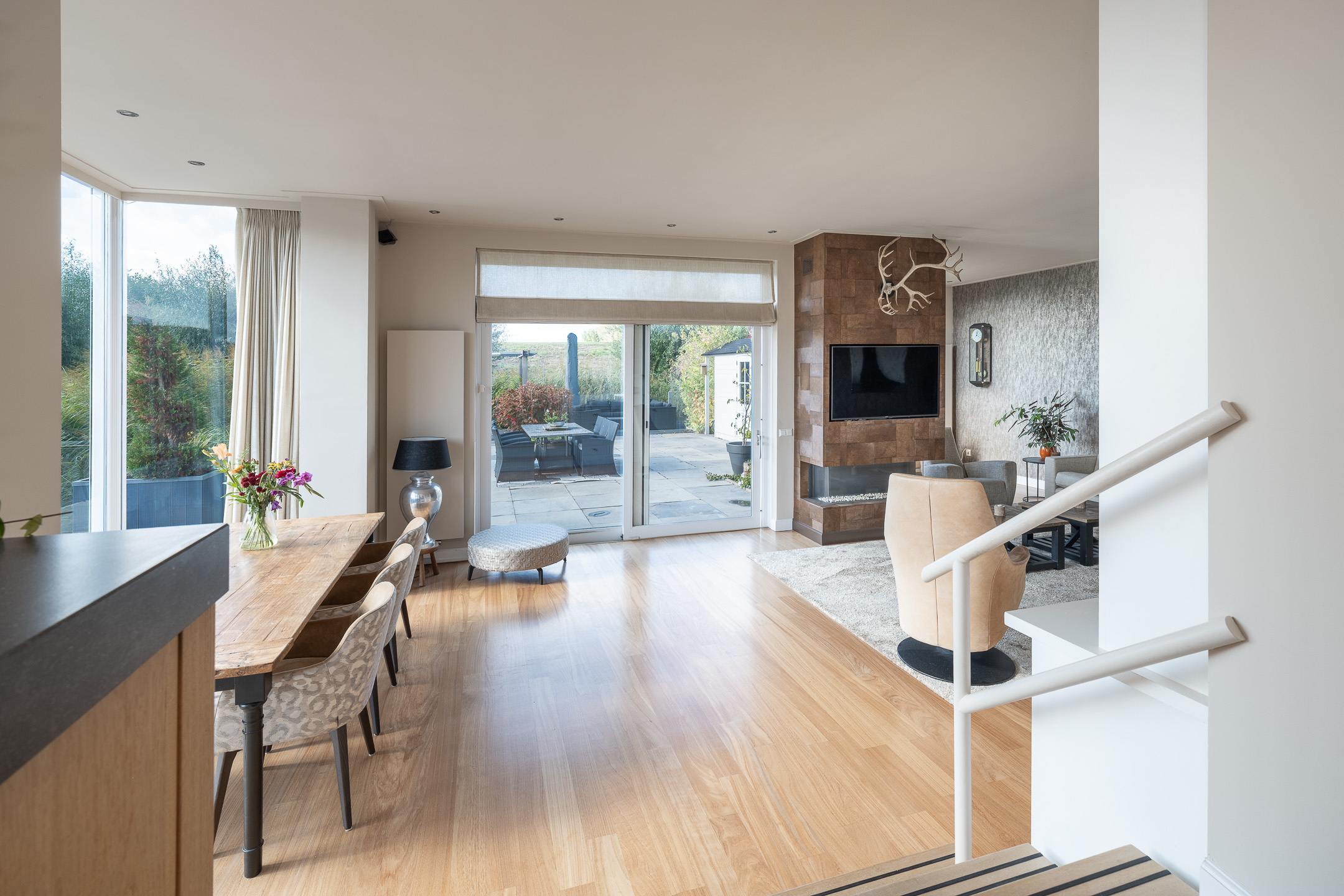 Vanuit de keuken kijk je over de sfeervolle, twee treden lager gelegen woonkamer met een hoogte van 3 meter en een grote glaspui met schuifdeur naar de tuin.