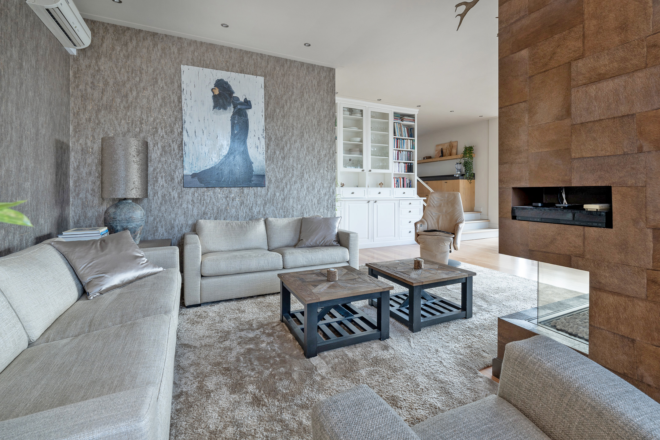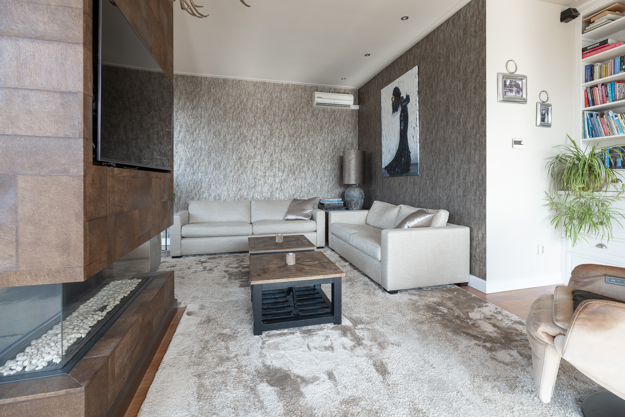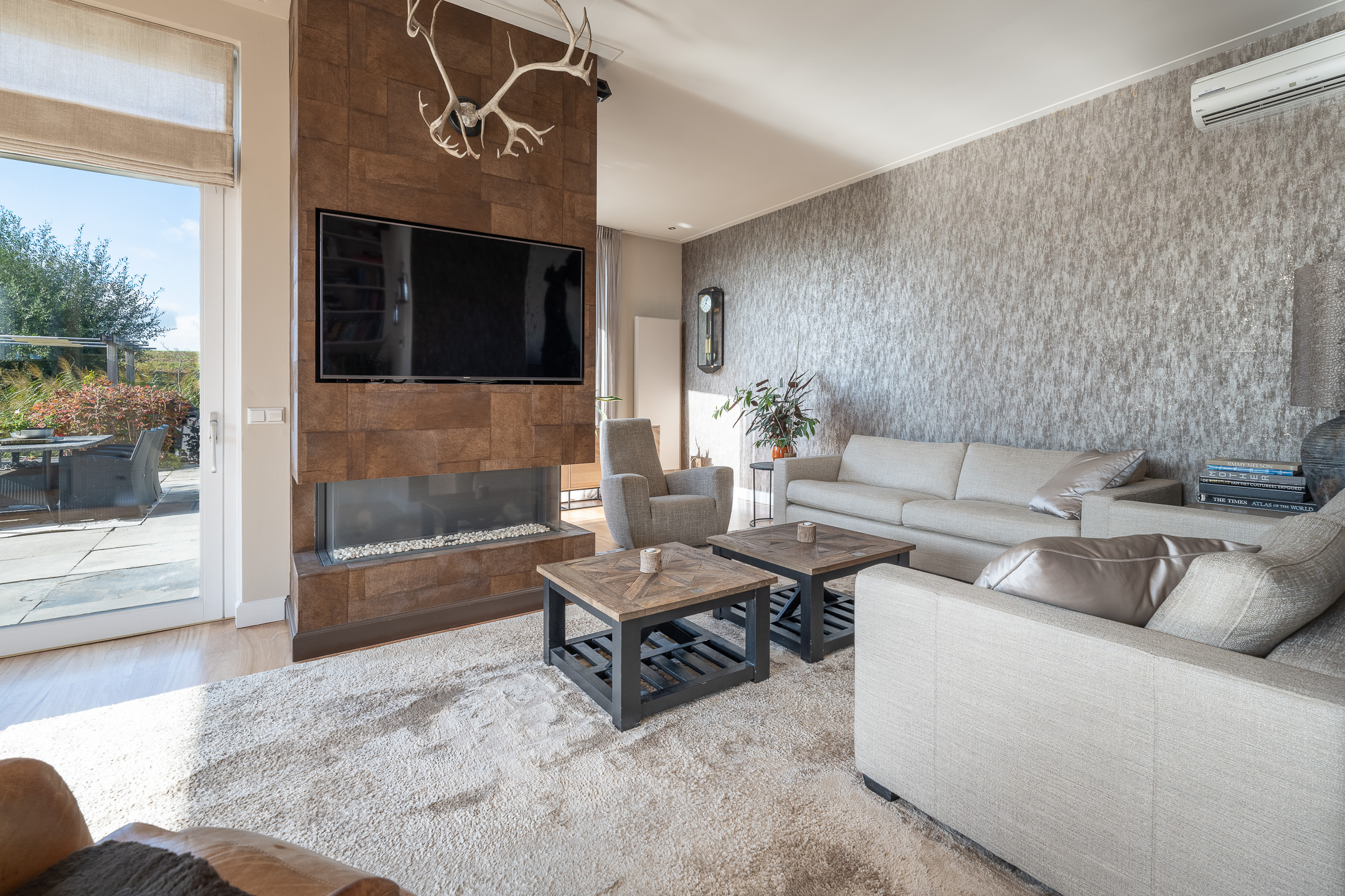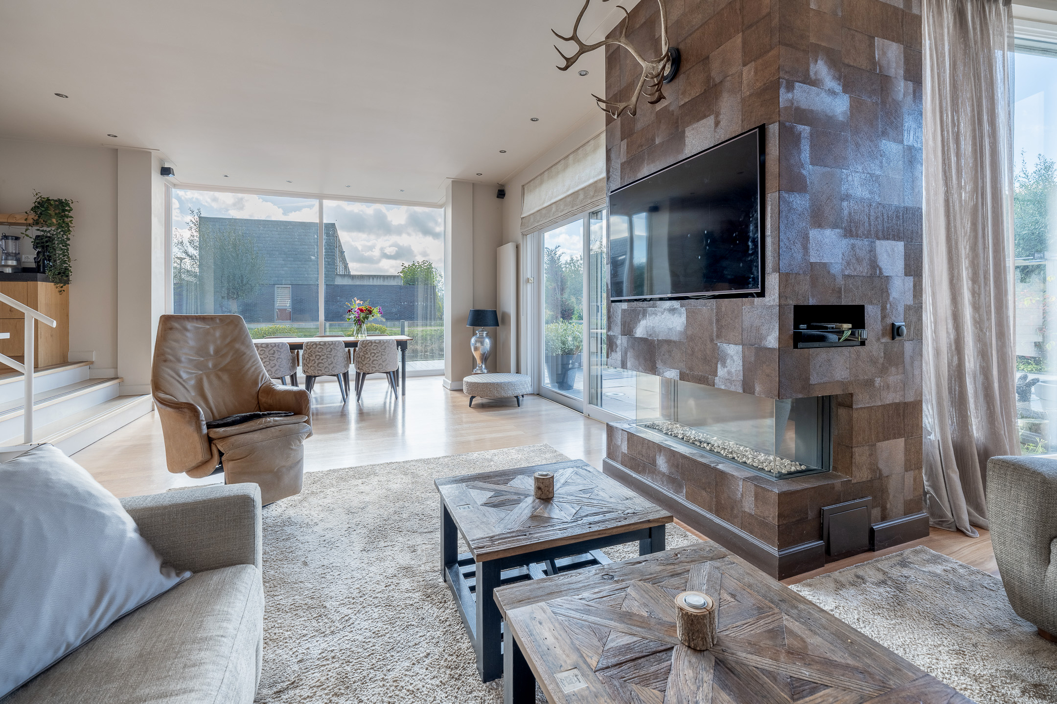 De woonkamer beschikt over een gashaard, grote, op maat gemaakte (boeken)kast en elektrische screens.