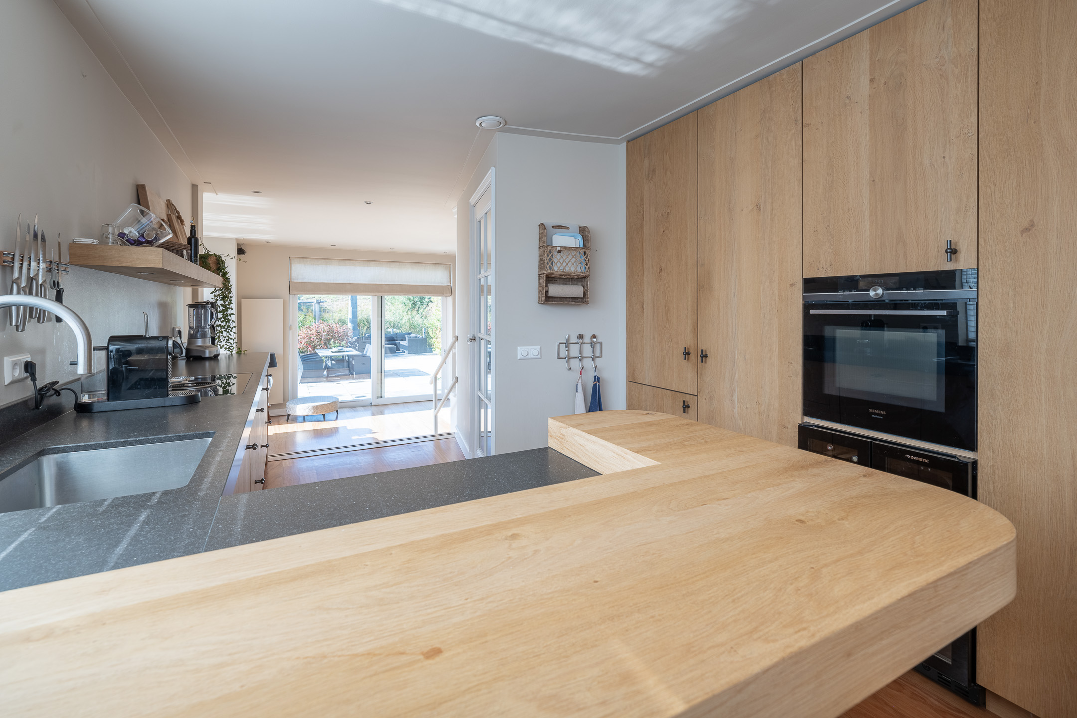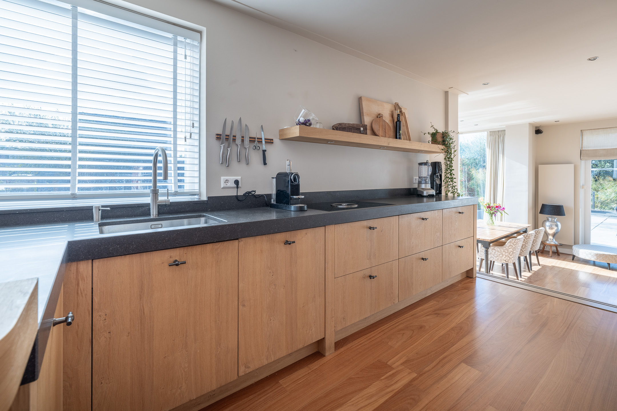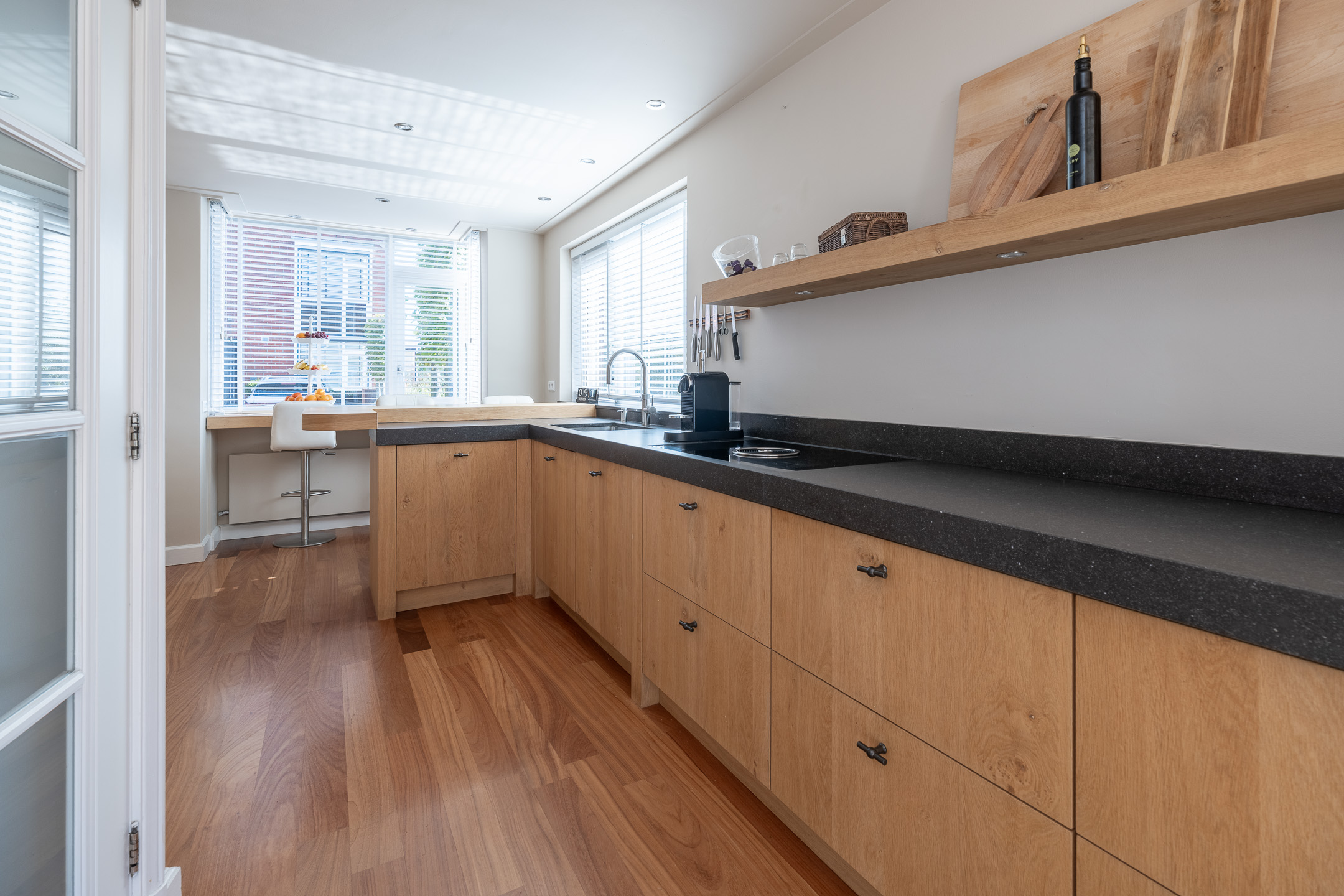 De handgemaakte eiken keuken (2019) ligt aan de voorzijde en is een droom voor kookliefhebbers. Met een composiet werkblad, Bora inductiekookplaat met geïntegreerde afzuiging, 7-liter Quooker, wijnkoelkast, vaatwasser, combi-oven/magnetron en koel-vriescombinatie is alles aanwezig. De eetbar en dimbare verlichting zorgen voor sfeer en gezelligheid.