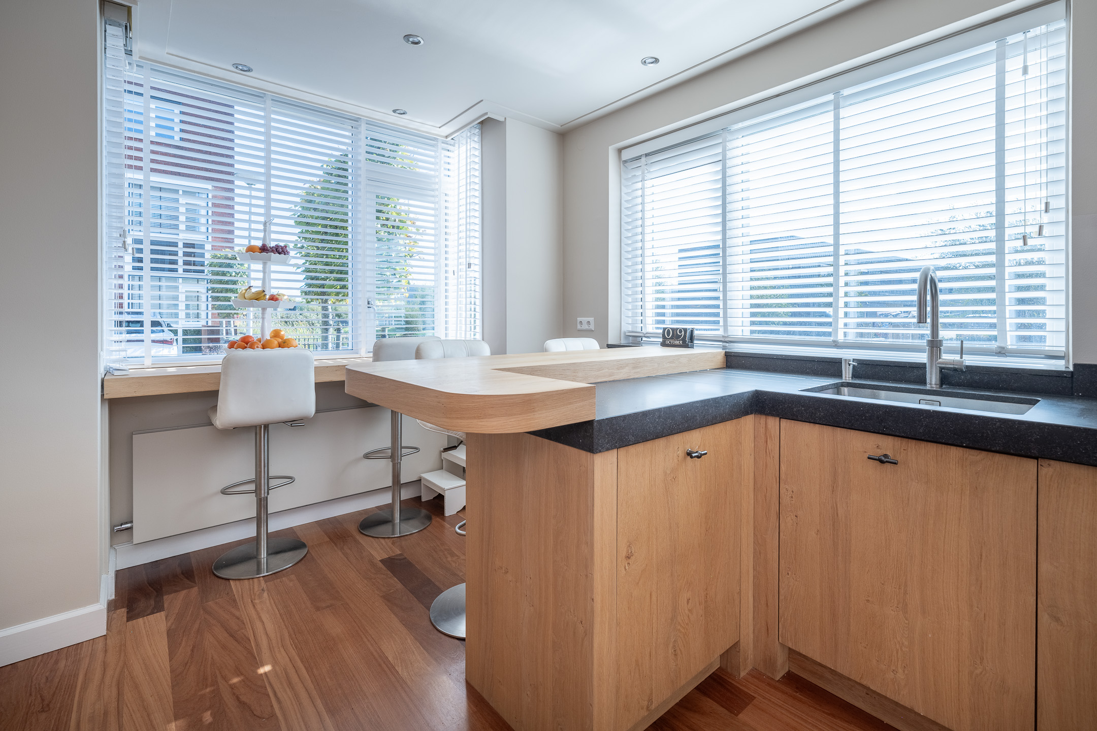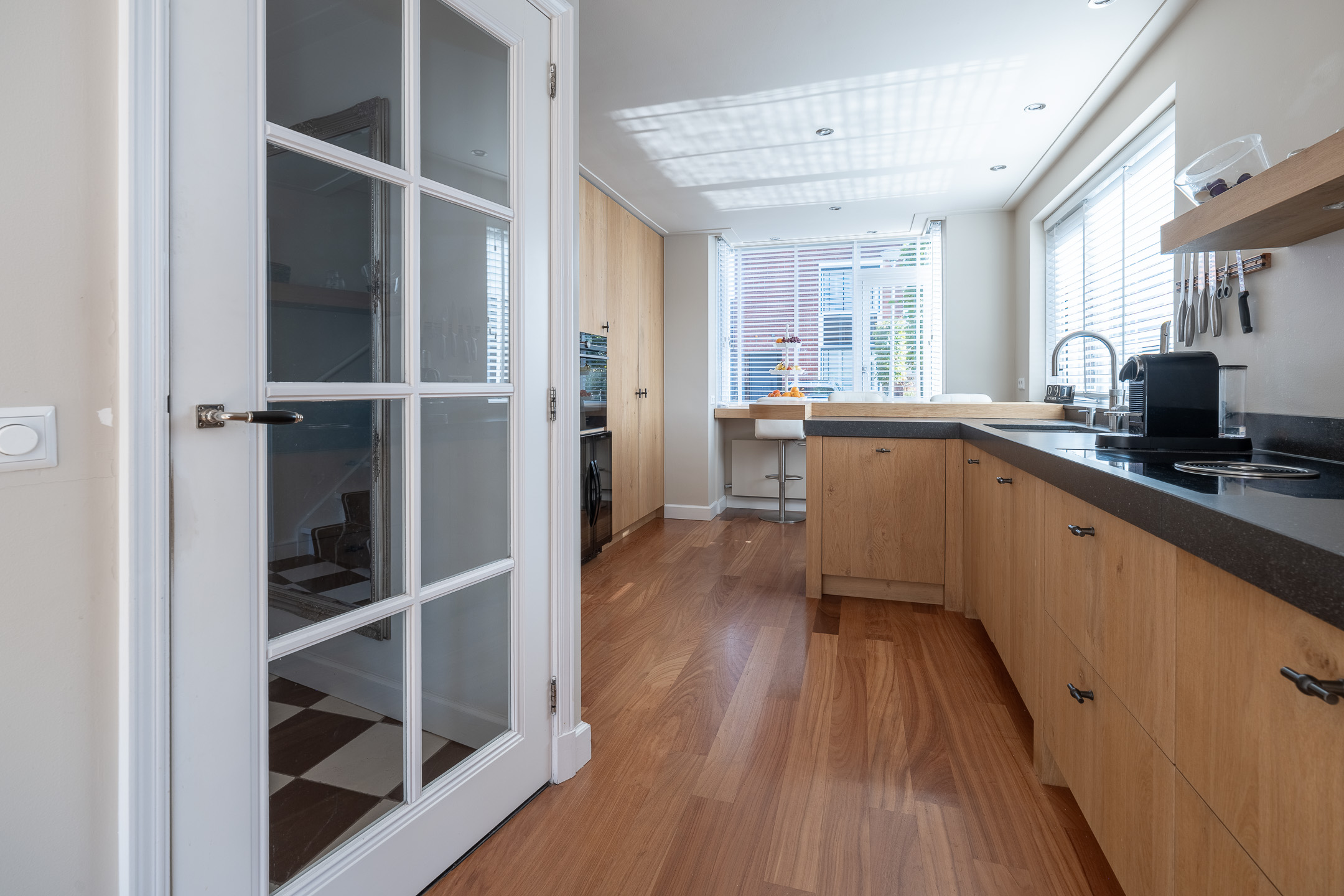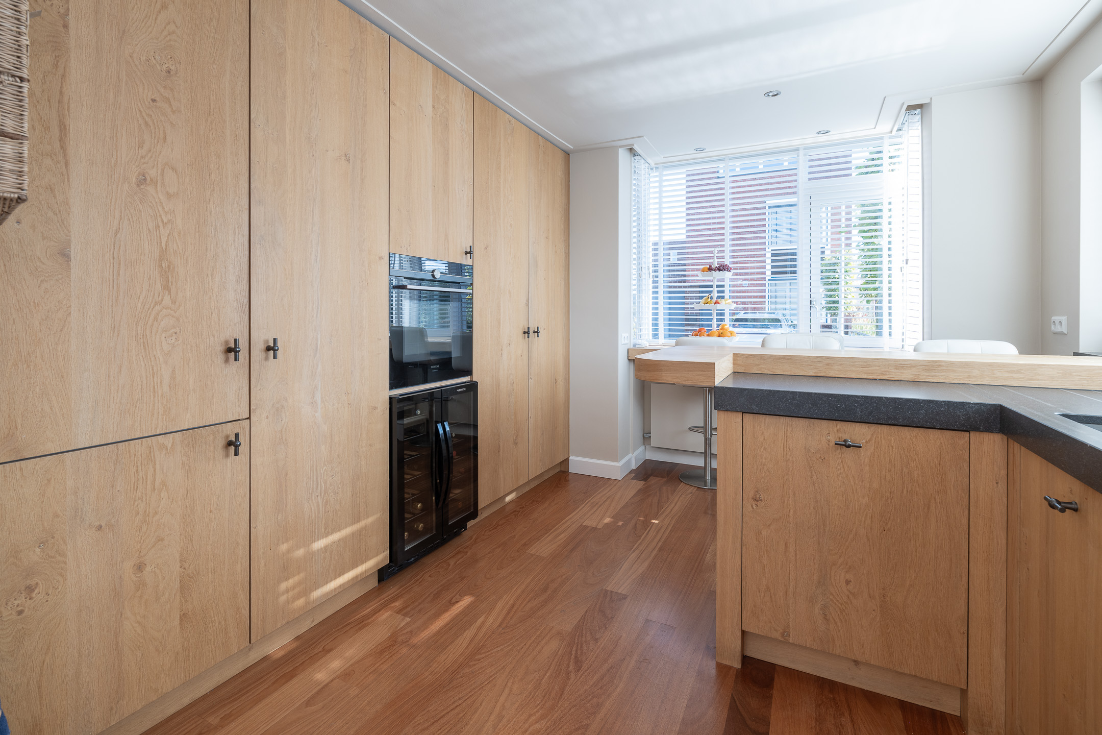 De handgemaakte eiken keuken (2019) ligt aan de voorzijde en is een droom voor kookliefhebbers. Met een composiet werkblad, Bora inductiekookplaat met geïntegreerde afzuiging, 7-liter Quooker, wijnkoelkast, vaatwasser, combi-oven/magnetron en koel-vriescombinatie is alles aanwezig. De eetbar en dimbare verlichting zorgen voor sfeer en gezelligheid.