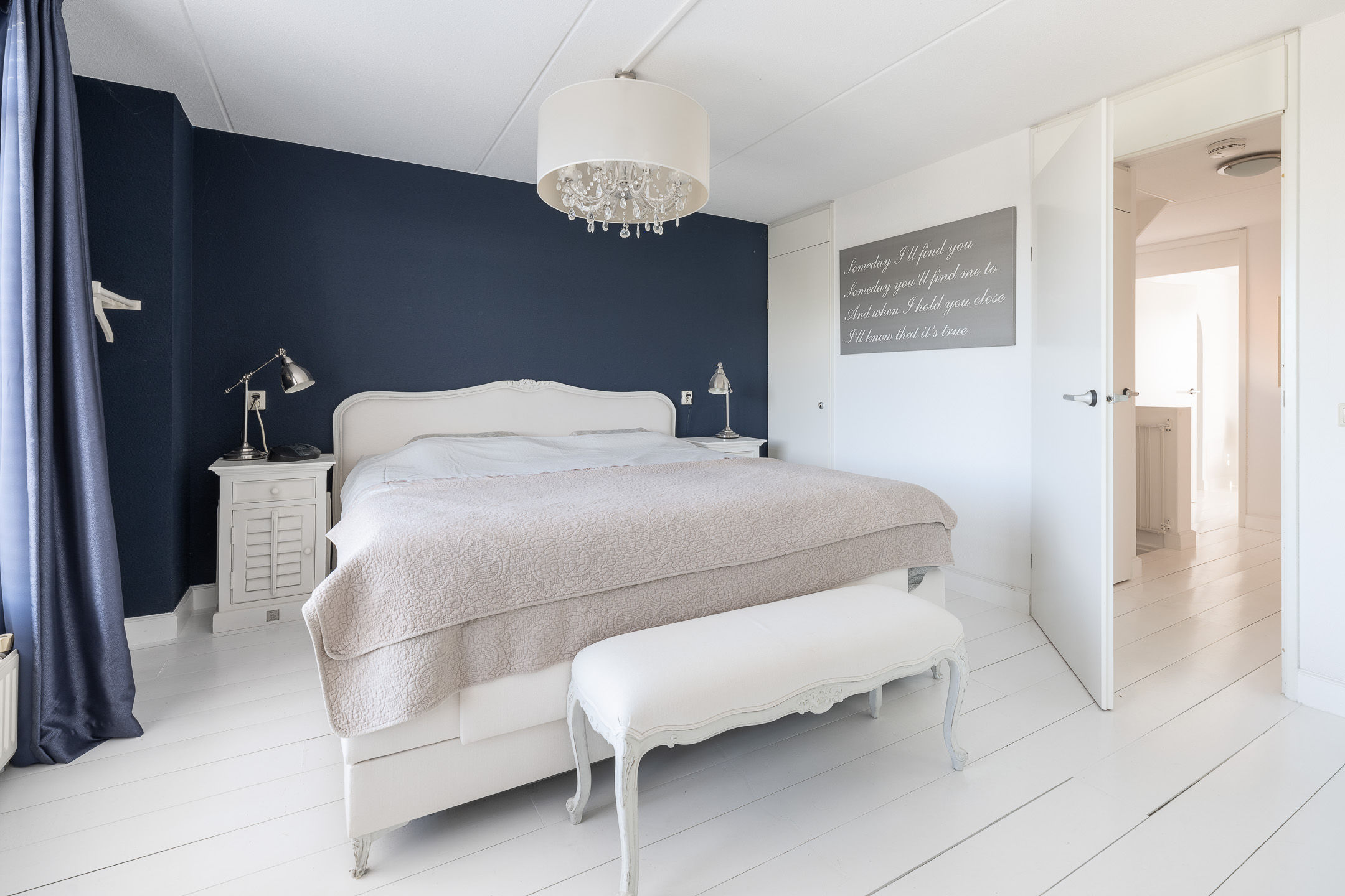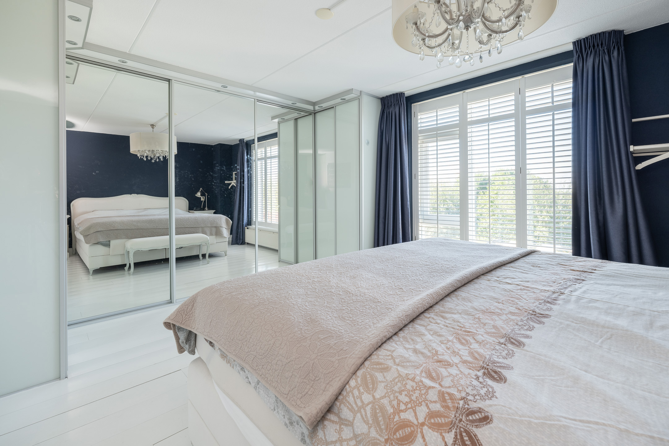 De hoofdslaapkamer aan de achterzijde is een heerlijke, lichte ruimte met shutters, elektrische rolluiken, grote kastenwand en een prachtig vrij uitzicht over het water en het groen – hier komt de ochtendzon zachtjes binnen en geniet je van een heerlijke rust.
