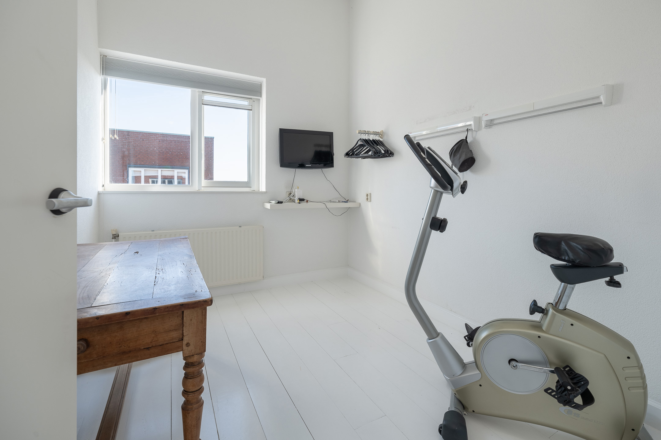 De achterste slaapkamer heeft een slaapvide en breed uitzicht op het water en de groene singel – een heerlijk lichte kamer met karakter.