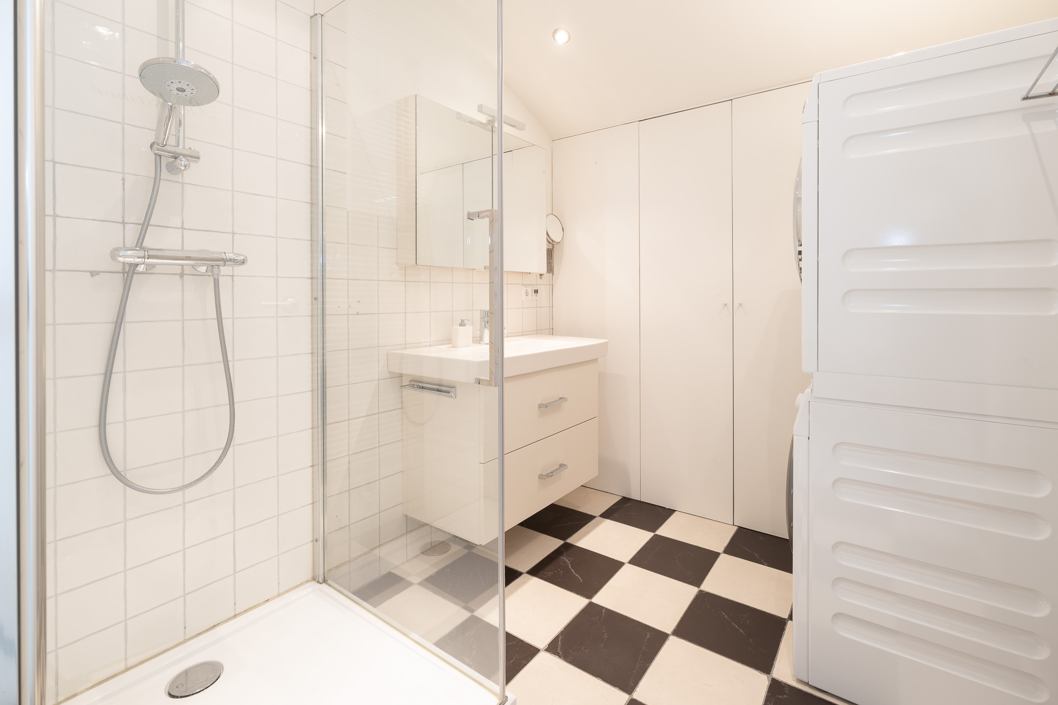 De tweede badkamer beschikt over een douche en modern wastafelmeubel.