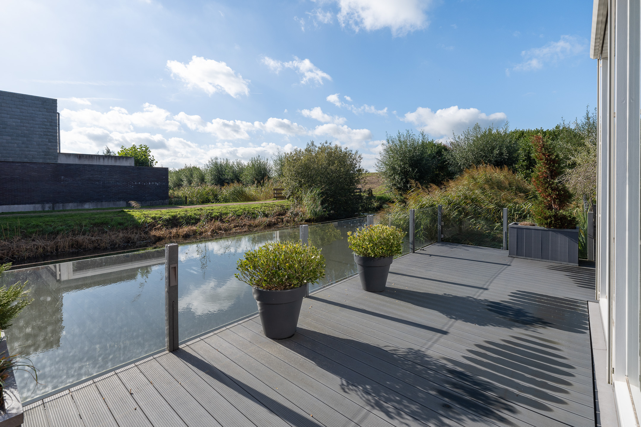 Het uitzicht door deze hoge ramen is werkelijk uniek: de tuin, de brede vlonder, het kabbelende water en het weelderige groen vormen één rustgevend panorama.