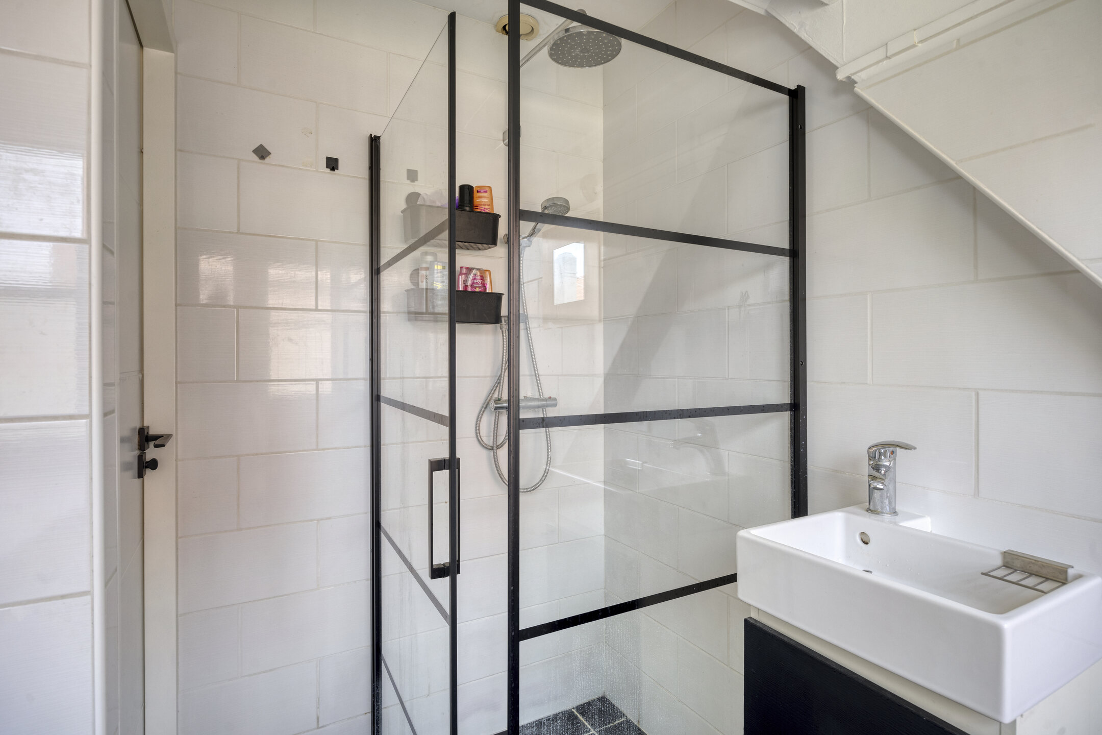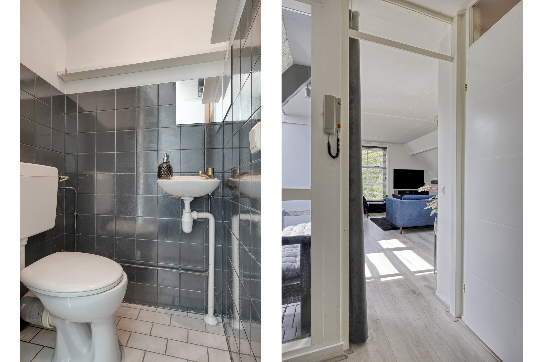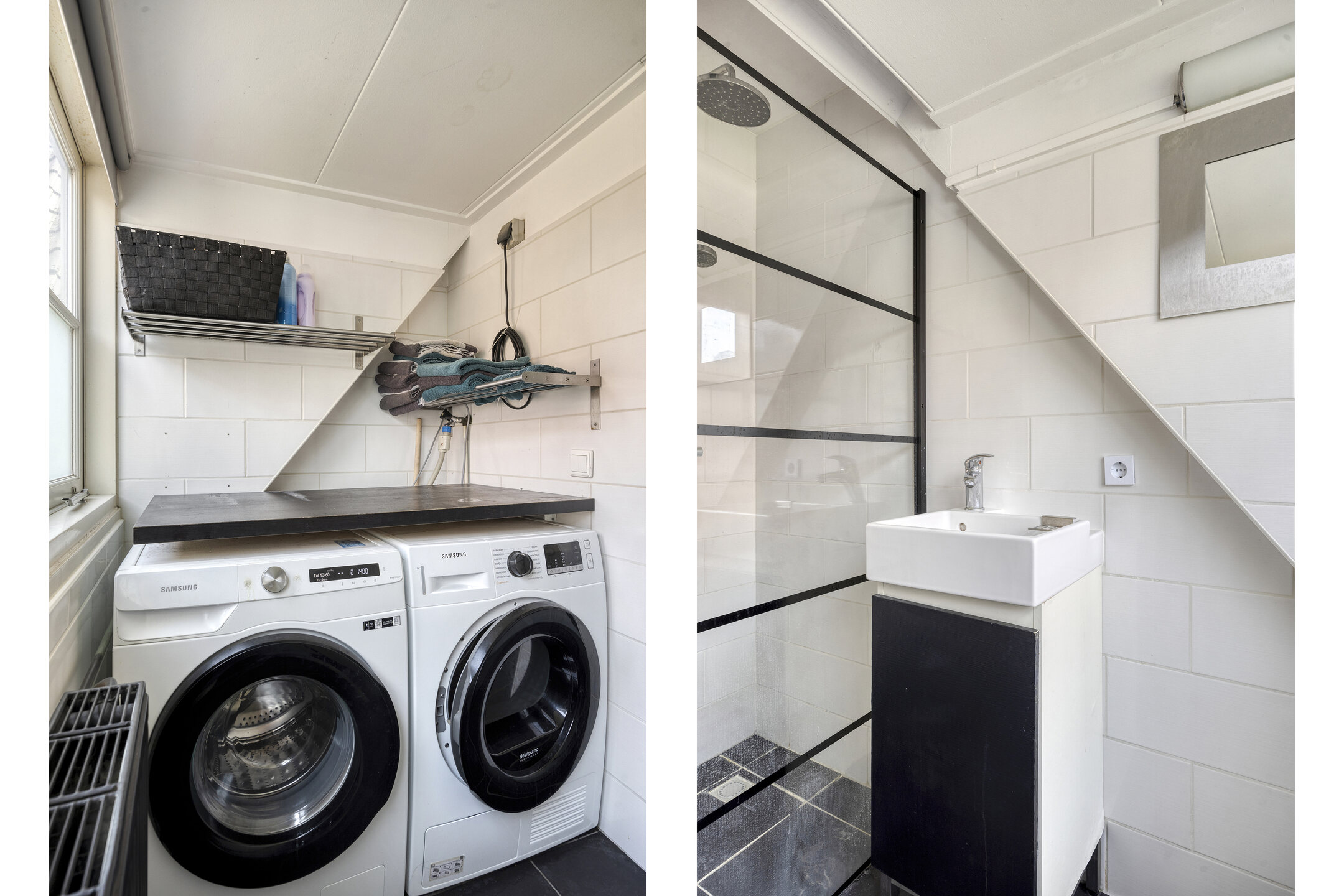 Binnenkomst in een halletje met toilet en toegang tot de badkamer. Deze is praktisch ingedeeld met inloopdouche, wastafel met bergmeubel en de aansluiting voor de wasmachine en droger.