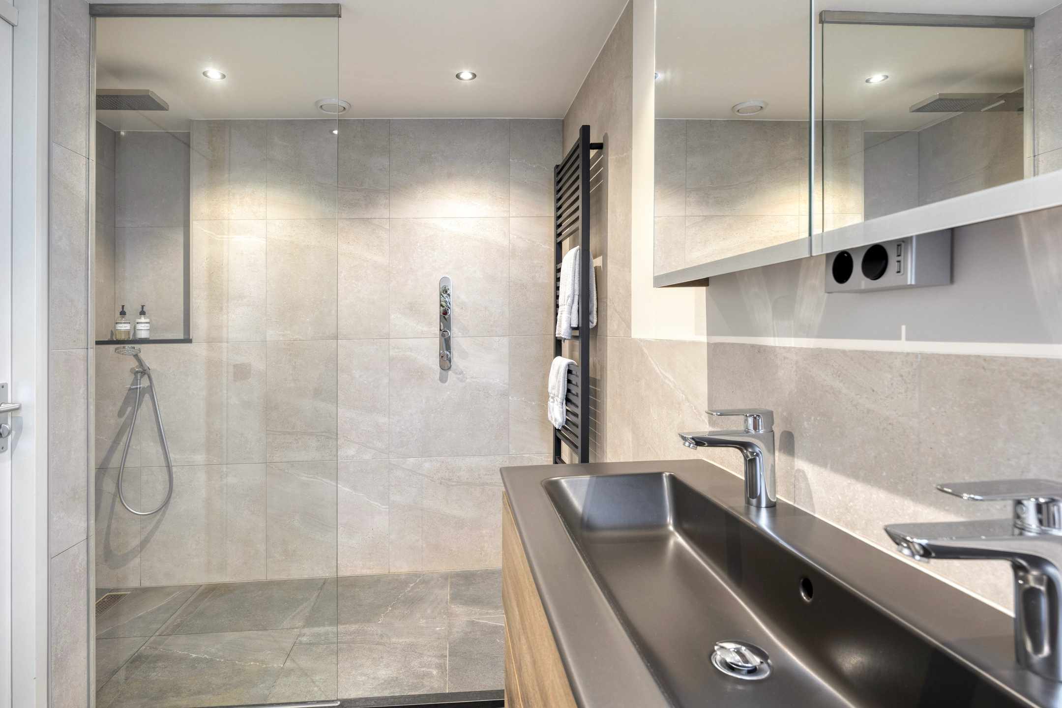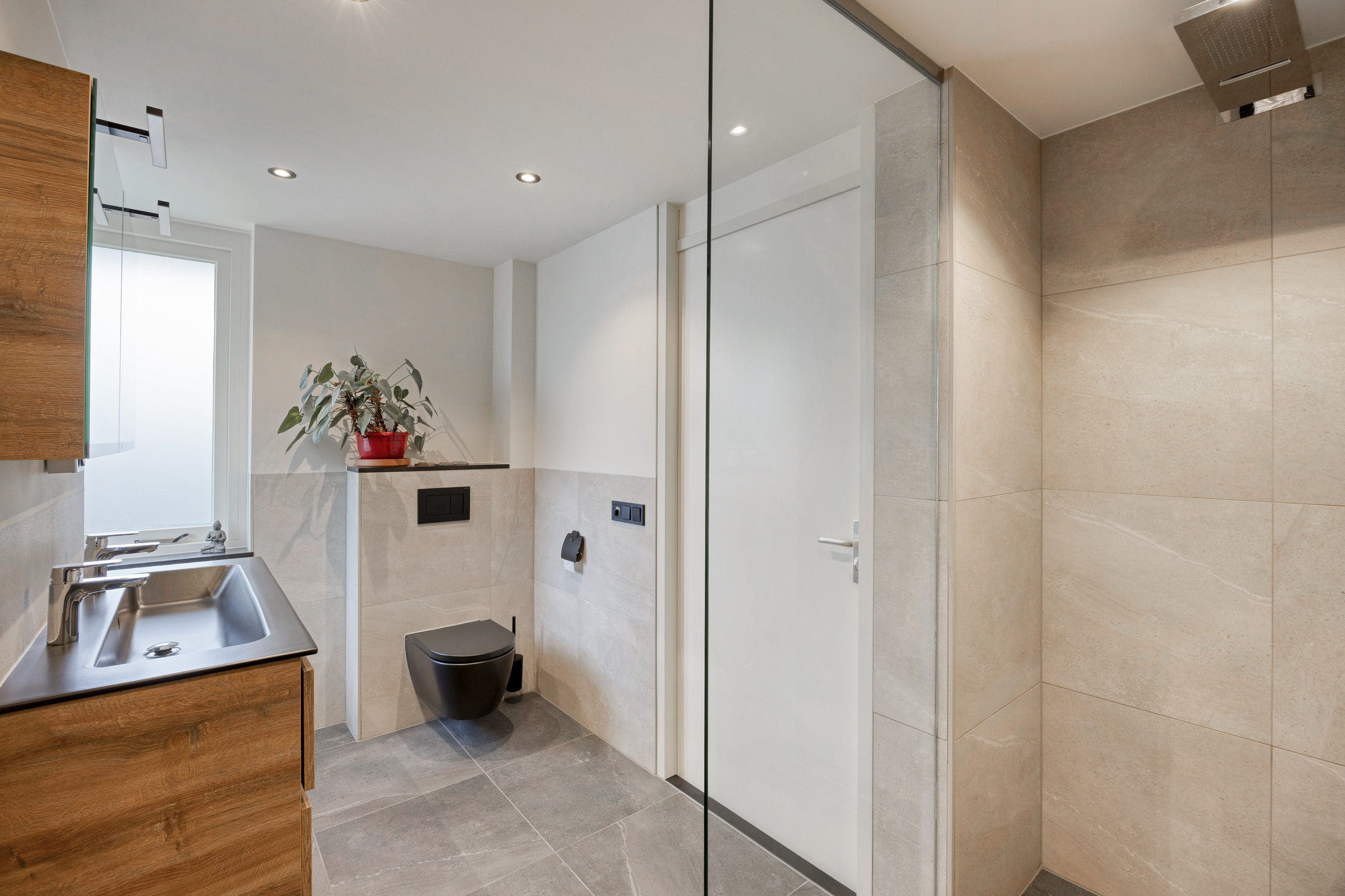 De luxe badkamer (2024) is met veel zorg en oog voor detail afgewerkt. De vloer is voorzien van leidingen voor verwarming en er is een brede inloopdouche, een dubbele wastafel met modern meubel, een tweede toilet, mechanische ventilatie en sfeervolle inbouwspots. Dit is een plek waar je je dag heerlijk kunt beginnen en ontspannen kunt eindigen.