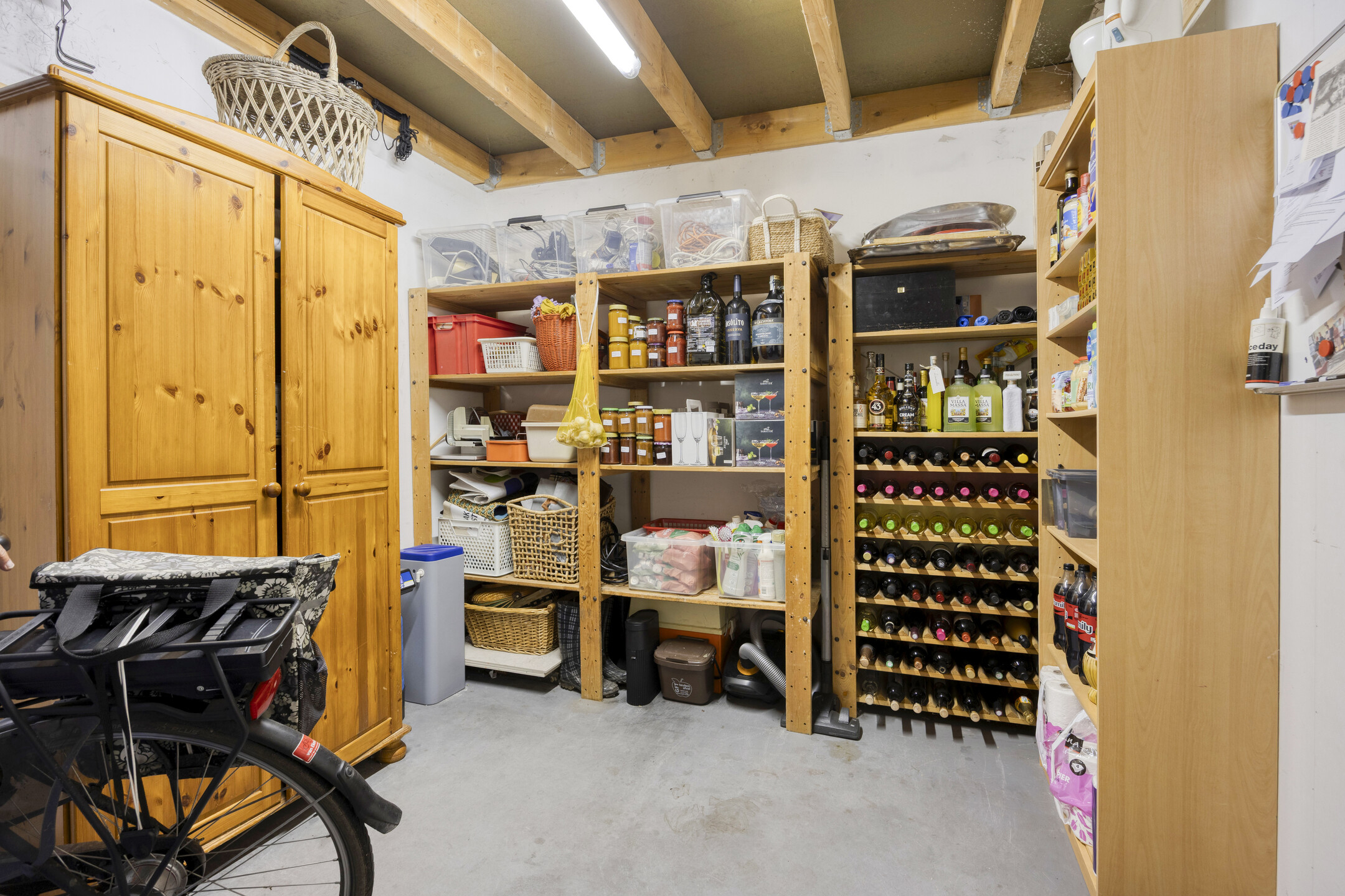 De voormalige garage is omgetoverd tot een praktische en zeer ruime berging. Vanuit de berging is er ook toegang tot de serre, wat zorgt voor een flexibele en verrassend praktische indeling.