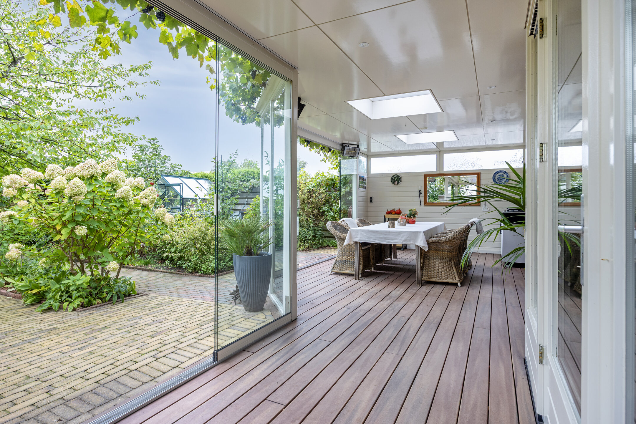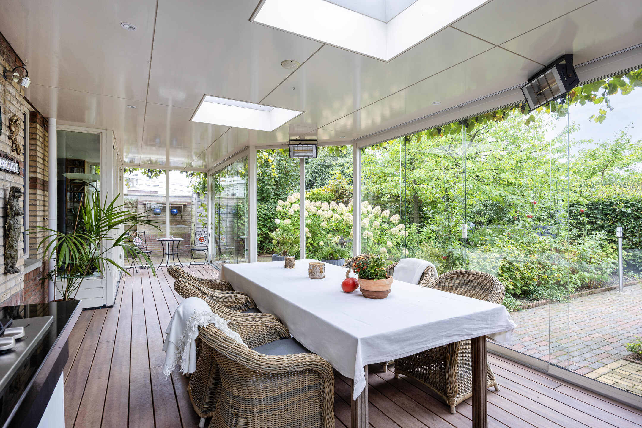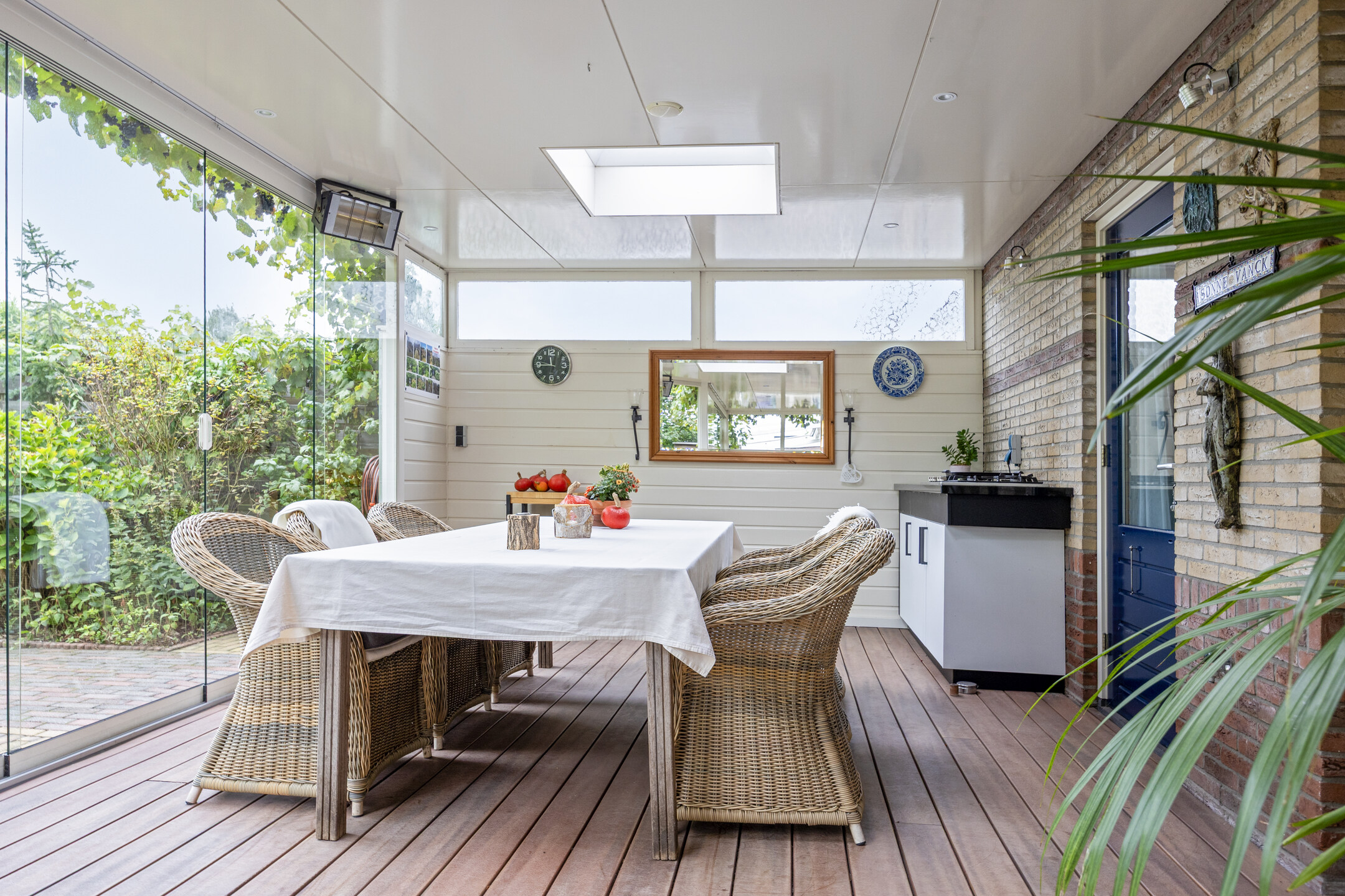 De serre (ca. 28 m2) is zonder twijfel één van de meest bijzondere plekken van deze woning. Met een composiet vloer, twee lichtkoepels, geïntegreerde spots, twee infraroodkachels en een buitenkeuken met 5-pits gaskookplaat kun je hier het hele jaar door heerlijk vertoeven. Of het nu gaat om een zwoele zomeravond met vrienden, een knusse winterborrel of een rustig moment met een boek en een kop thee — deze ruimte past zich moeiteloos aan elk seizoen aan.