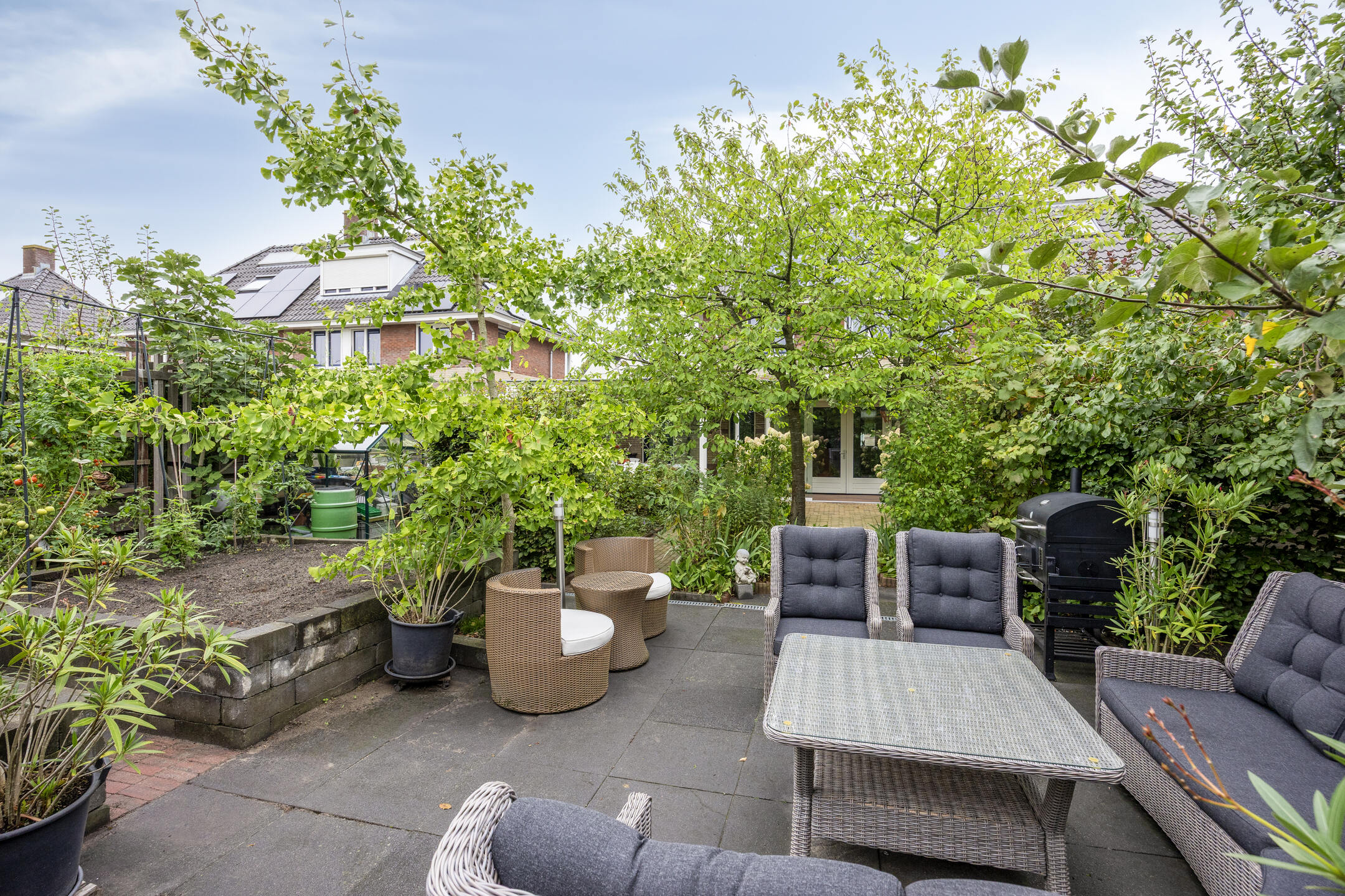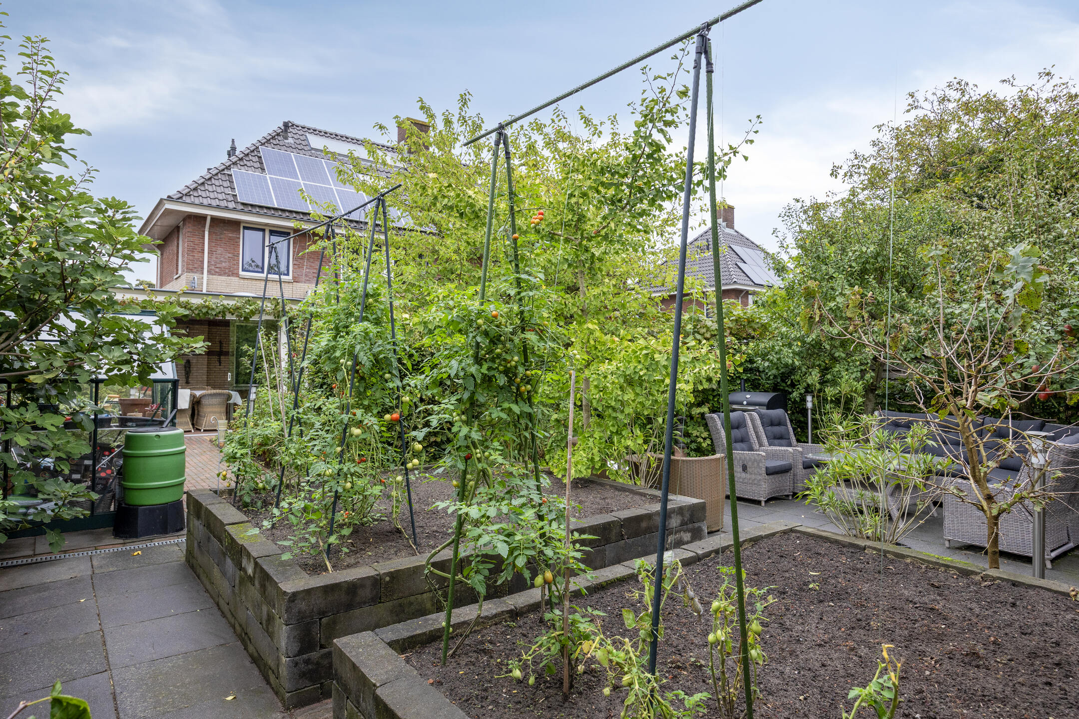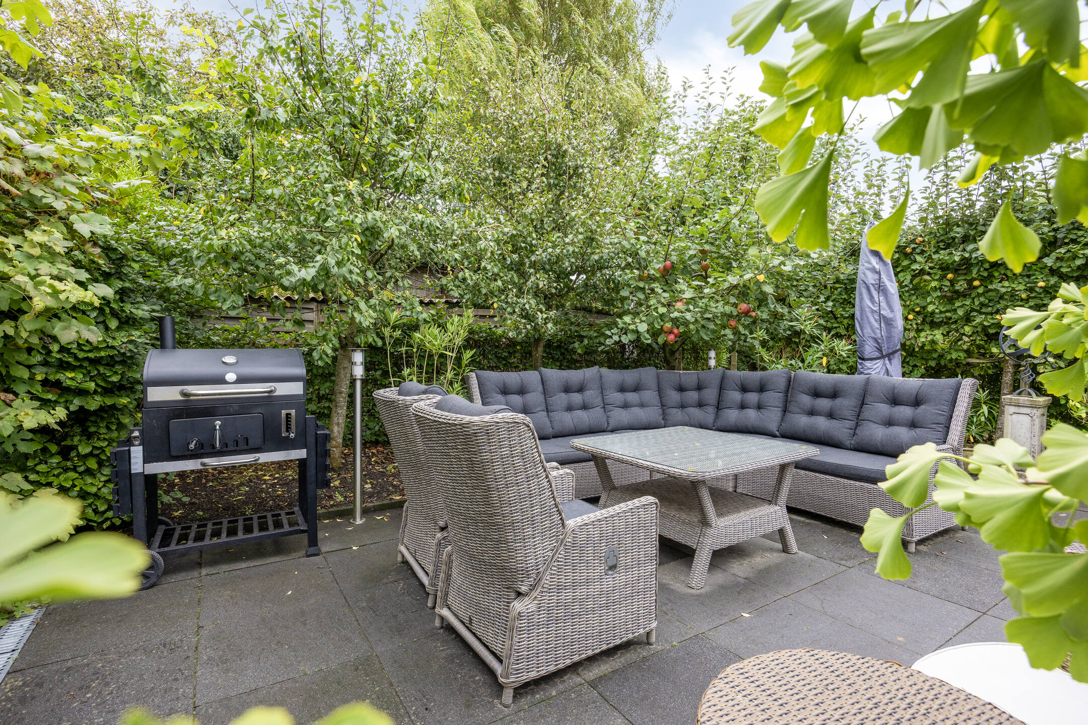 De tuin ligt op het zuidwesten, waardoor je van ’s ochtends tot laat in de avond kunt genieten van de zon. Dankzij slimme drainage, extra waterpunten, sfeervolle buitenverlichting en een doordachte indeling is de tuin niet alleen prachtig, maar ook onderhoudsvriendelijk. Er zijn verschillende terrassen met elk een uniek zicht op de tuin. Een plantenkas en regenton blijven achter, en voor liefhebbers van groen en zelfoogst is dit een paradijs: moestuinbakken, fruitbomen, notenbomen en kweeperen zorgen voor een rijke oogst en een levendige tuin.
