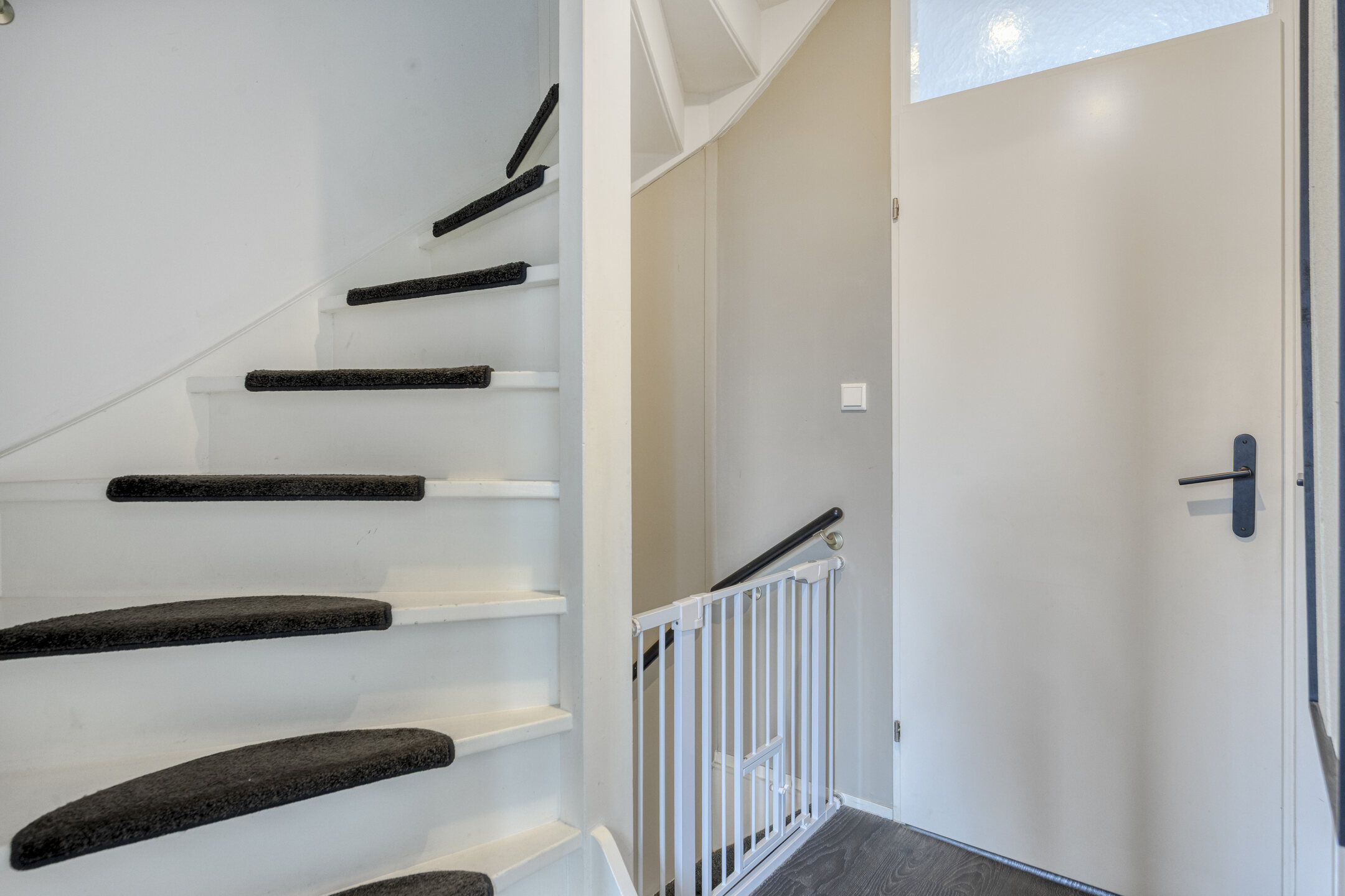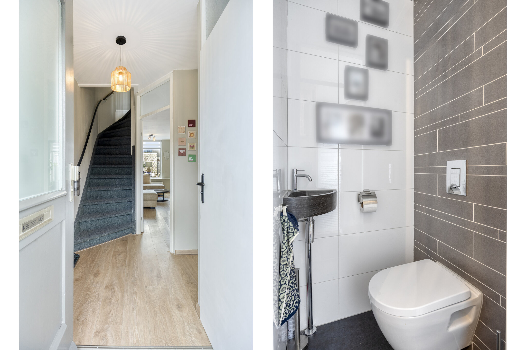 Entree met vernieuwde meterkast (met omvormer voor de zonnepanelen en aansluiting glasvezel), toilet met fontein, garderobekast en trapopgang. De begane grond is afgewerkt met een nette laminaatvloer.