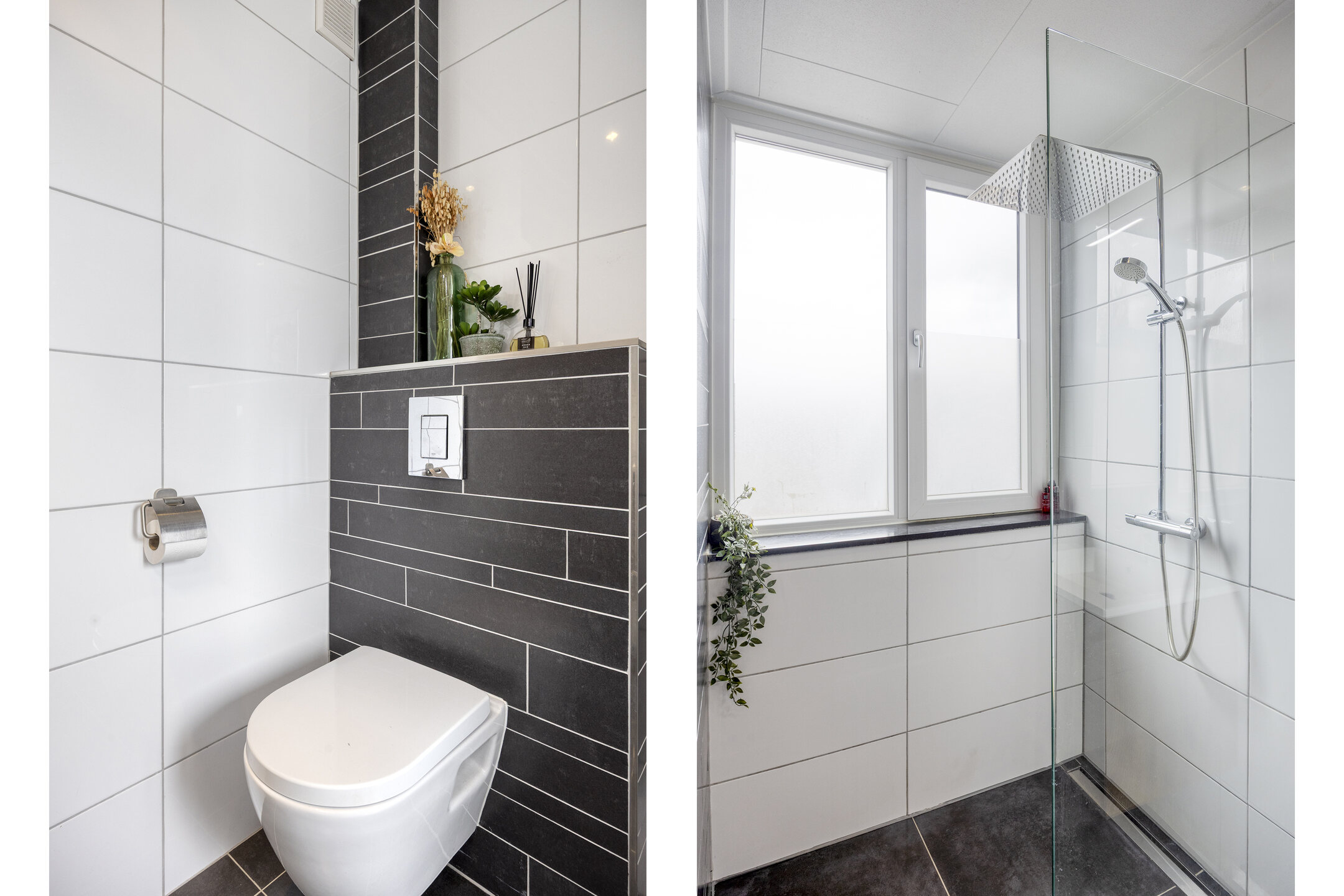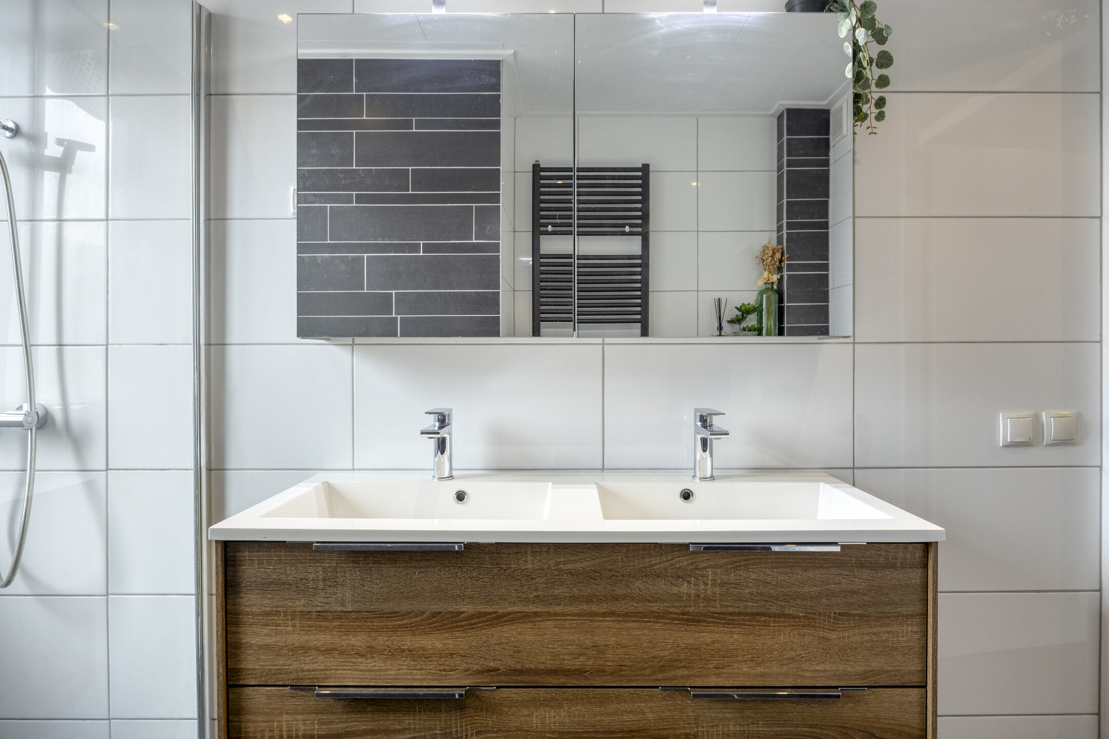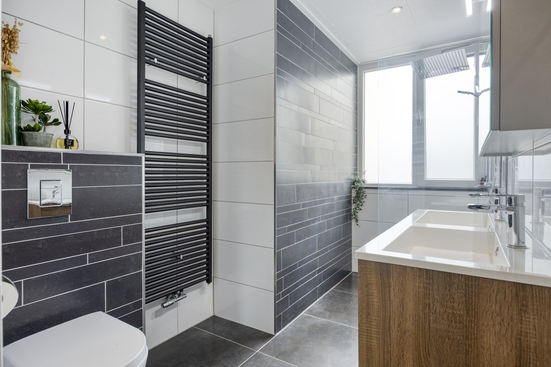 De moderne badkamer is compleet uitgevoerd met een inloopdouche, tweede toilet, dubbele wastafel met meubel, handdoekradiator en een spiegelkast met verlichting. Aan de achterzijde bevindt zich een brede dakkapel (kunststof, met horren), wat zorgt voor extra ruimte en licht.