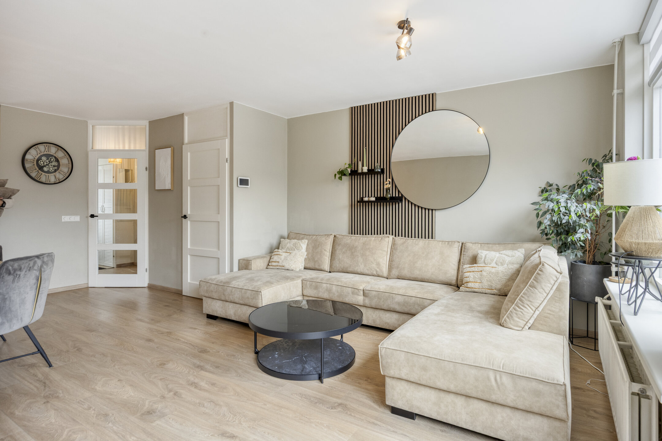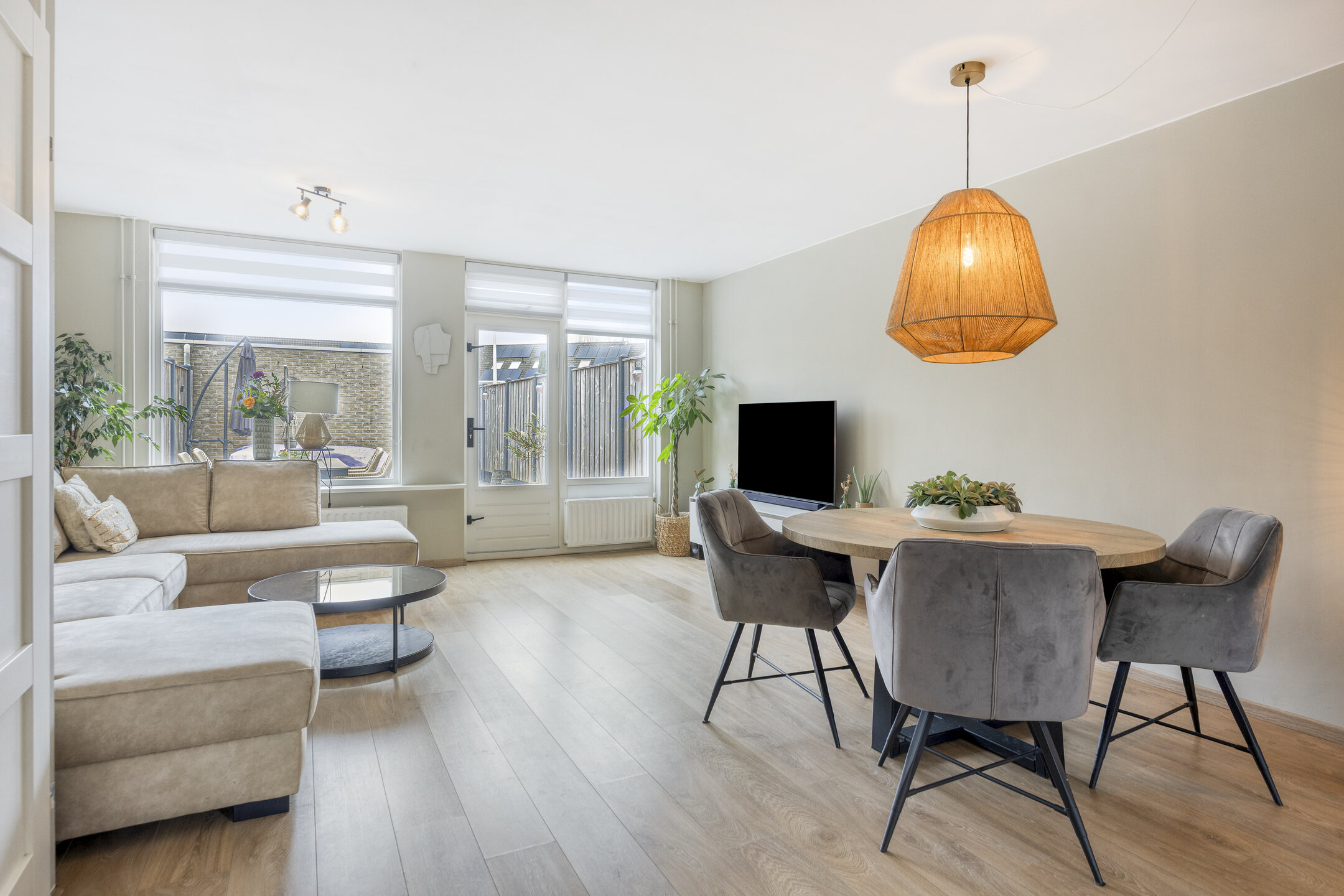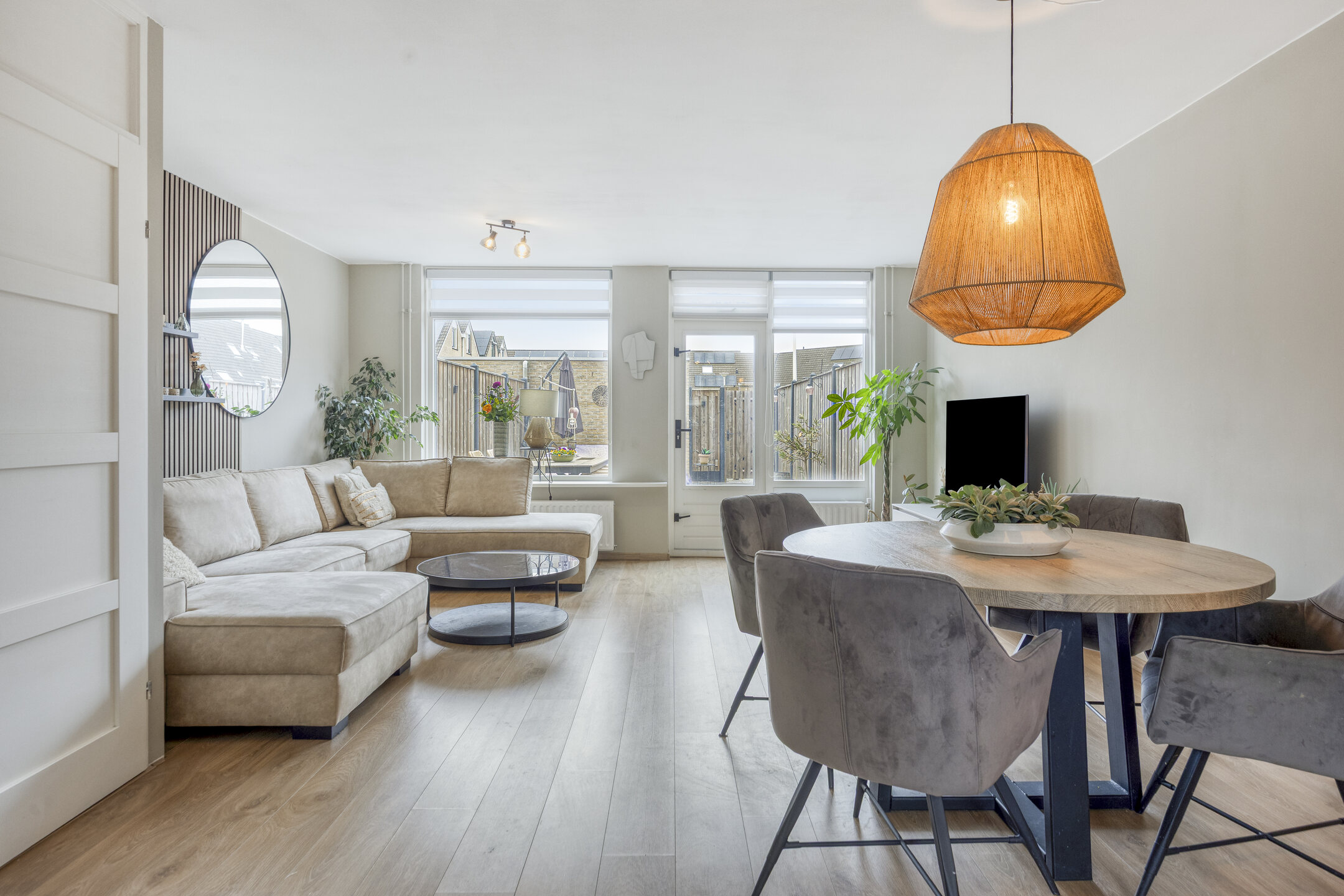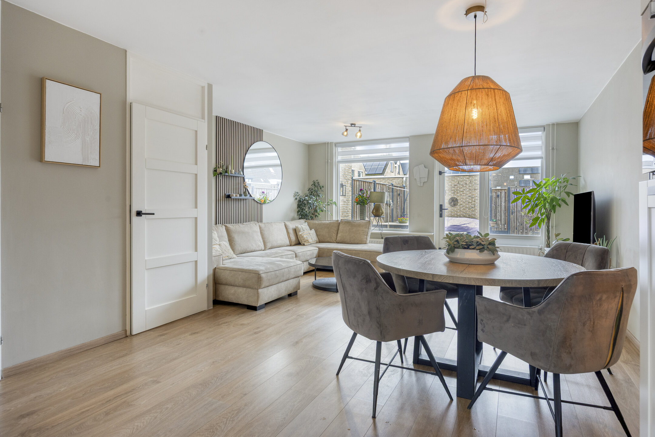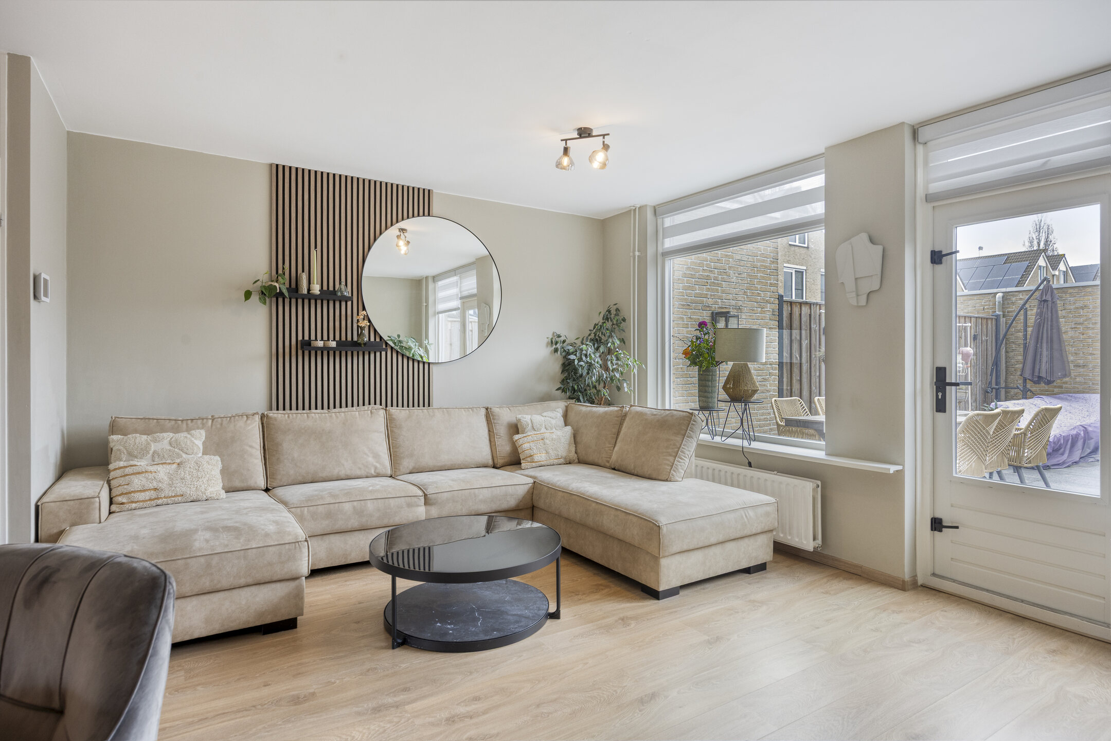Via de achterdeur bereik je de zonnige achtertuin.