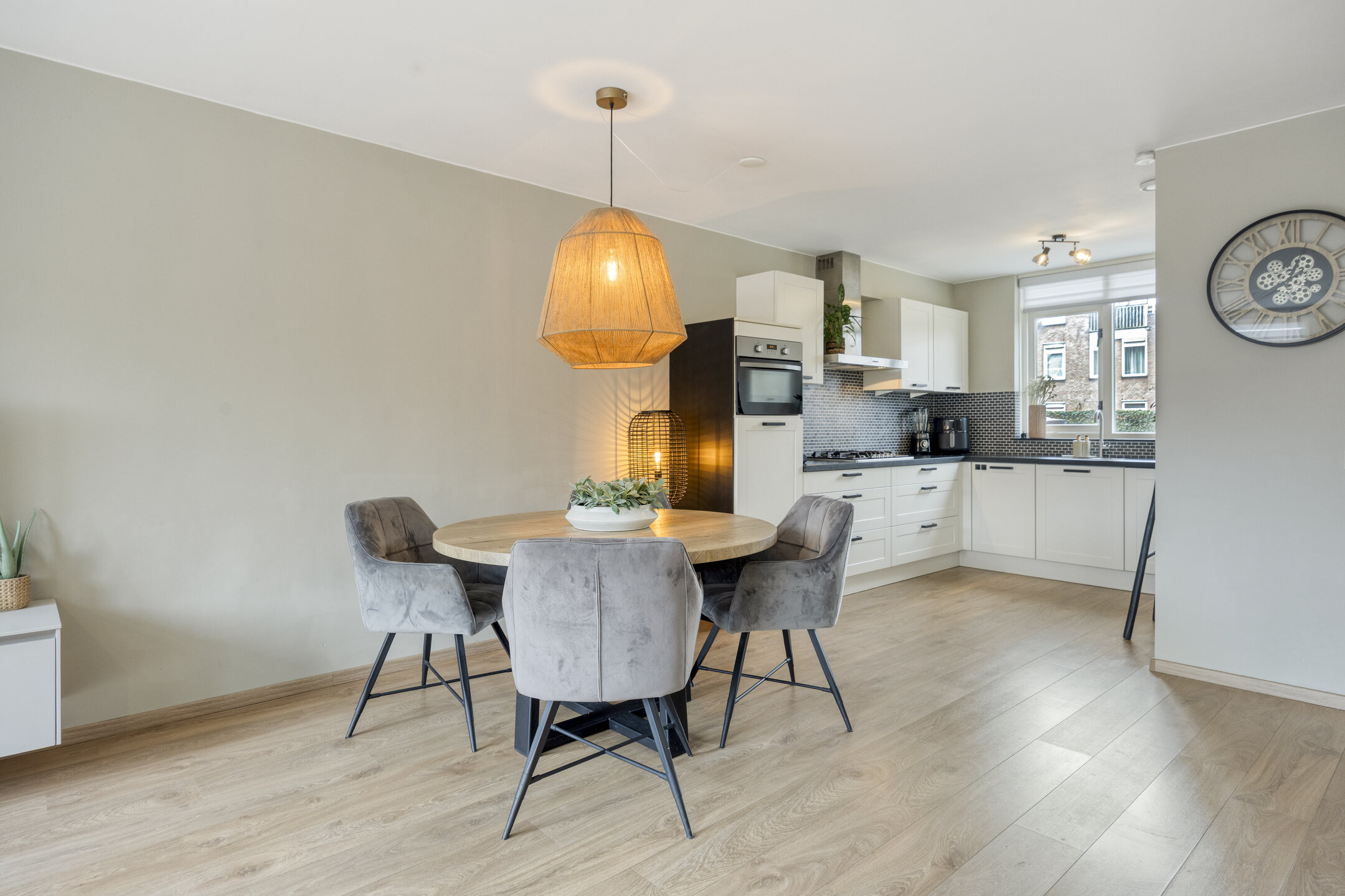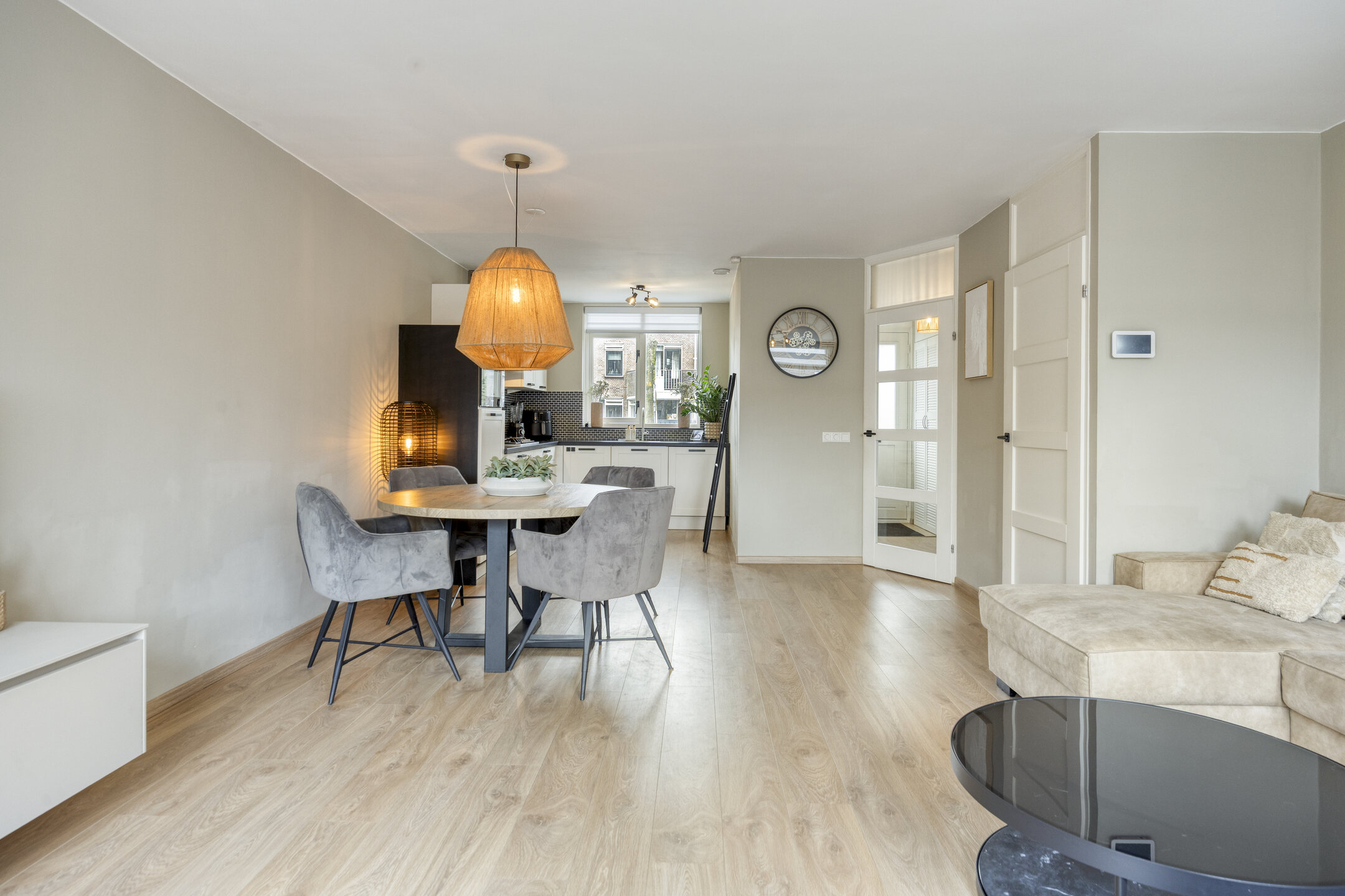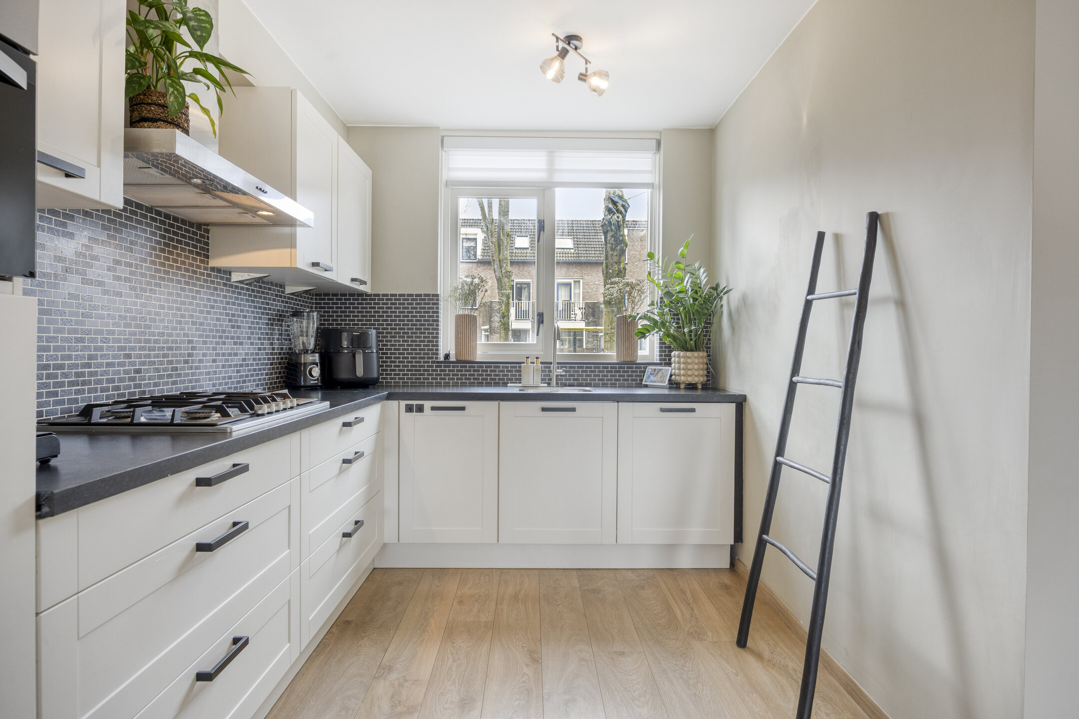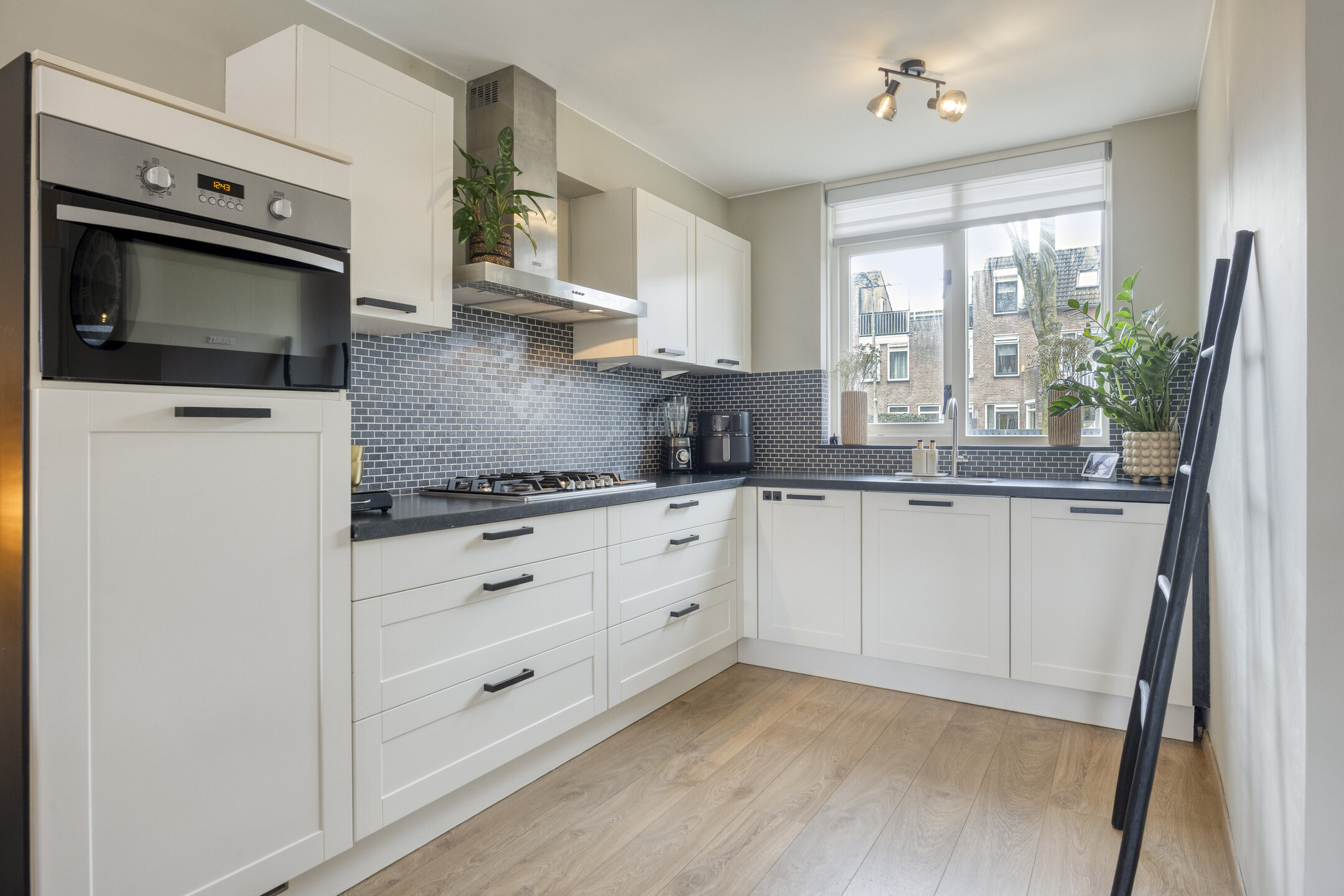 De tuingerichte woonkamer is licht en sfeervol en beschikt over een praktische trapkast. Aan de voorzijde bevindt zich de open keuken met een stijlvol granieten werkblad en dimbare verlichting. De keuken is compleet uitgerust met een 5-pits gaskookplaat, RVS afzuigkap, vaatwasser, koelkast en combi-oven/magnetron.