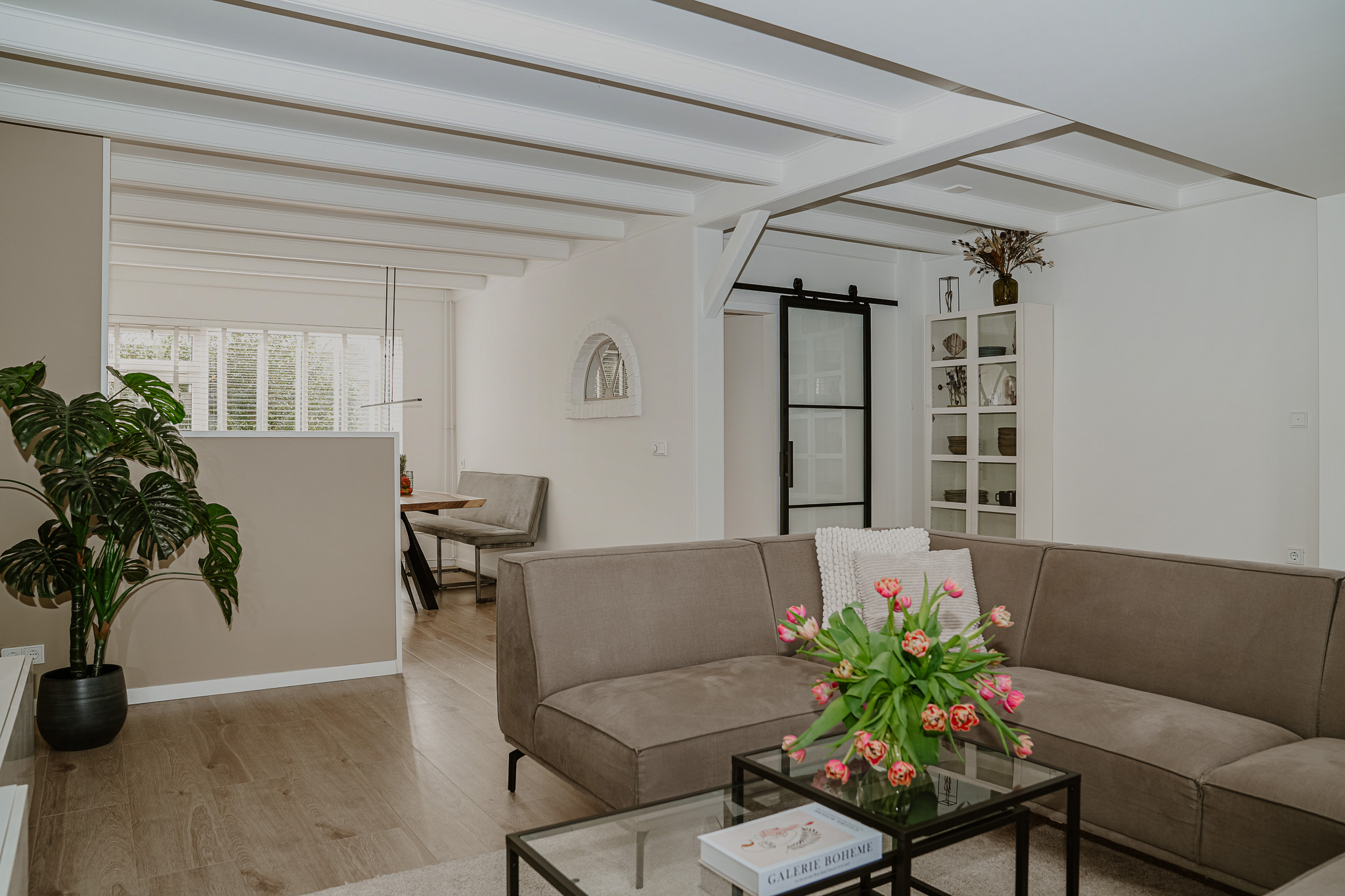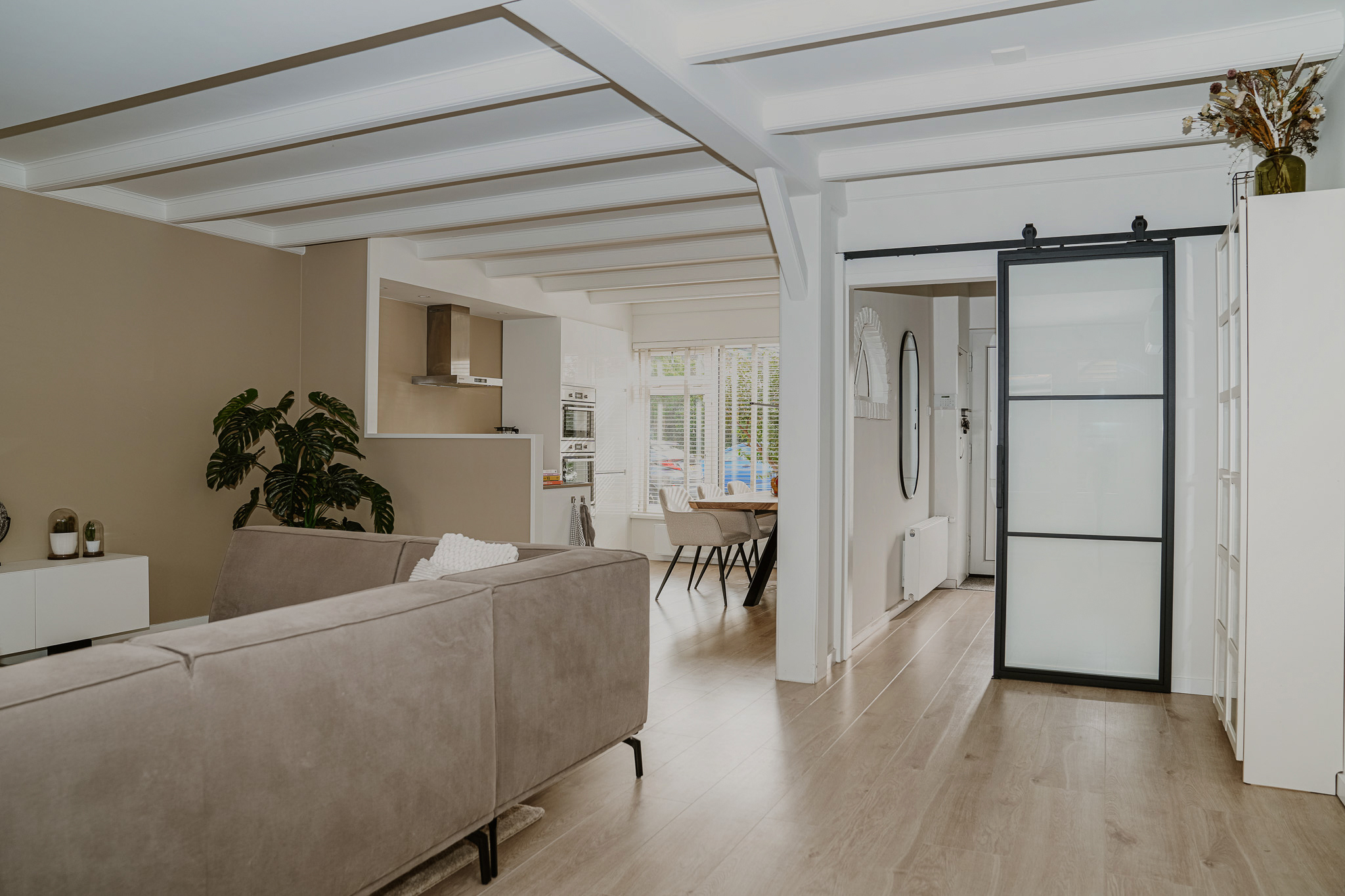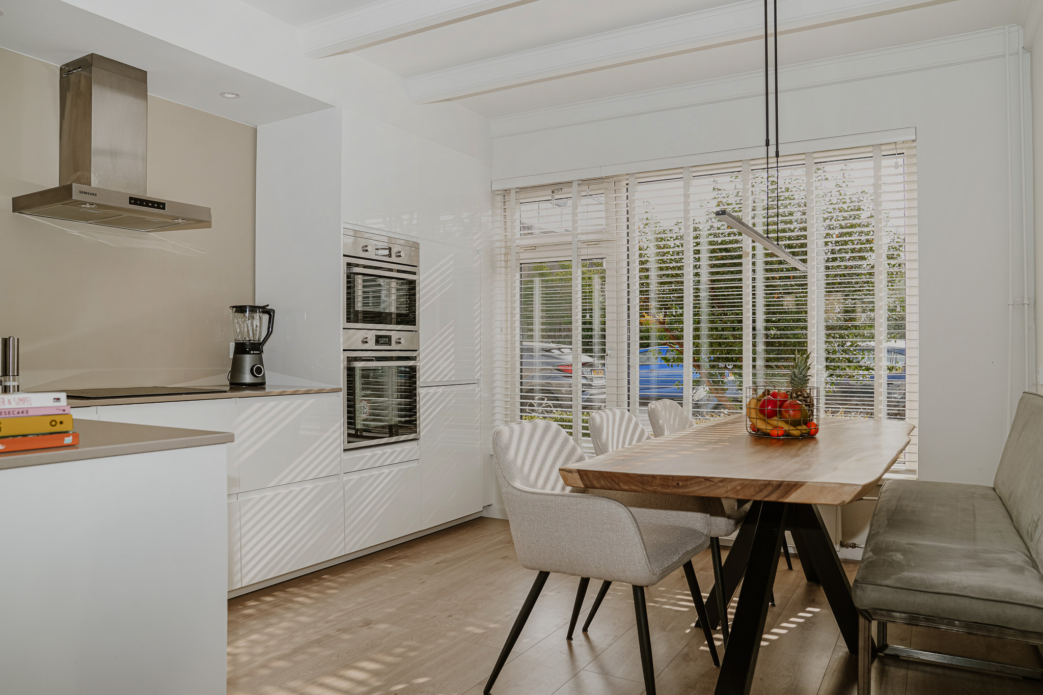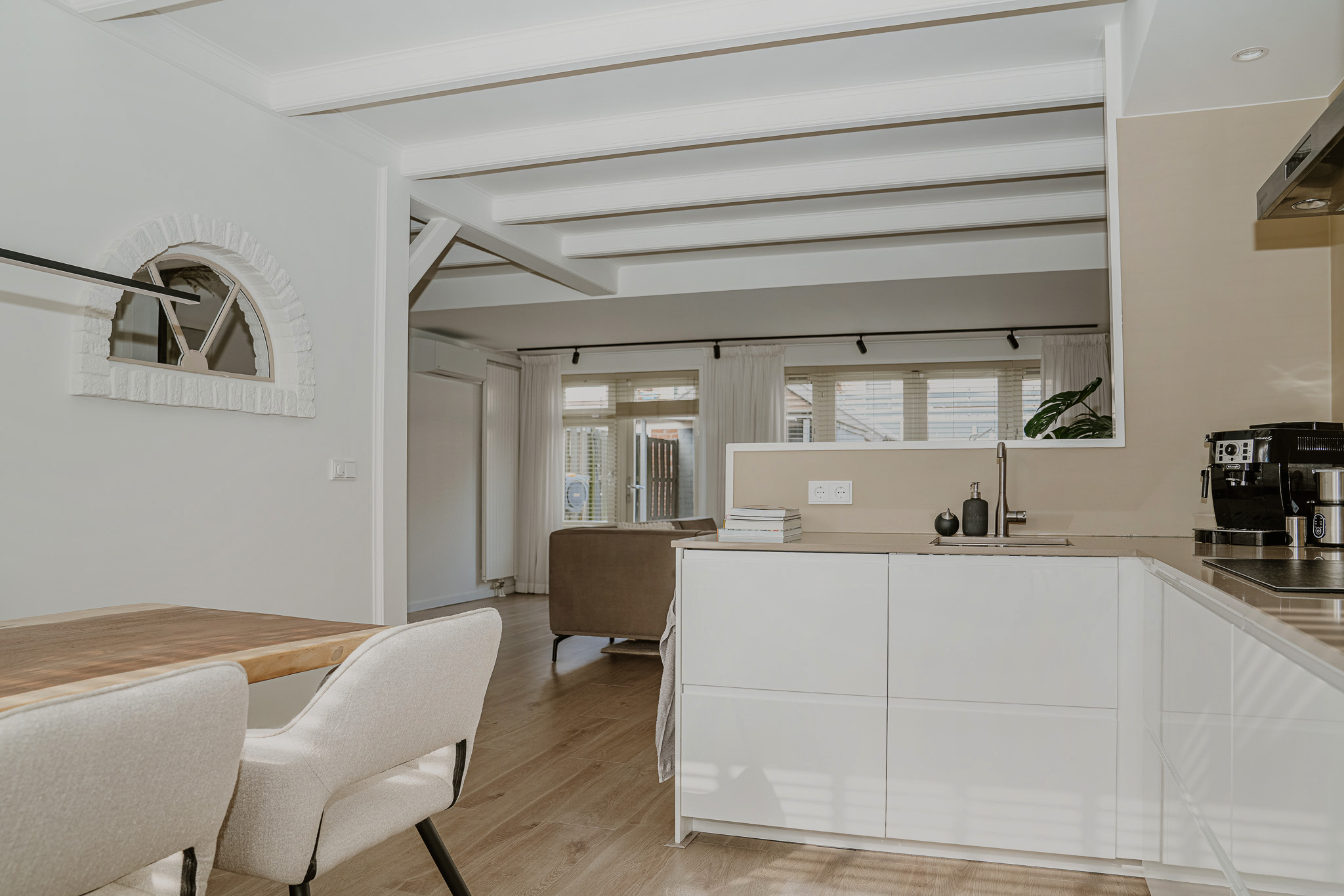 Entree met meterkast, vernieuwd toilet met fontein, trapopgang met trapkast en toegang tot de woonkamer met half-open keuken. De woonkamer is een heerlijke, lichte ruimte dankzij de grote ramen en de openslaande deuren naar de tuin. Hier geniet je het hele jaar door van comfort, mede dankzij de airconditioning (voor koelen en verwarmen). De strak gestuukte uitbouw met designradiatoren zorgt voor extra leefruimte en een luxe uitstraling. De keuken aan de voorzijde (2023) is een absolute blikvanger! Een moderne hoogglans witte keuken met een stijlvol composiet werkblad, topklasse inbouwapparatuur zoals een koel-vriescombinatie, combimagnetron, heteluchtoven, 4-pits inductiekookplaat met 6 flexzones en een rvs-afzuigkap. En er is hier voldoende ruimte voor een grote eettafel, een heerlijke plek voor vrienden en familie om gezellig te komen eten!
