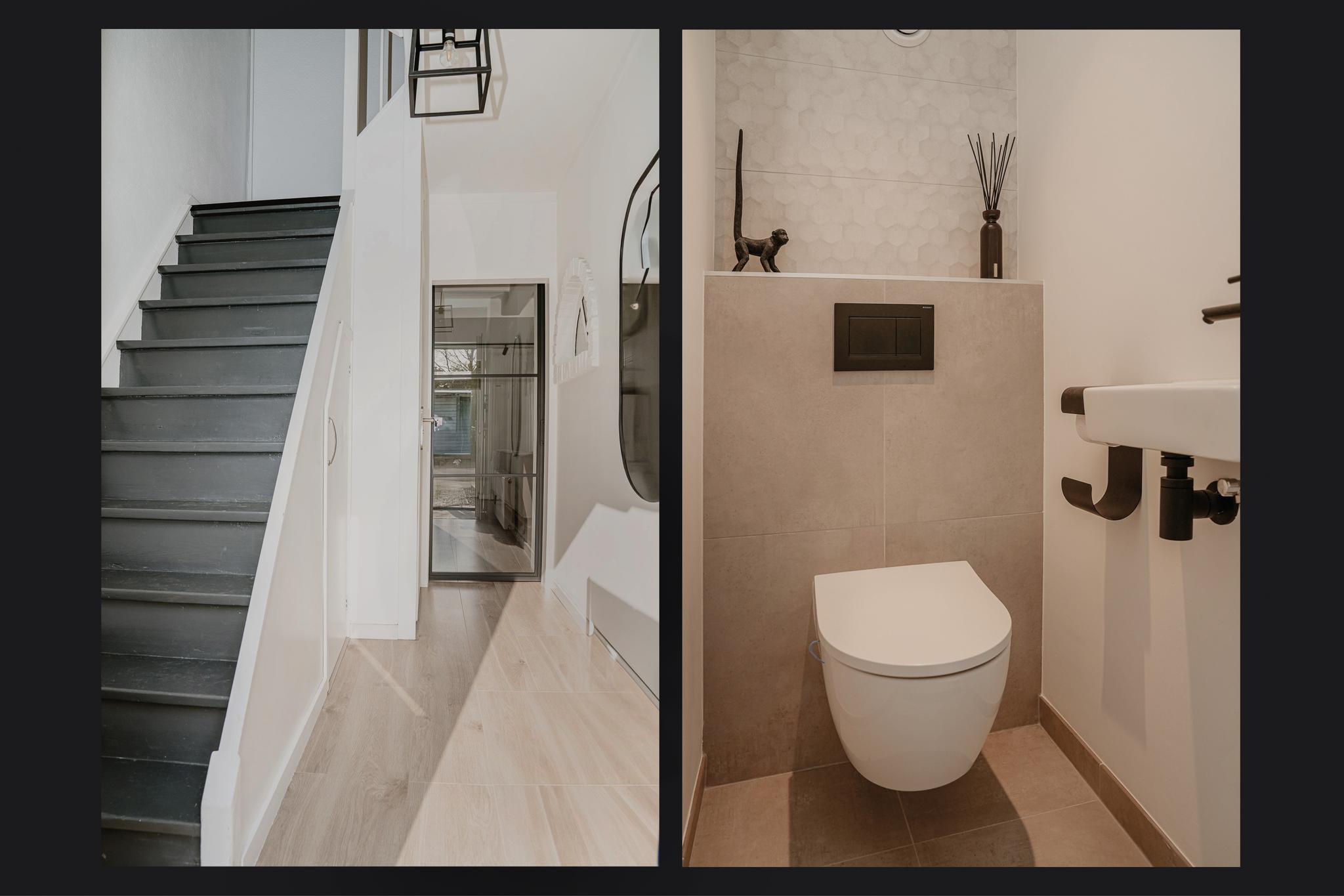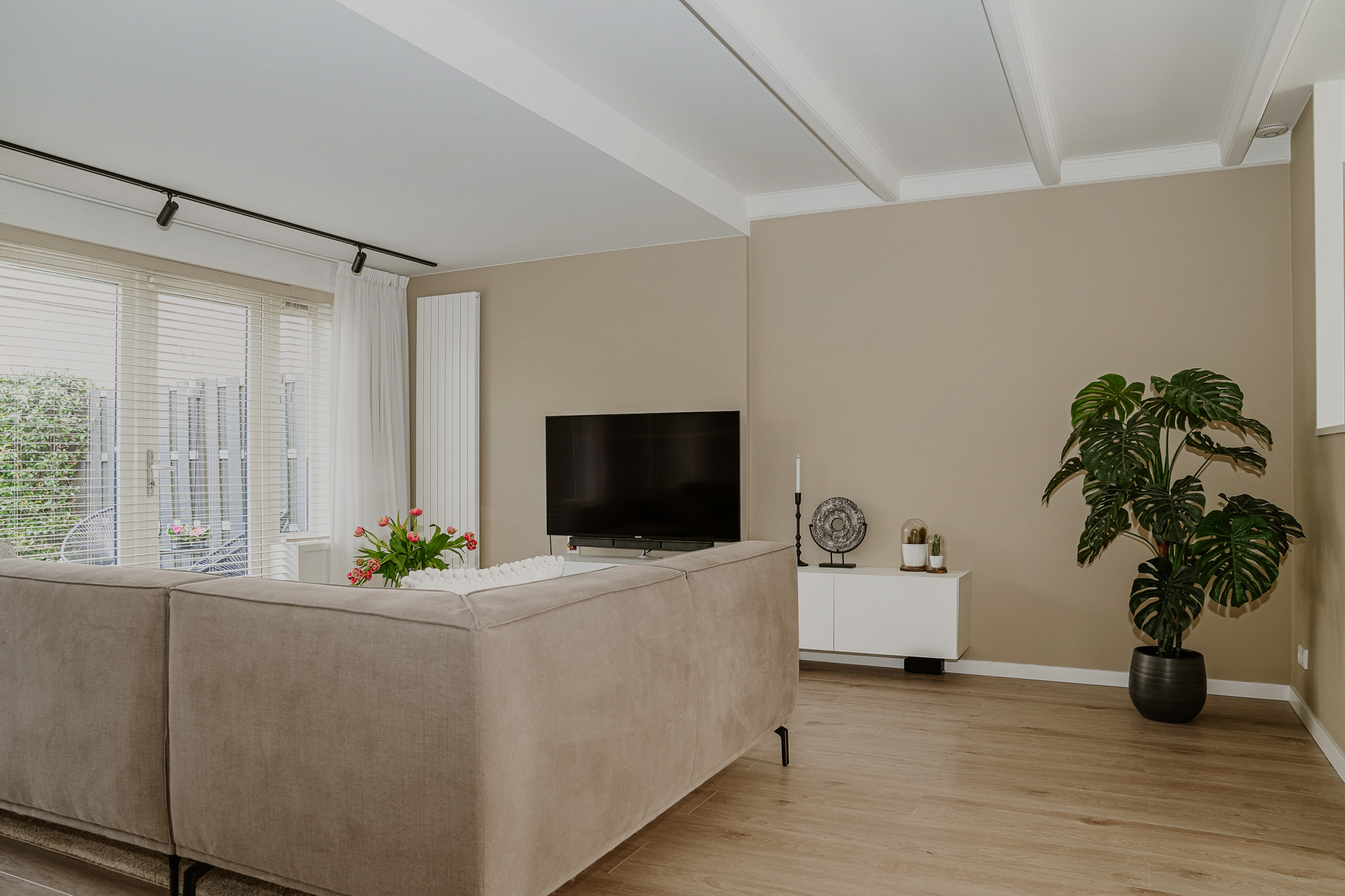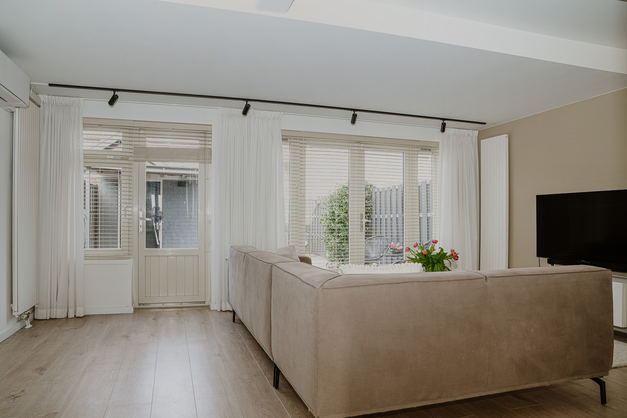 Entree met meterkast, vernieuwd toilet met fontein, trapopgang met trapkast en toegang tot de woonkamer met half-open keuken. De woonkamer is een heerlijke, lichte ruimte dankzij de grote ramen en de openslaande deuren naar de tuin. Hier geniet je het hele jaar door van comfort, mede dankzij de airconditioning (voor koelen en verwarmen). De strak gestuukte uitbouw met designradiatoren zorgt voor extra leefruimte en een luxe uitstraling. De keuken aan de voorzijde (2023) is een absolute blikvanger! Een moderne hoogglans witte keuken met een stijlvol composiet werkblad, topklasse inbouwapparatuur zoals een koel-vriescombinatie, combimagnetron, heteluchtoven, 4-pits inductiekookplaat met 6 flexzones en een rvs-afzuigkap. En er is hier voldoende ruimte voor een grote eettafel, een heerlijke plek voor vrienden en familie om gezellig te komen eten!