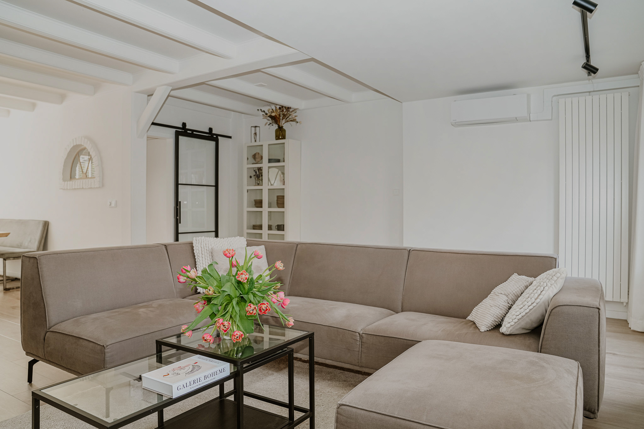 Uitgebouwde woonkamer met strak stucwerk, airconditioning en designradiatoren;