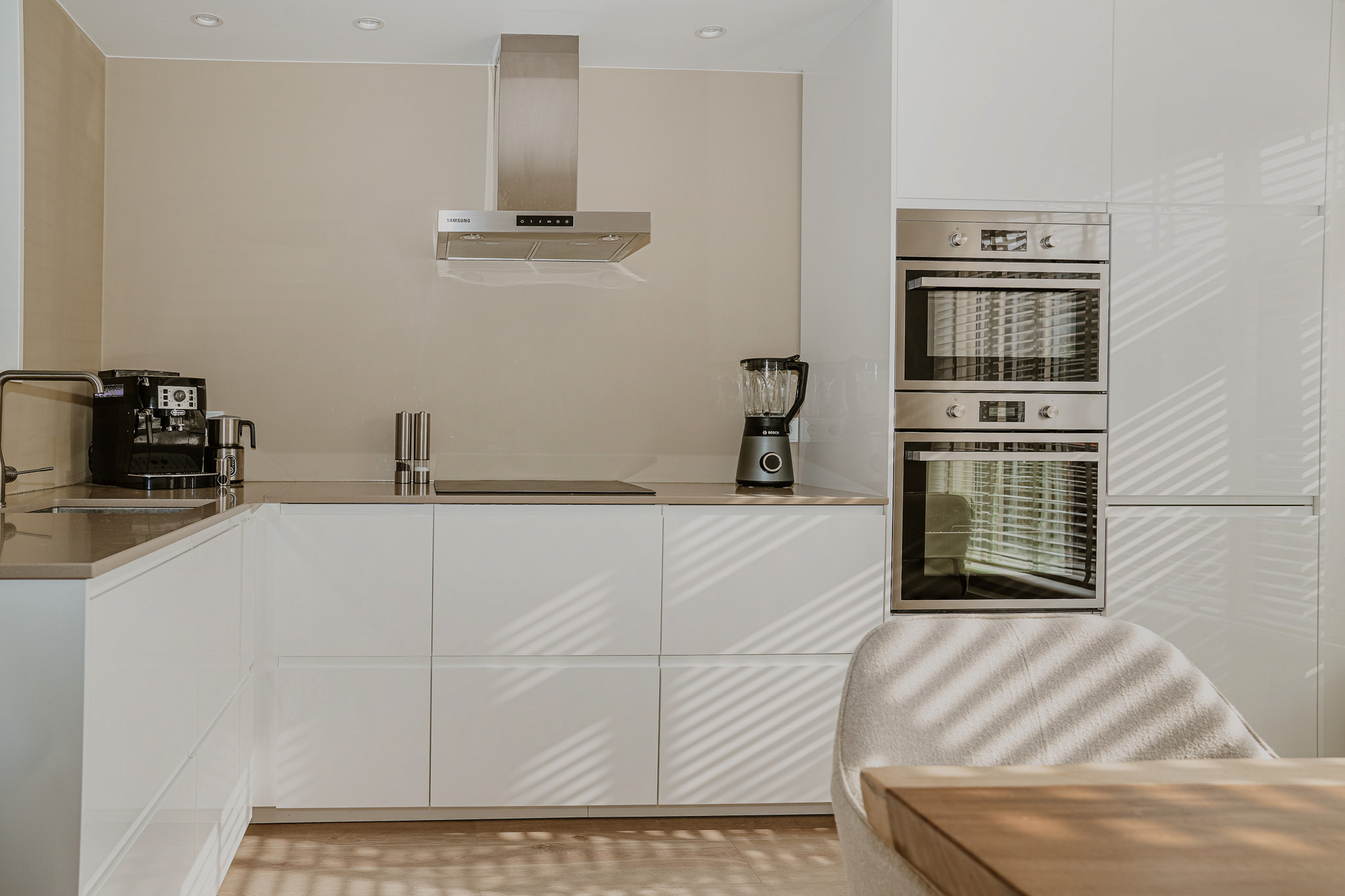 Stijlvolle, halfopen keuken uit 2023 met hoogwaardige apparatuur;