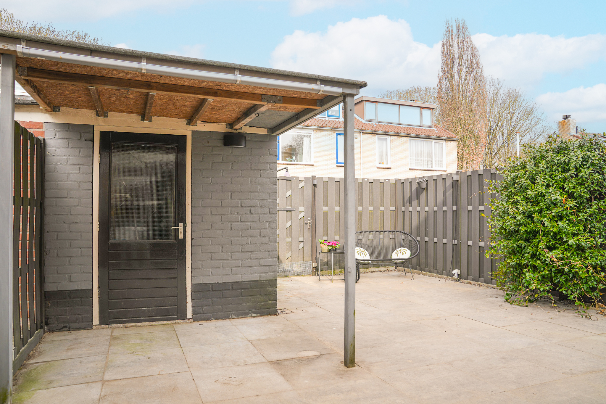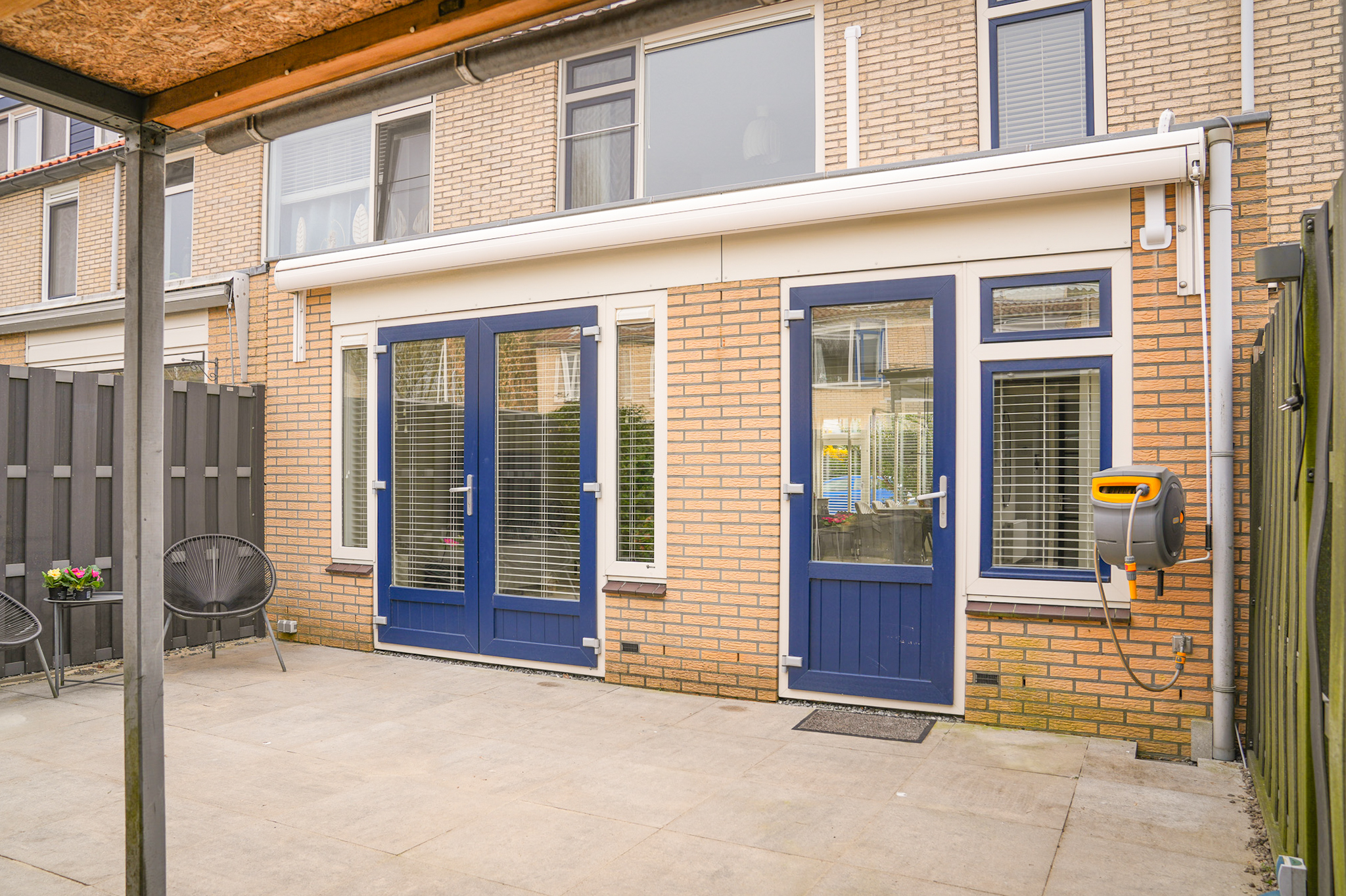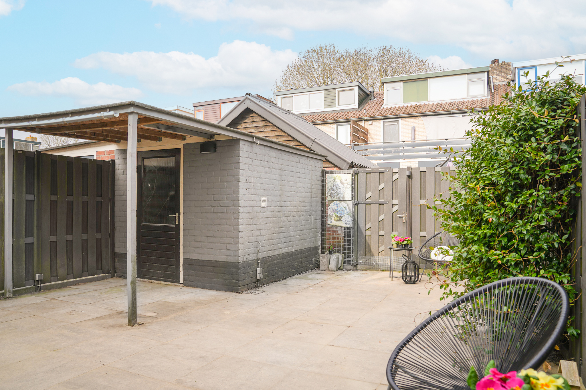 De achtertuin is gelegen op het (noord)westen, waardoor je overdag én 's avonds heerlijk van de zon kunt genieten. De tuin is voorzien van een handmatig zonnescherm, buitenverlichting, een handige buitenkraan en een stenen schuur met elektra. De overkapping zorgt voor een knusse plek om ook op minder zonnige dagen buiten te zitten.