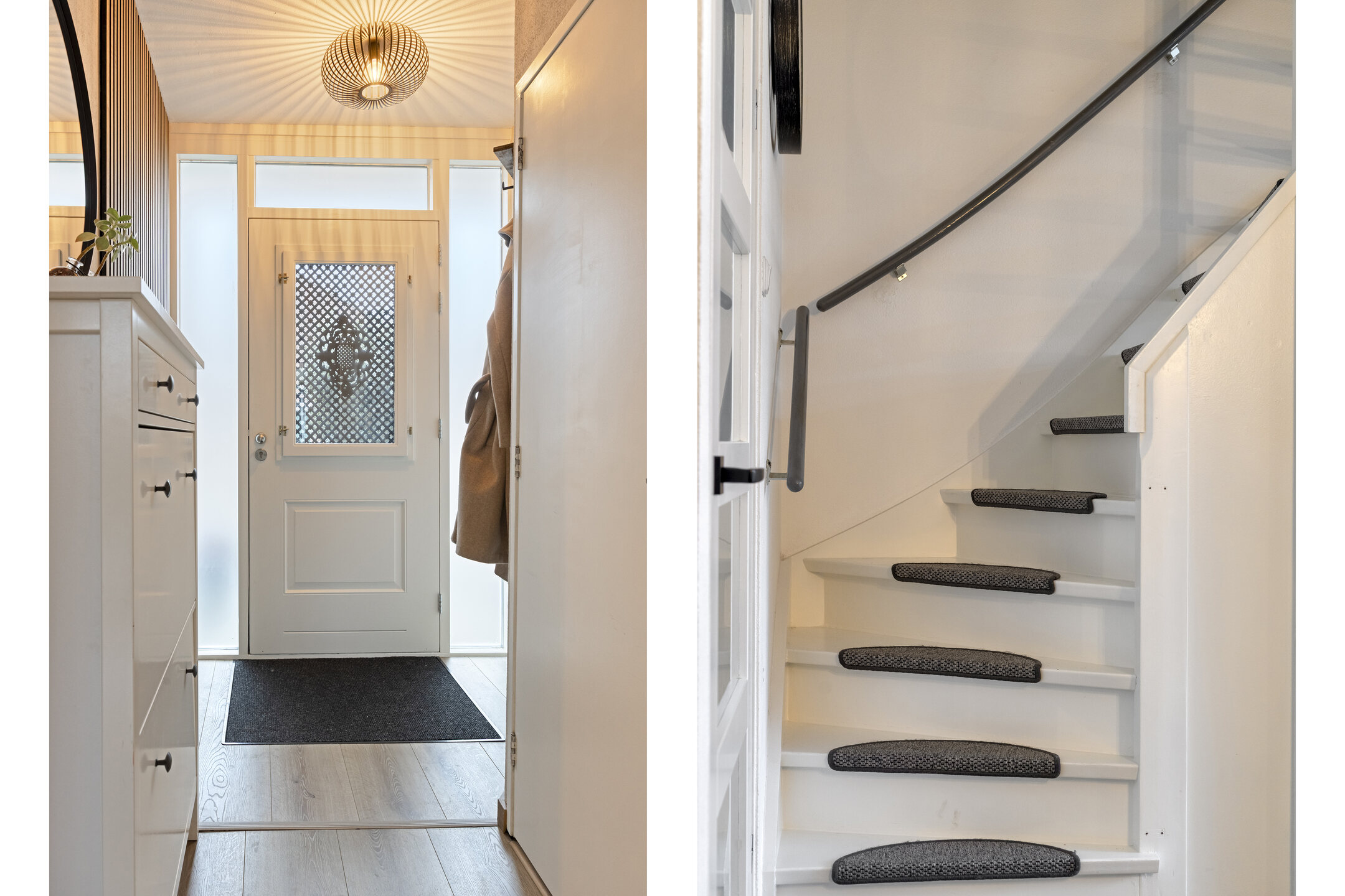 Via de onlangs volledig opnieuw aangelegde voortuin betreden we de entree met garderobe, de meterkast (uitgebreid naar 3-fase) en een modern gerenoveerd toilet met fontein. De brede laminaatvloer loopt door over de gehele begane grond en geeft het huis een rustige, moderne uitstraling.