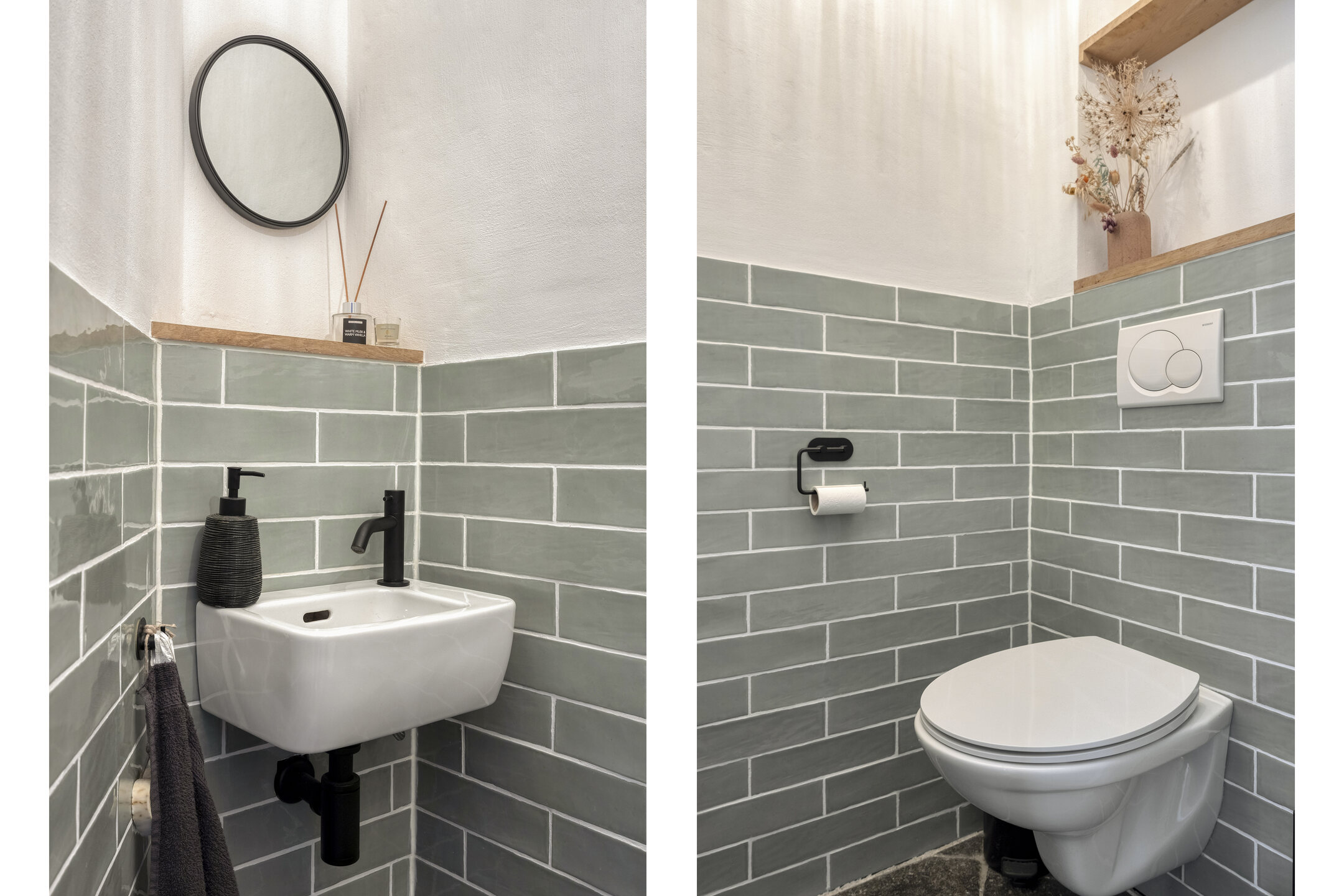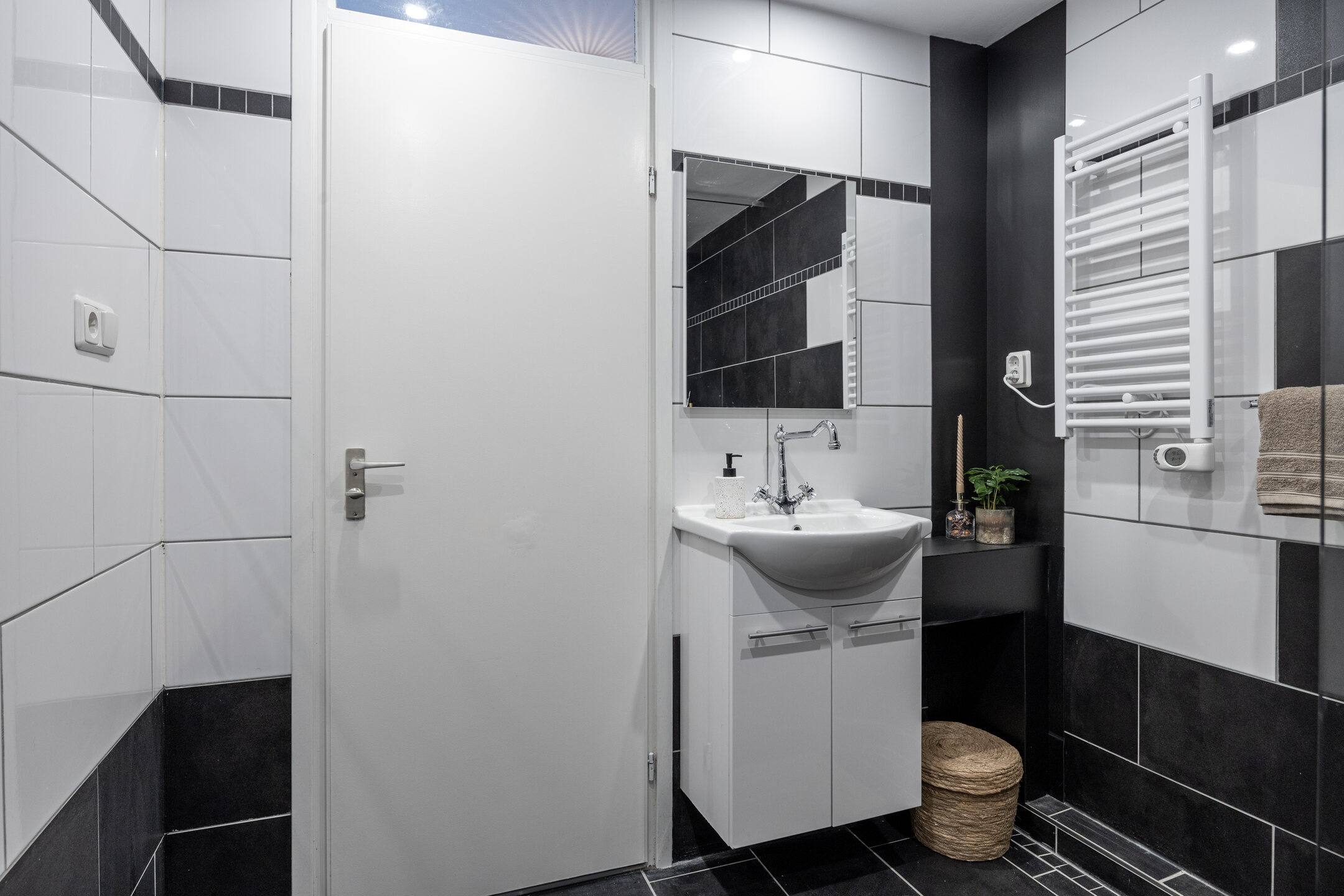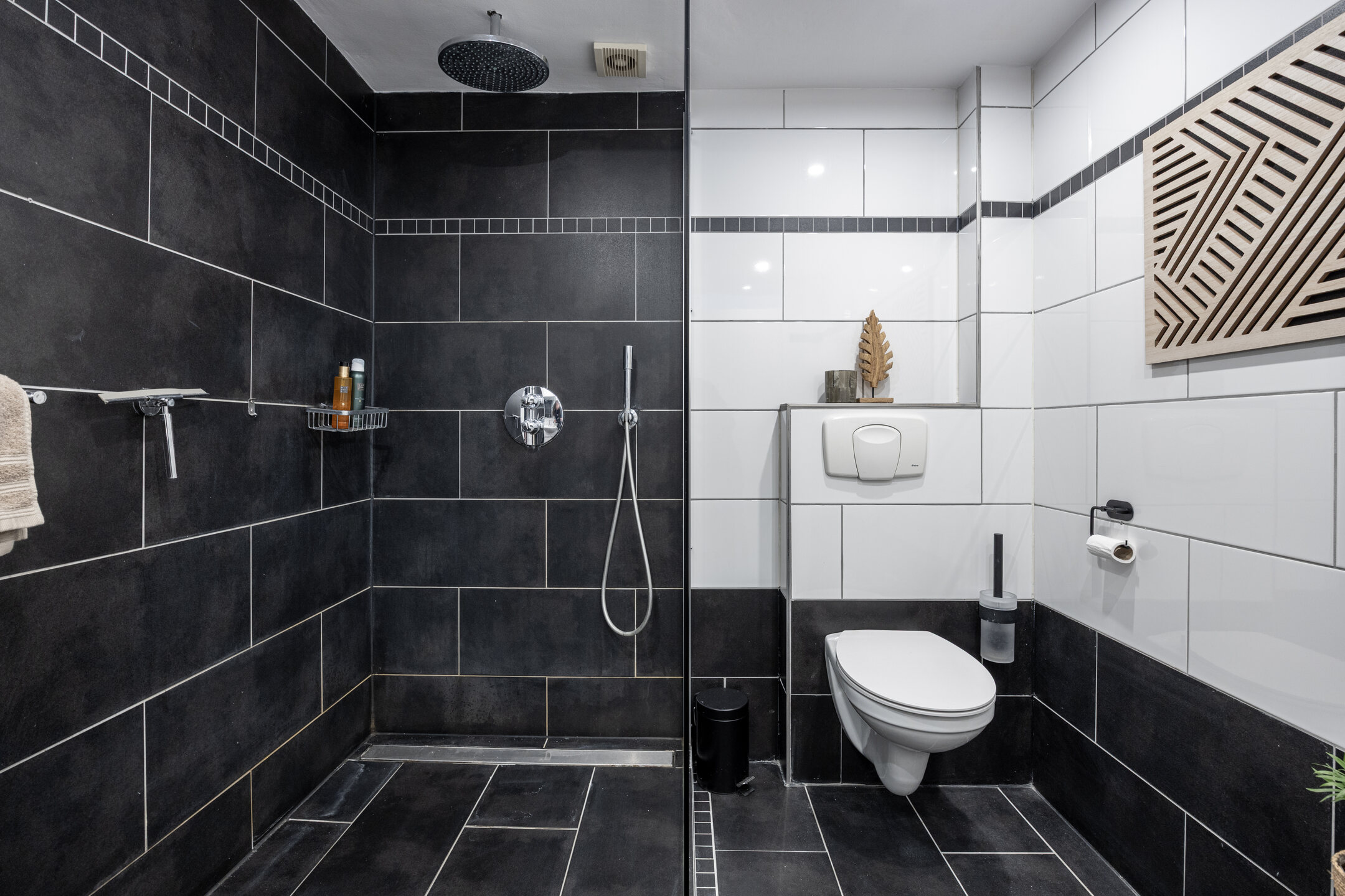 De badkamer is inpandig en modern uitgevoerd. Hier vind je een ruime inloopdouche met regendouche, een wastafel, een toilet en een elektrische handdoekradiator – een fijne plek om de dag ontspannen te beginnen of af te sluiten.