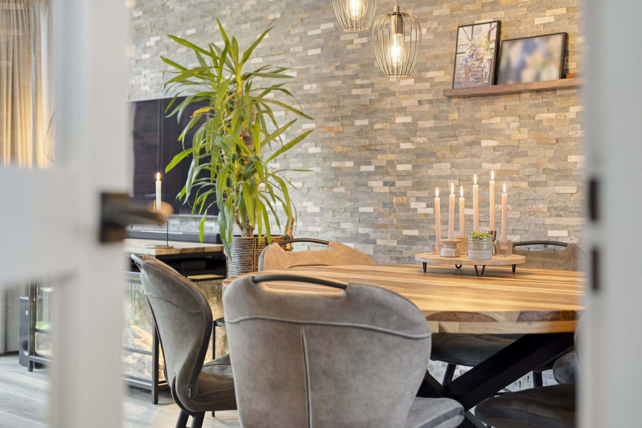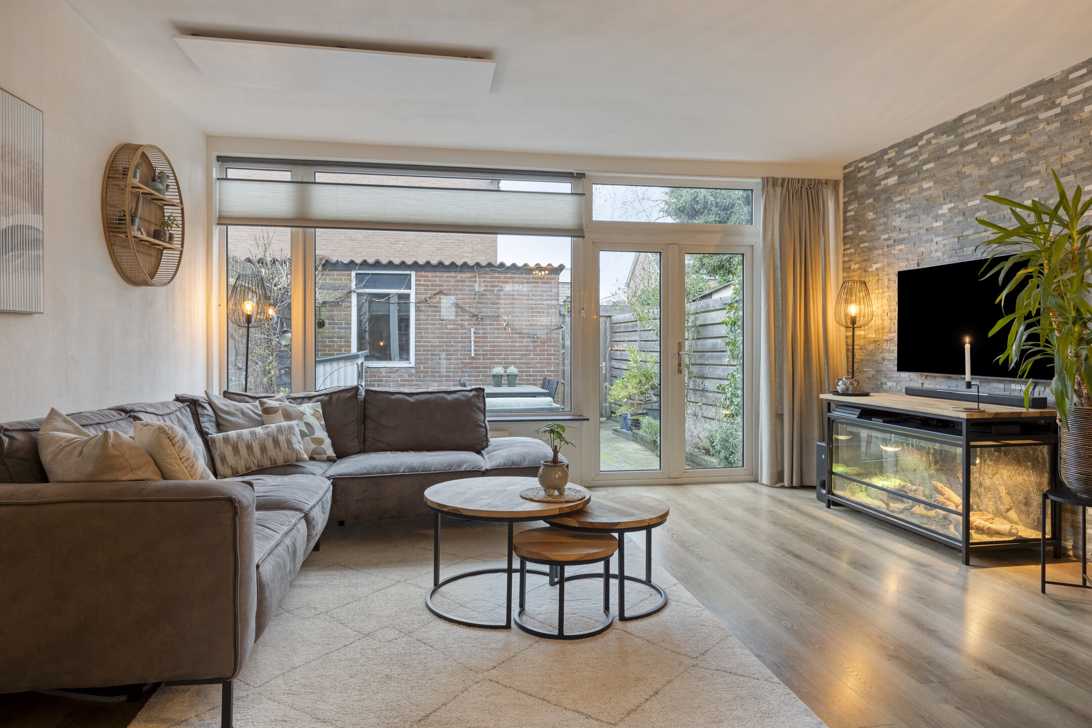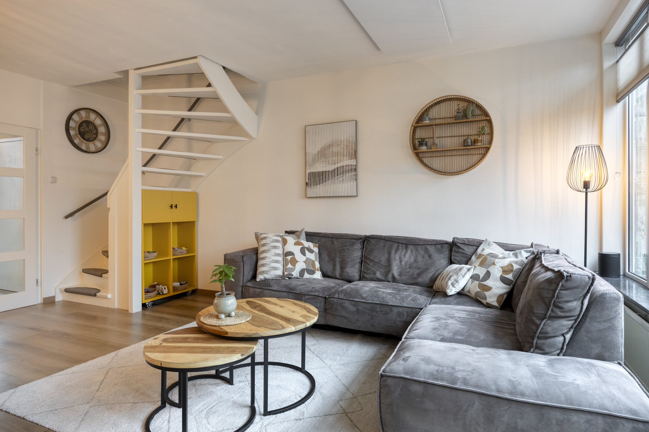De woonkamer is een fijne leefruimte met veel licht en een prettige verbinding met buiten. Via de openslaande deuren aan de achterzijde loop je zo de tuin in – ideaal op zonnige dagen of wanneer de kinderen buiten spelen. Onder de open trap is slim gebruik gemaakt van de ruimte: een verrijdbare trapkast voor speelgoed of boeken, met daarachter extra bergruimte.