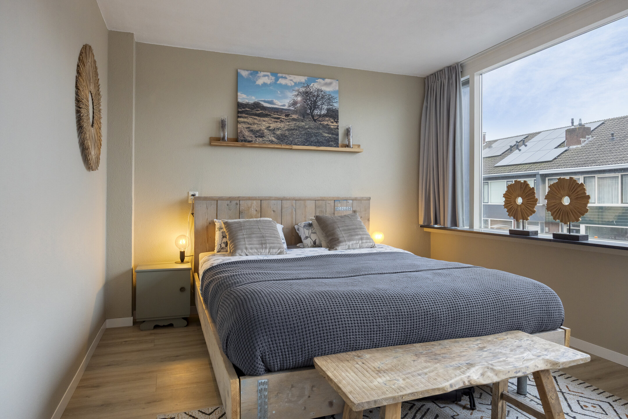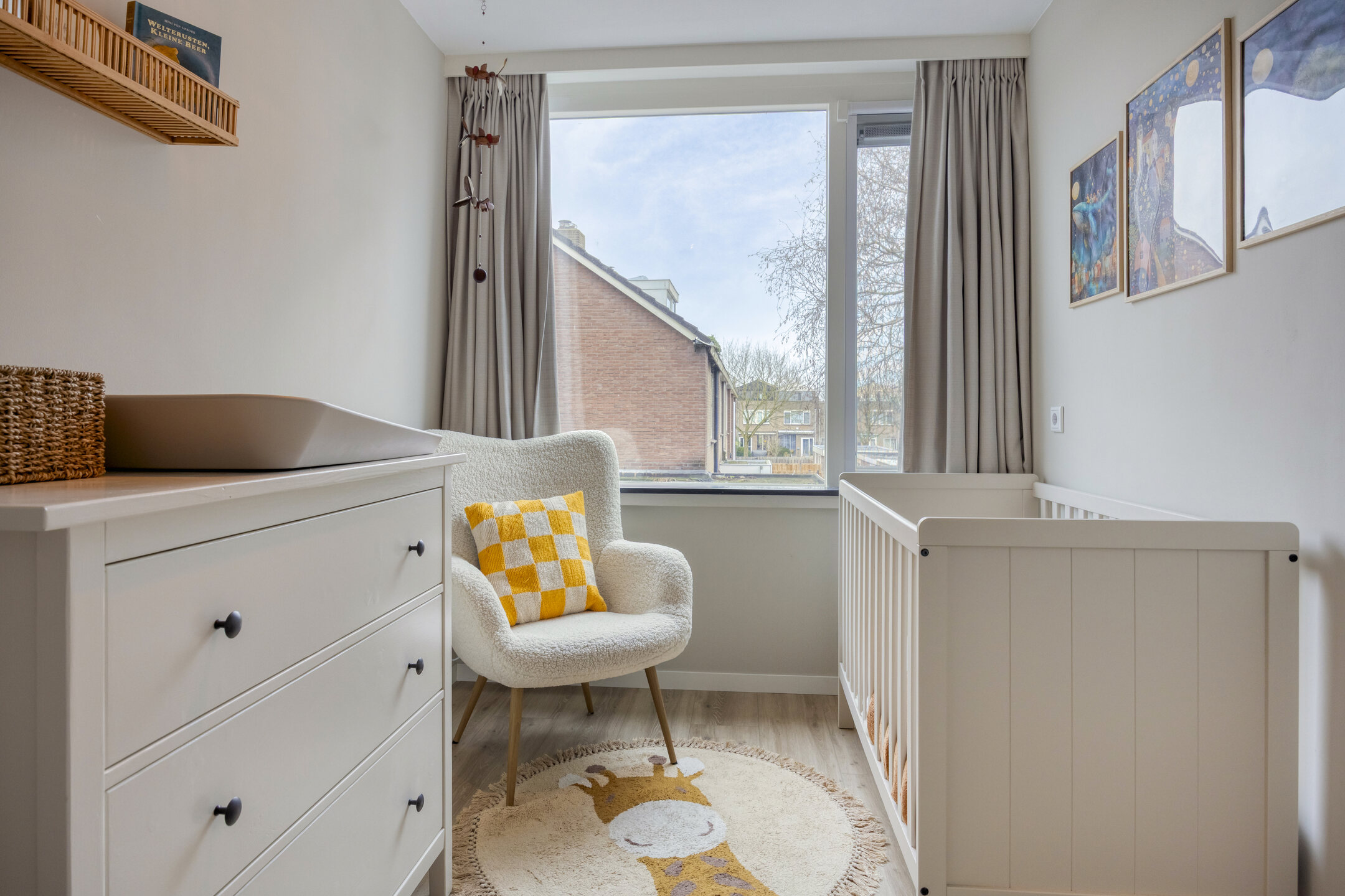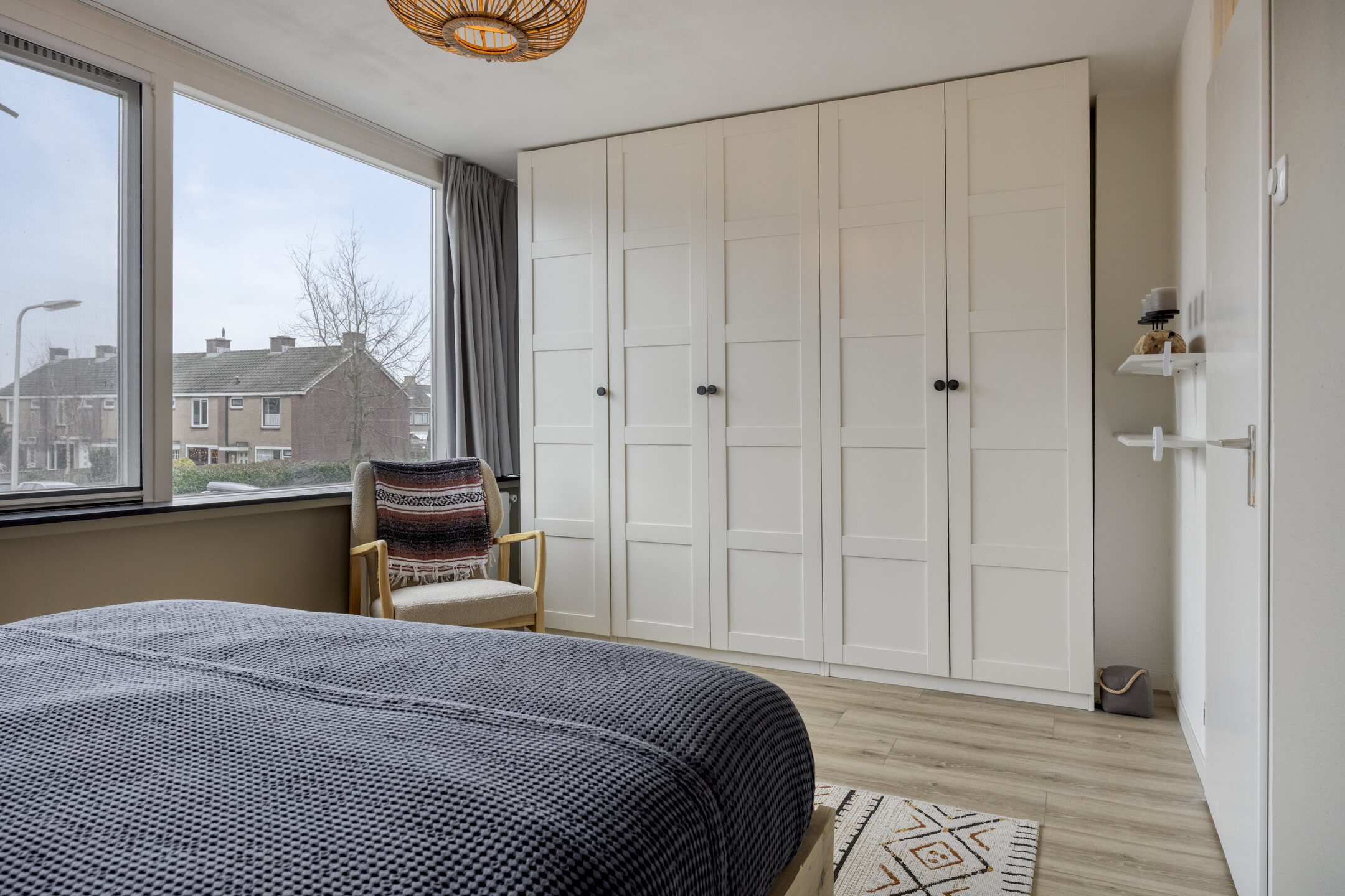 Op de eerste verdieping, waar in 2024 een pvc-klikvloer is gelegd, bevinden zich drie slaapkamers (ca. 15,4 m², 7,6 m² en 7,5 m²). De hoofdslaapkamer ligt aan de voorzijde en beschikt over HR++ glas en een rolhor. De twee slaapkamers aan de achterzijde zijn in 2024 voorzien van nieuw HR++ glas en één van beide beschikt eveneens over een rolhor.