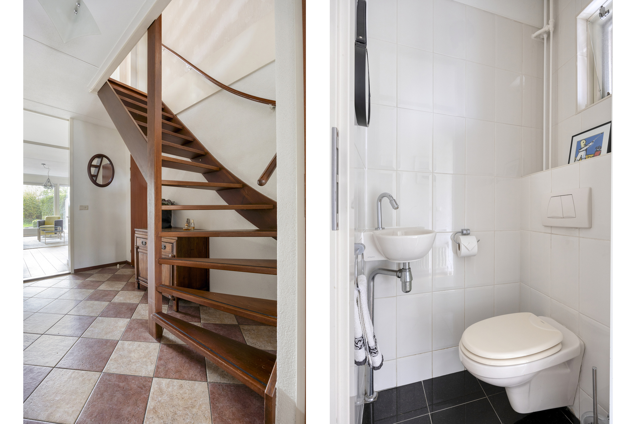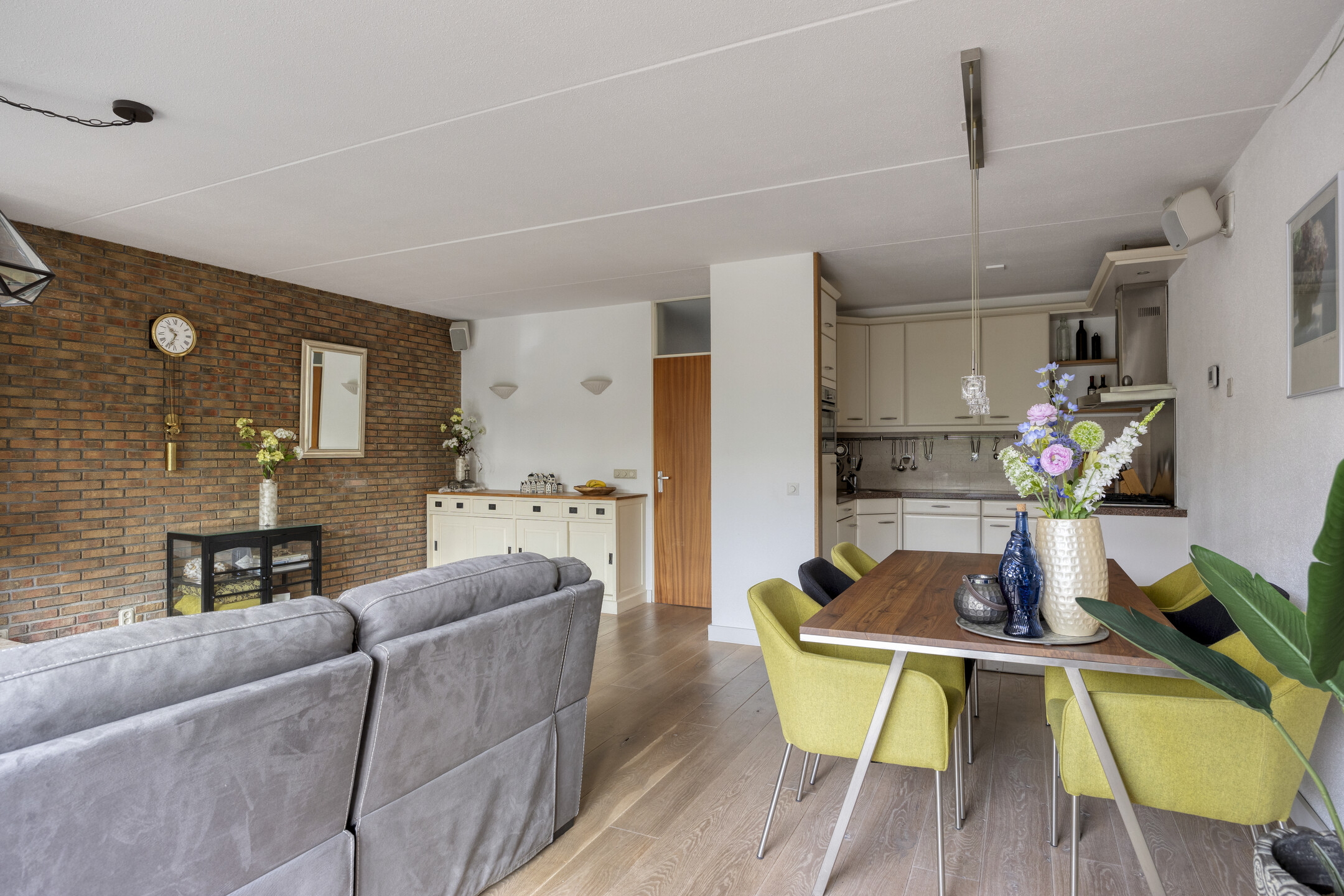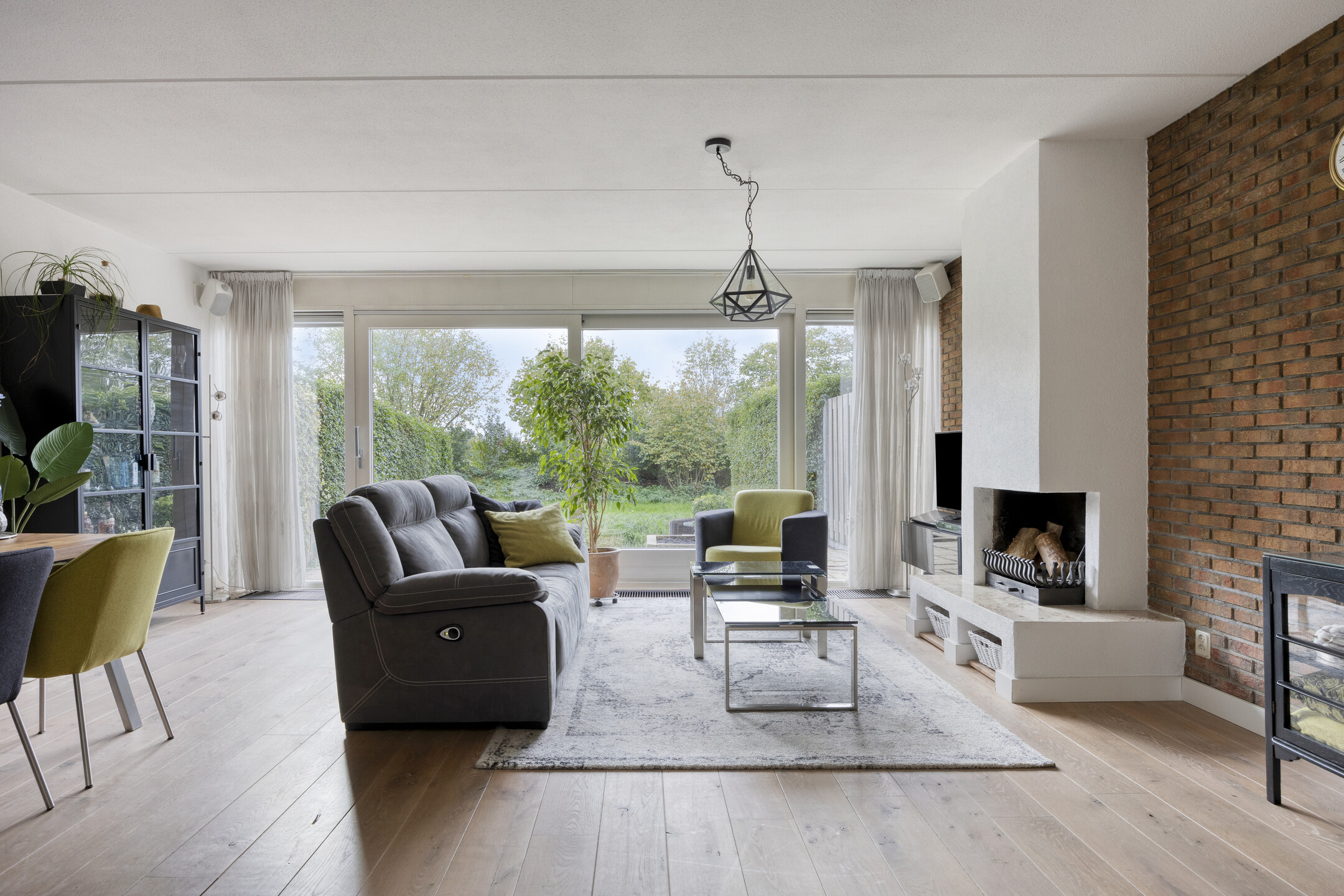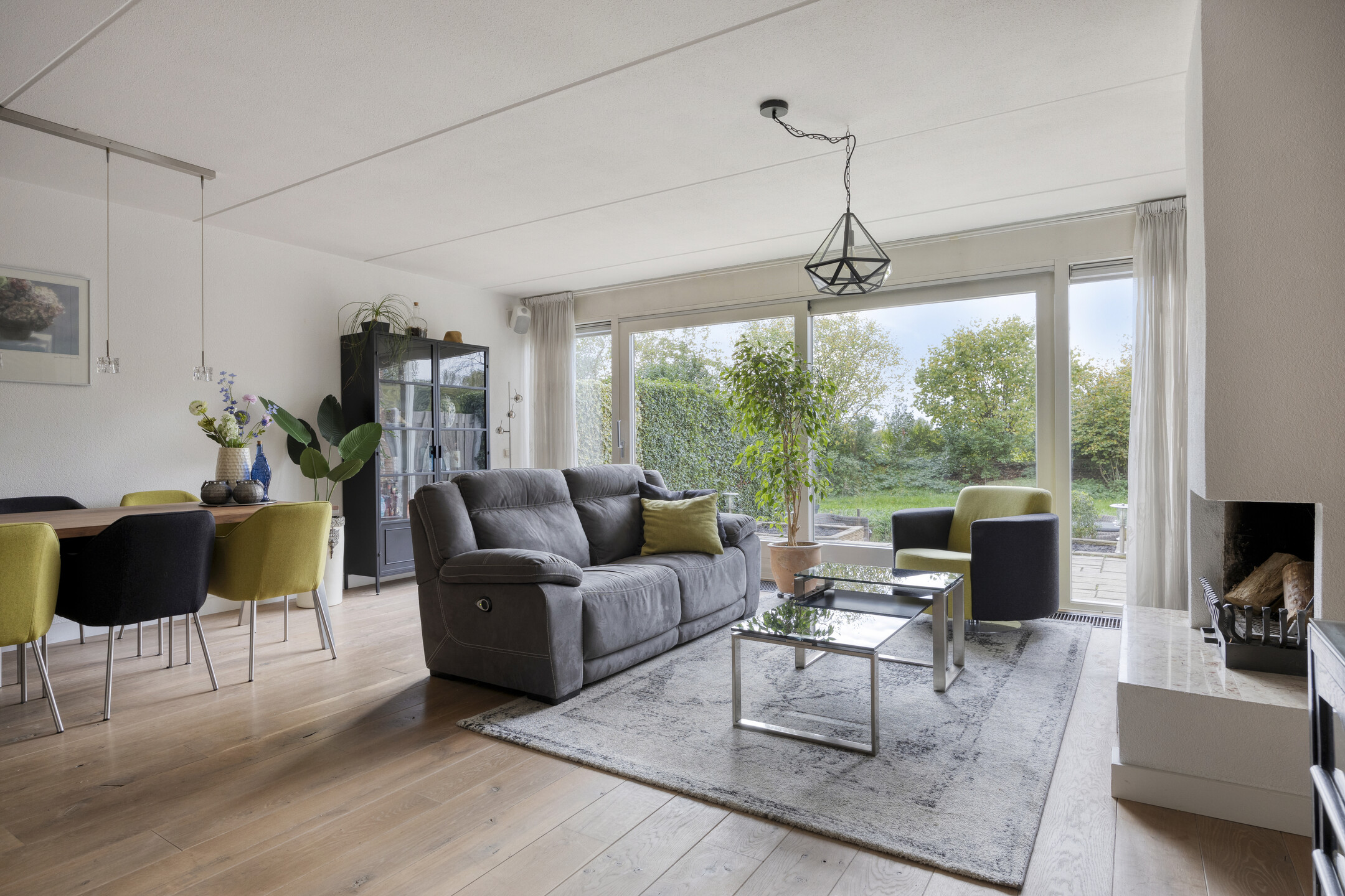 Ruime entree met trapopgang, toilet en toegang tot de voormalige garage, momenteel in gebruik als berging met bijkeuken voorzien van wasmachineaansluiting en garderobe. De lichte woonkamer met eiken vloer, open haard en grote glazen schuifpui biedt een prachtig uitzicht op de tuin en het achtergelegen groen. De open, inpandige keuken is uitgerust met een 6-pits gaskookplaat, combi-oven/magnetron, koelkast, 1,5 spoelbak en RVS-afzuigkap.