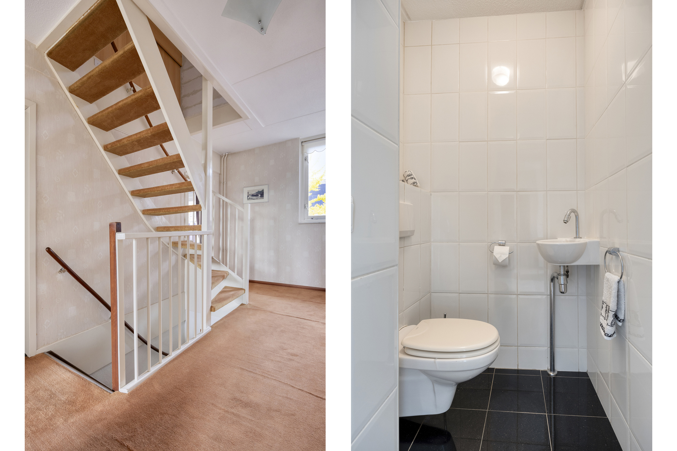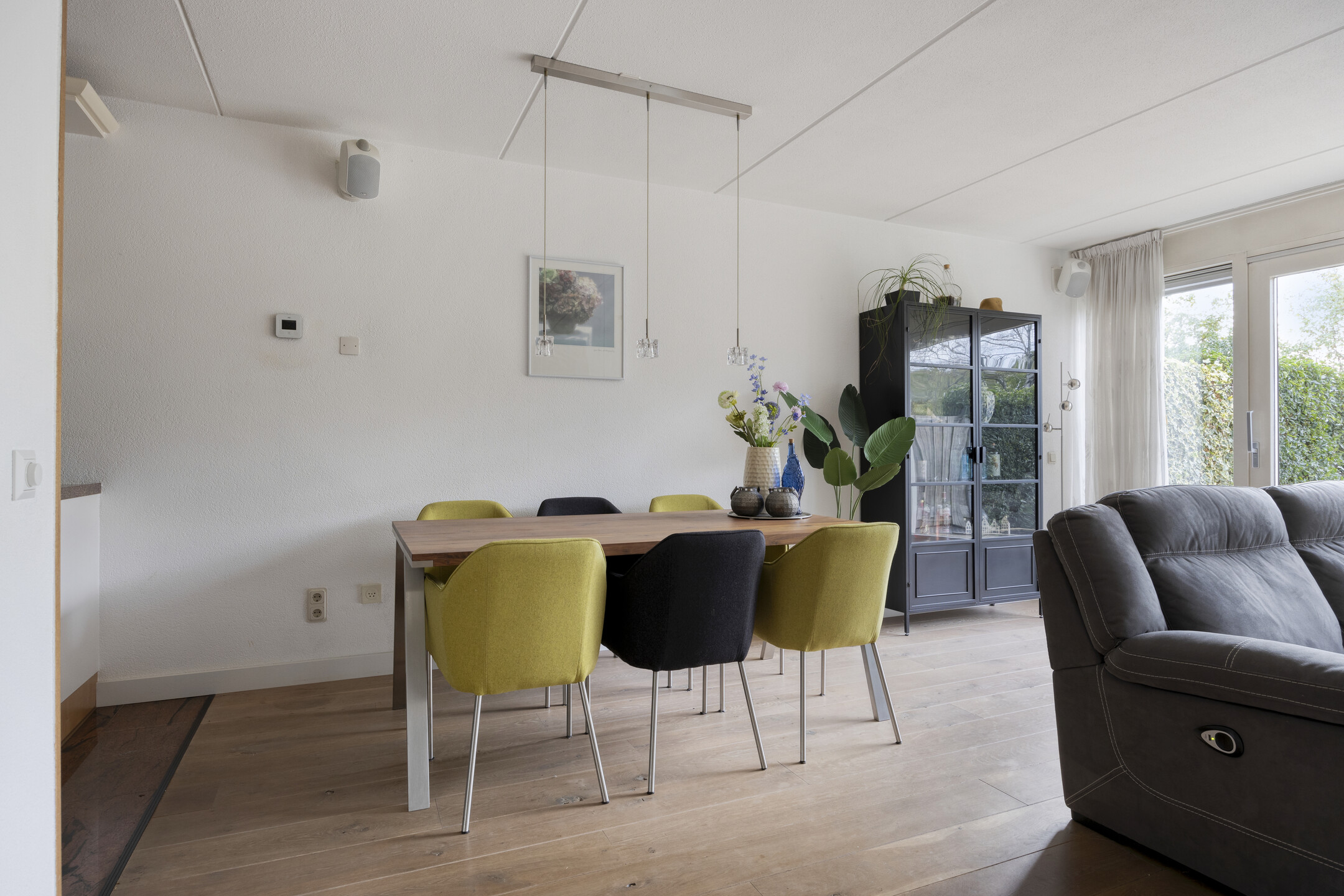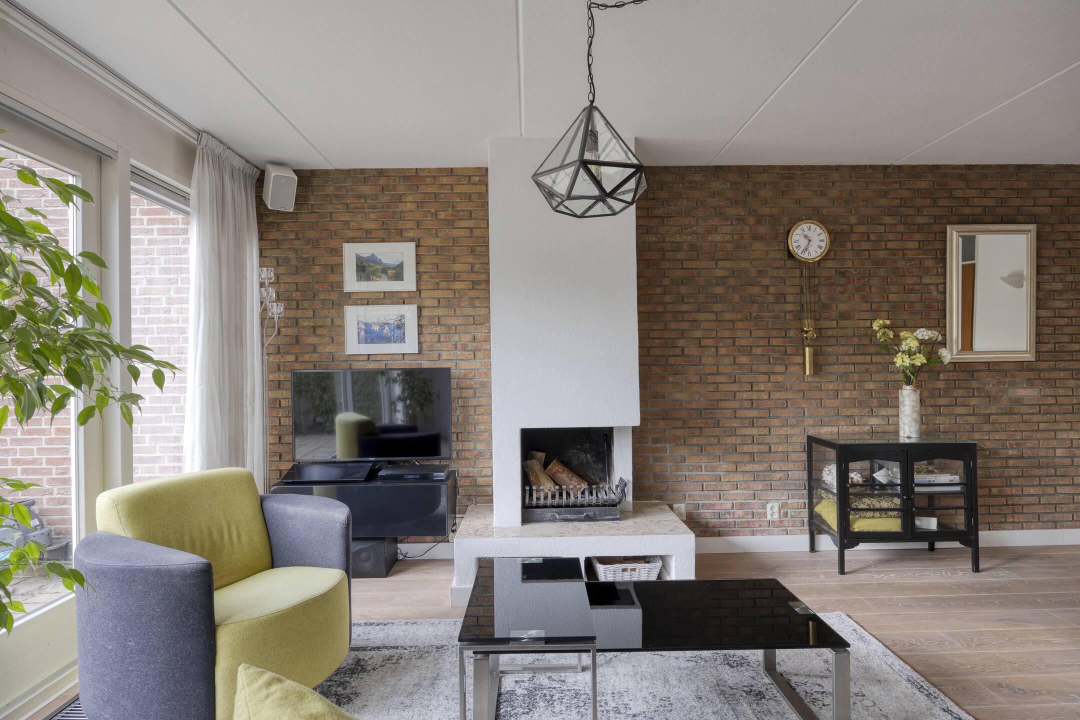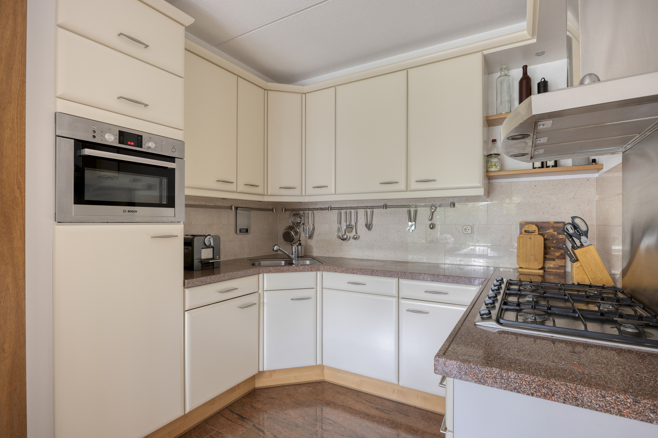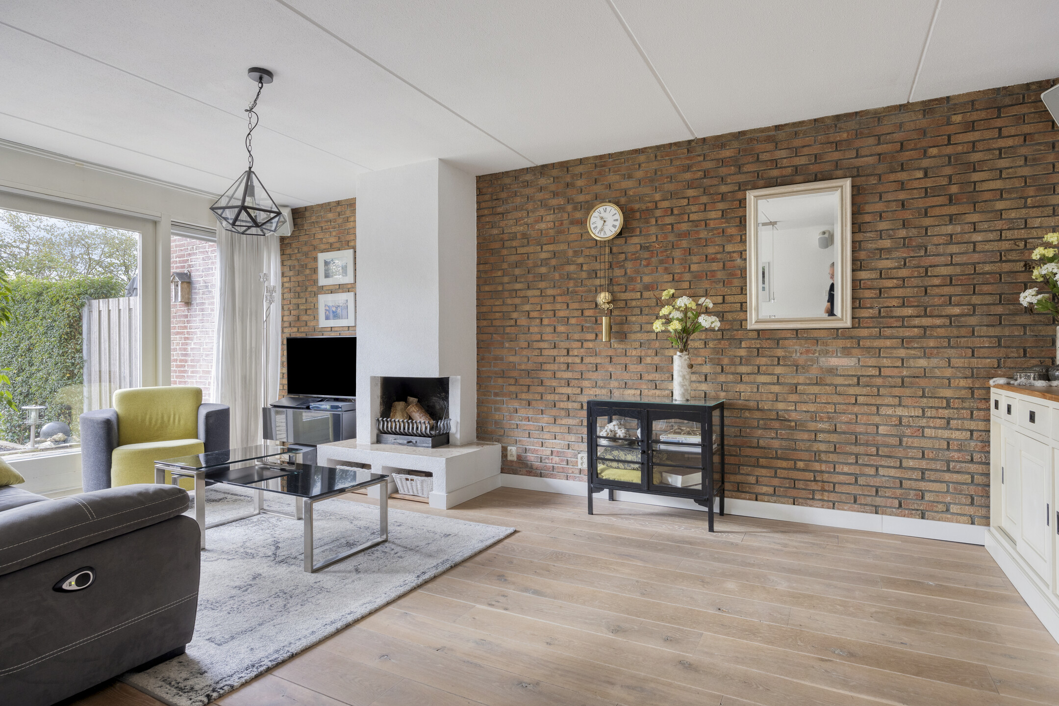 Ruime entree met trapopgang, toilet en toegang tot de voormalige garage, momenteel in gebruik als berging met bijkeuken voorzien van wasmachineaansluiting en garderobe. De lichte woonkamer met eiken vloer, open haard en grote glazen schuifpui biedt een prachtig uitzicht op de tuin en het achtergelegen groen. De open, inpandige keuken is uitgerust met een 6-pits gaskookplaat, combi-oven/magnetron, koelkast, 1,5 spoelbak en RVS-afzuigkap.