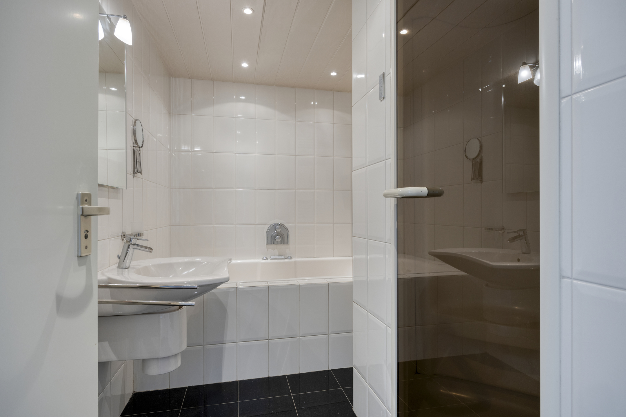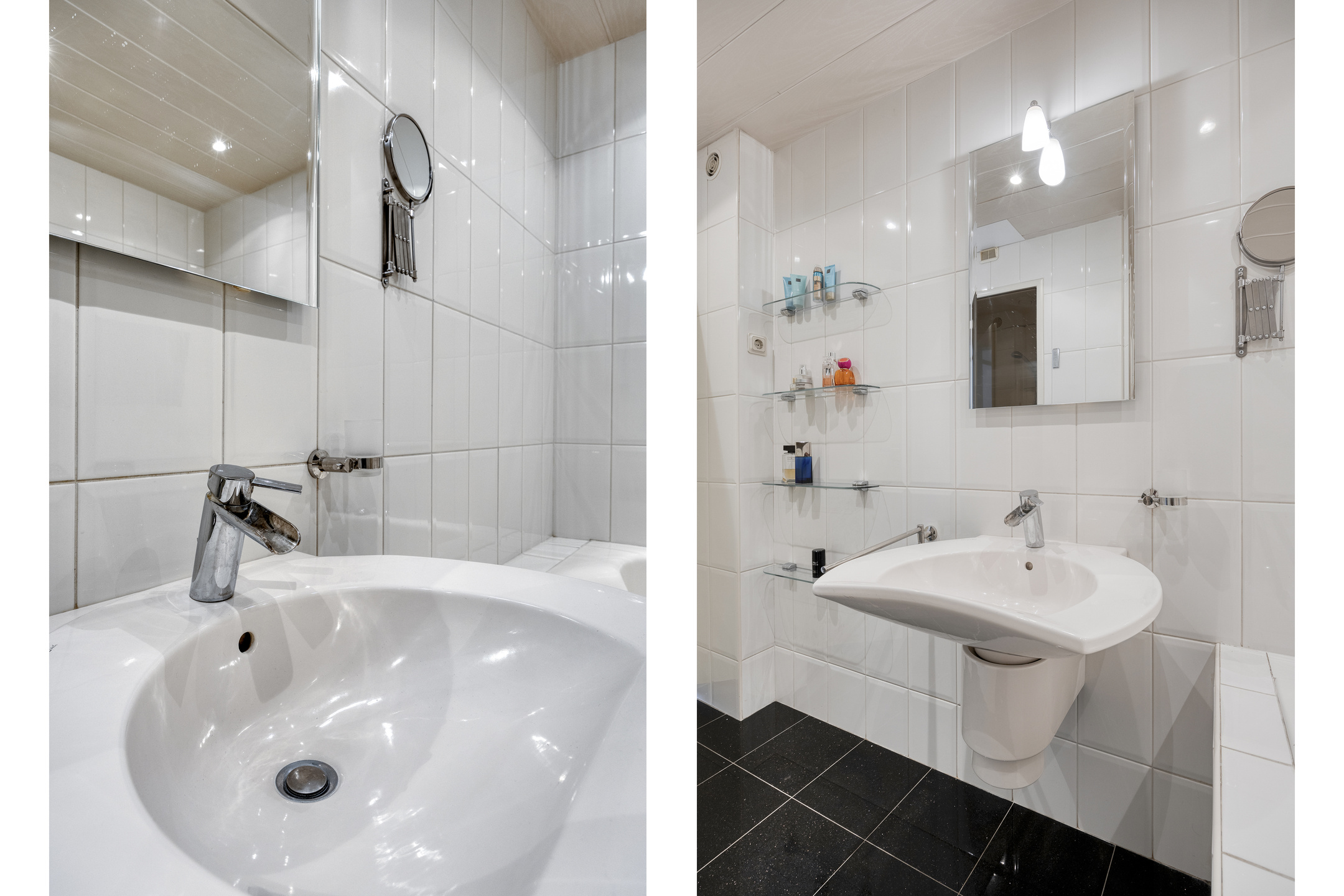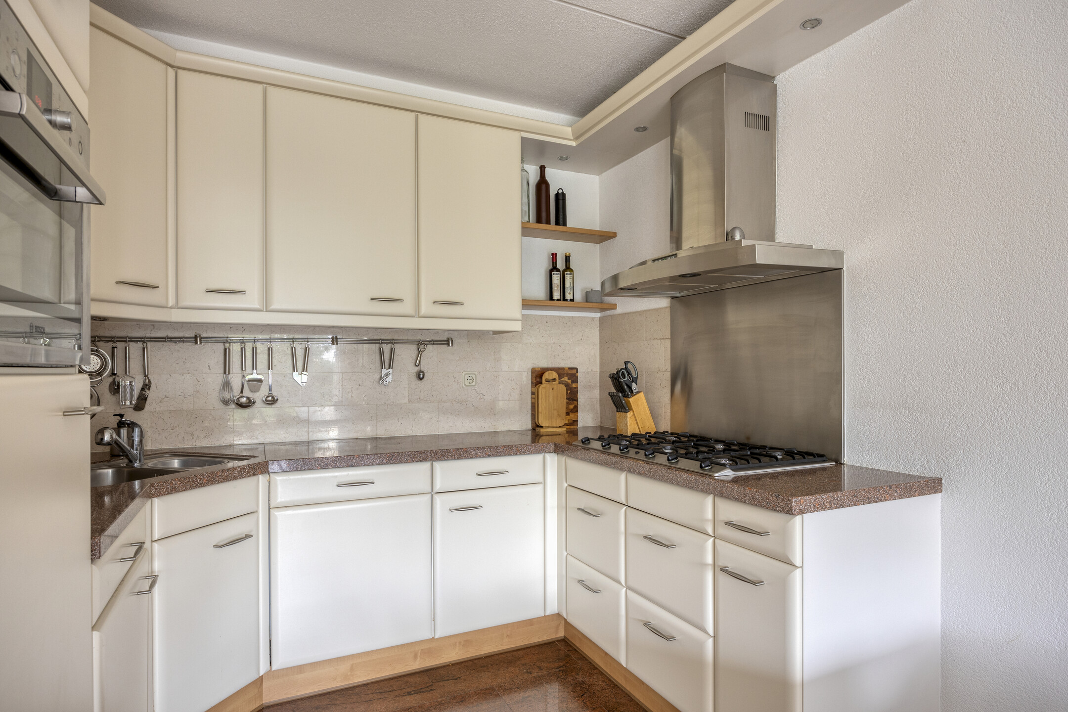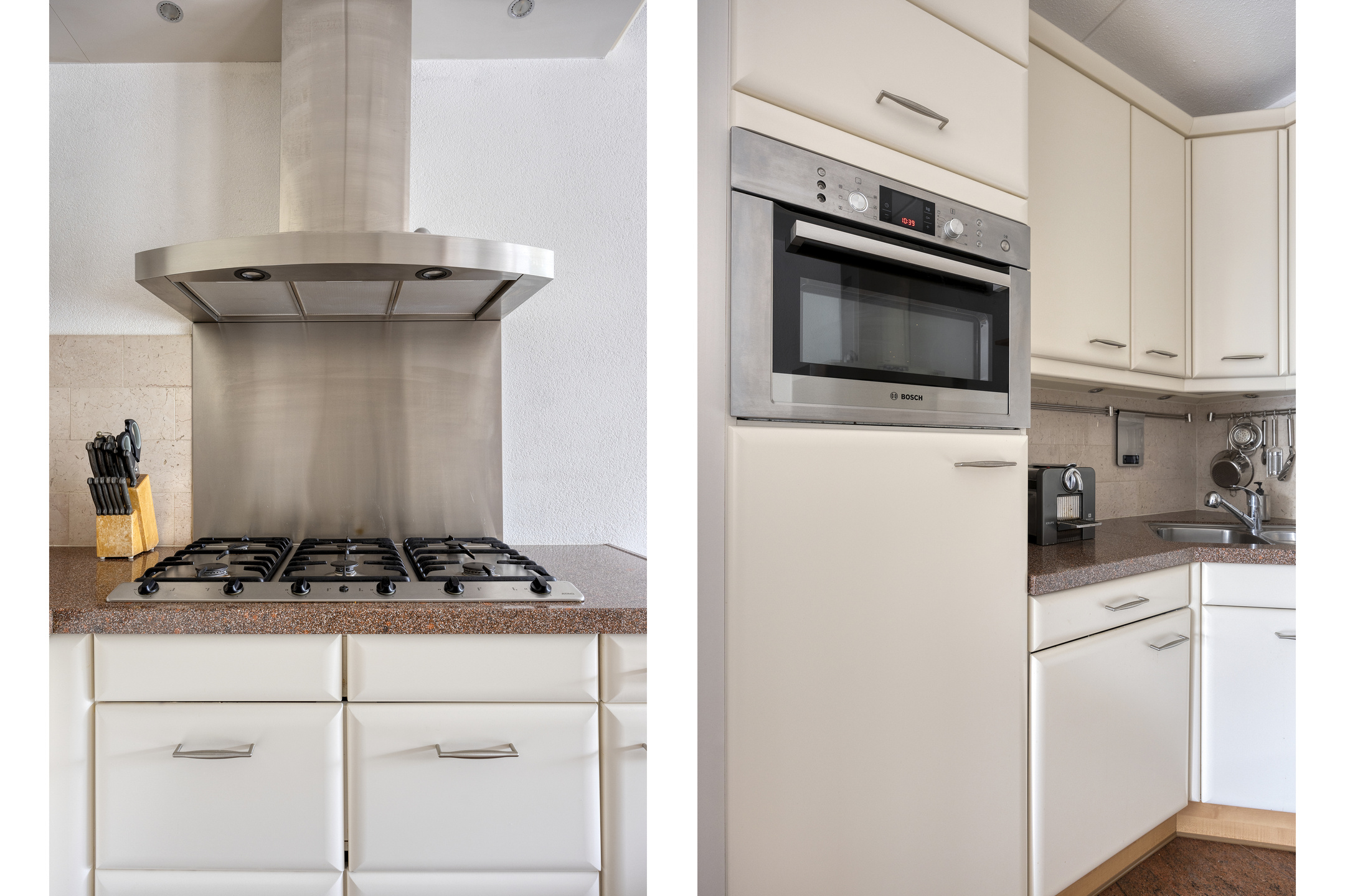 Ruime entree met trapopgang, toilet en toegang tot de voormalige garage, momenteel in gebruik als berging met bijkeuken voorzien van wasmachineaansluiting en garderobe. De lichte woonkamer met eiken vloer, open haard en grote glazen schuifpui biedt een prachtig uitzicht op de tuin en het achtergelegen groen. De open, inpandige keuken is uitgerust met een 6-pits gaskookplaat, combi-oven/magnetron, koelkast, 1,5 spoelbak en RVS-afzuigkap.