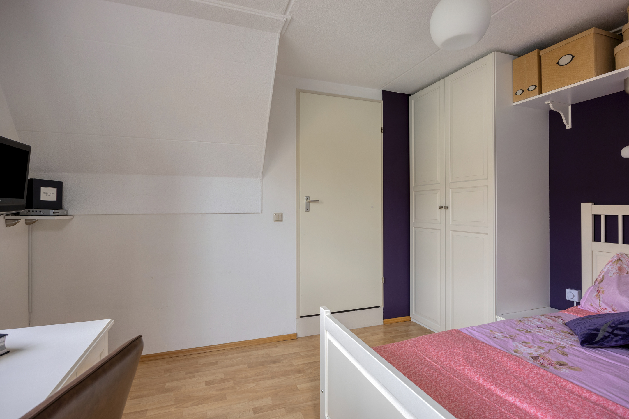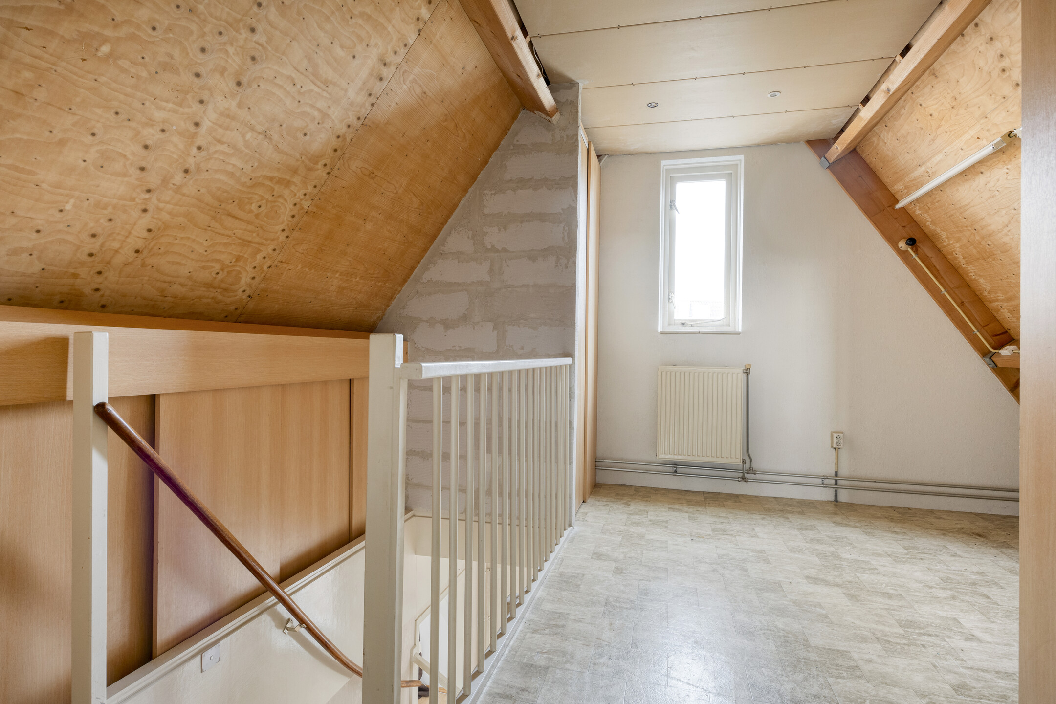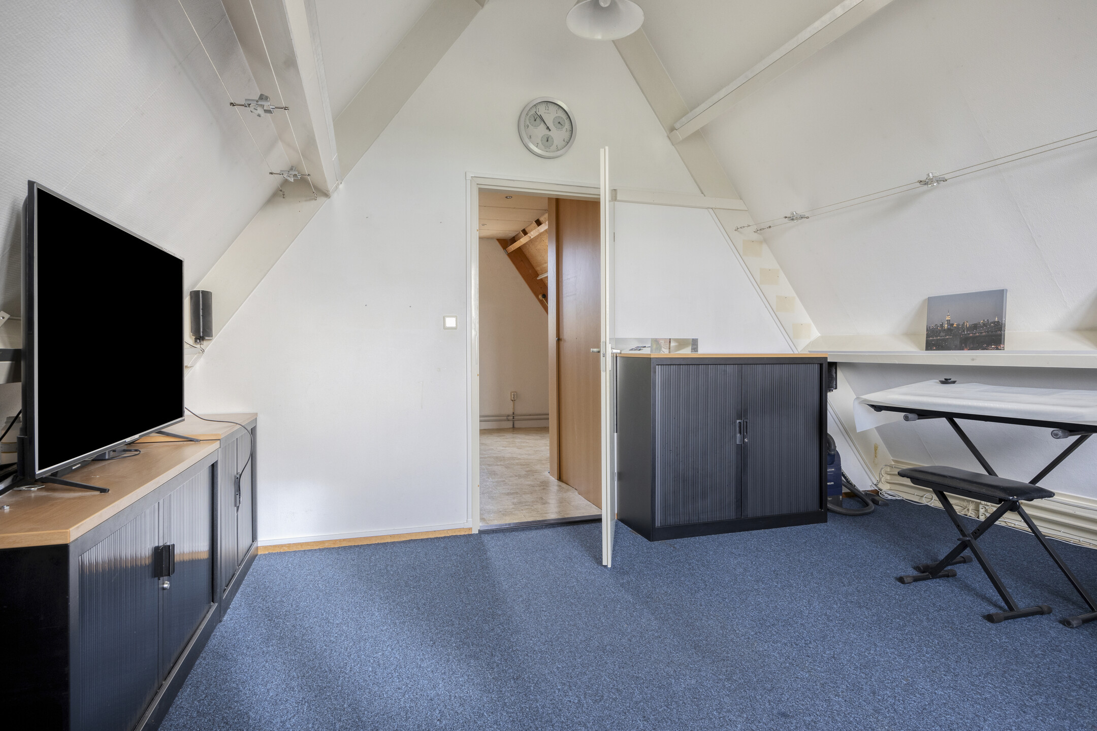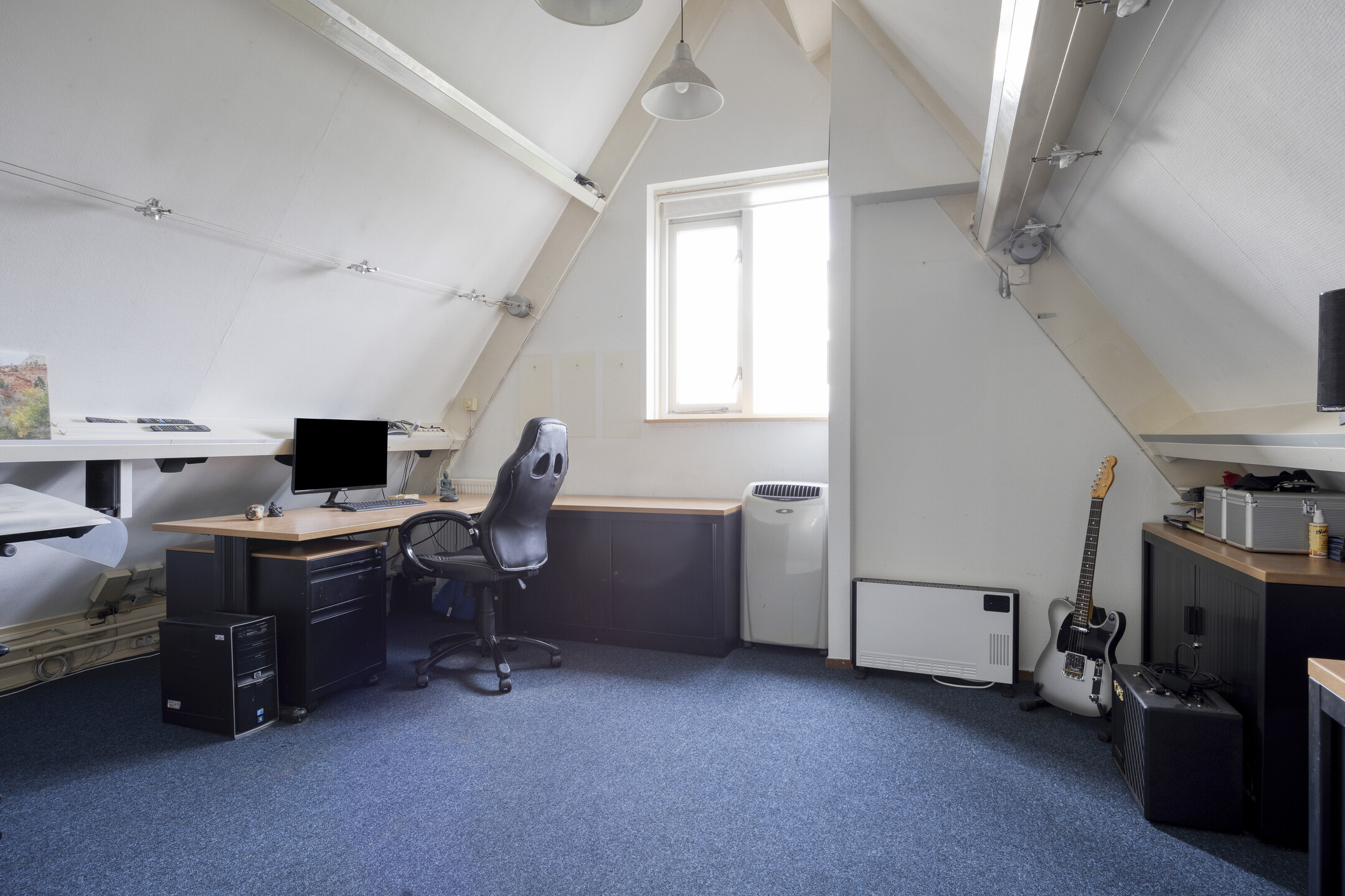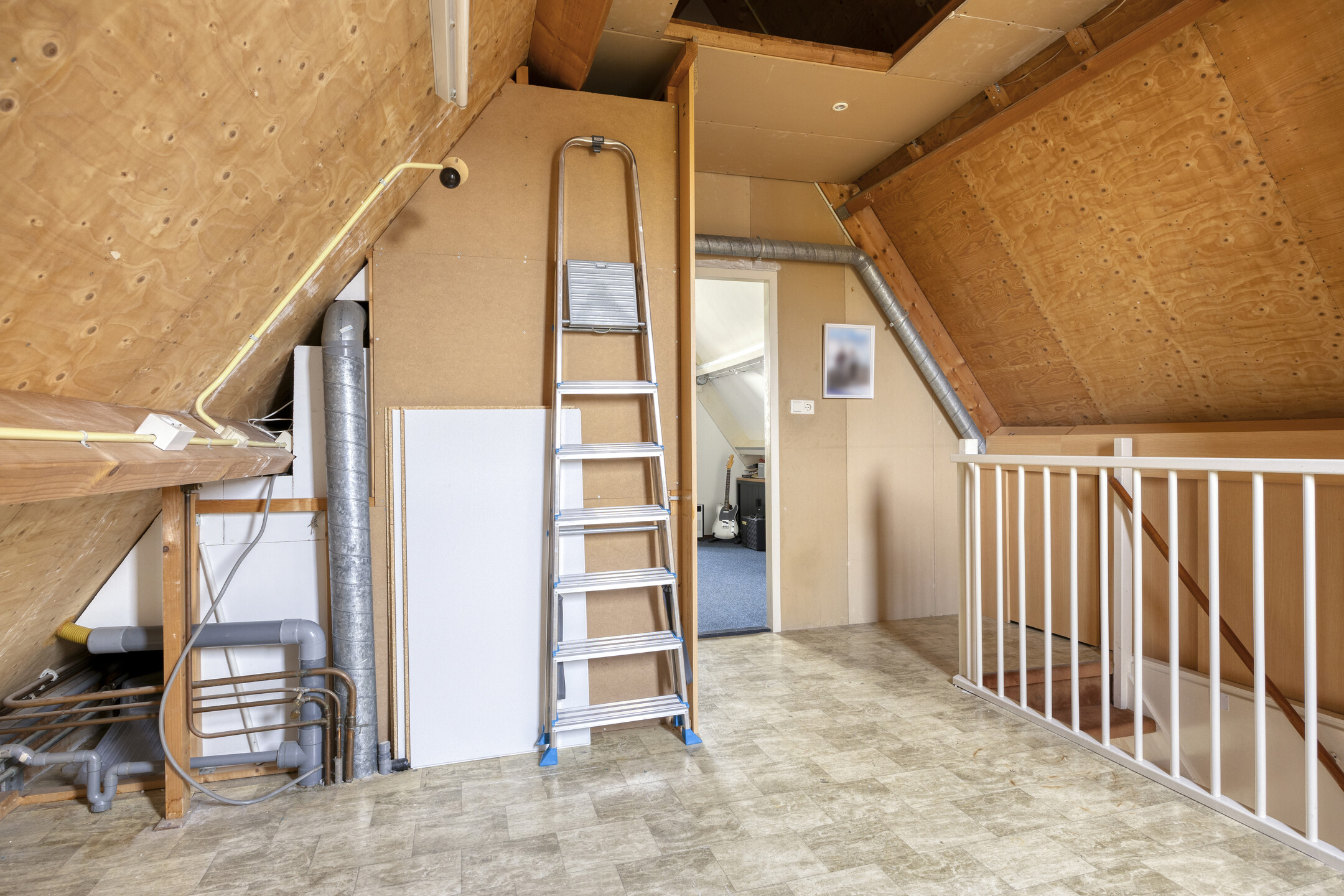 Ruime voorzolder waar eenvoudig een vijfde slaapkamer kan worden gecreëerd. Hier bevindt zich ook de berging/stookruimte (cv-installatie Atag, 2021) en met bergruimte achter de knieschotten. Aangrenzend bevindt zich de vierde slaapkamer (ca. 16 m2) met een fraai uitzicht op de sportvelden. Deze sfeervolle kamer, gelegen onder de schuine kap, is voorzien van airconditioning.