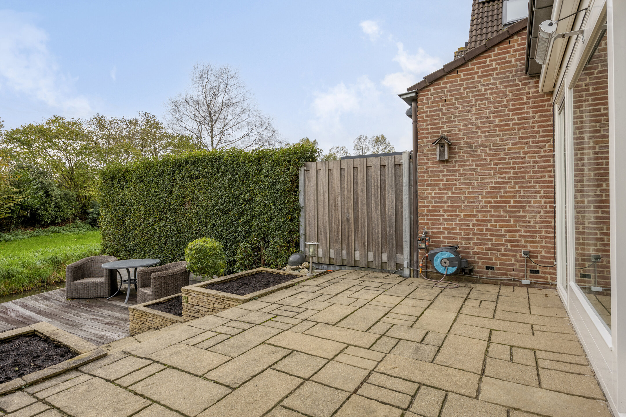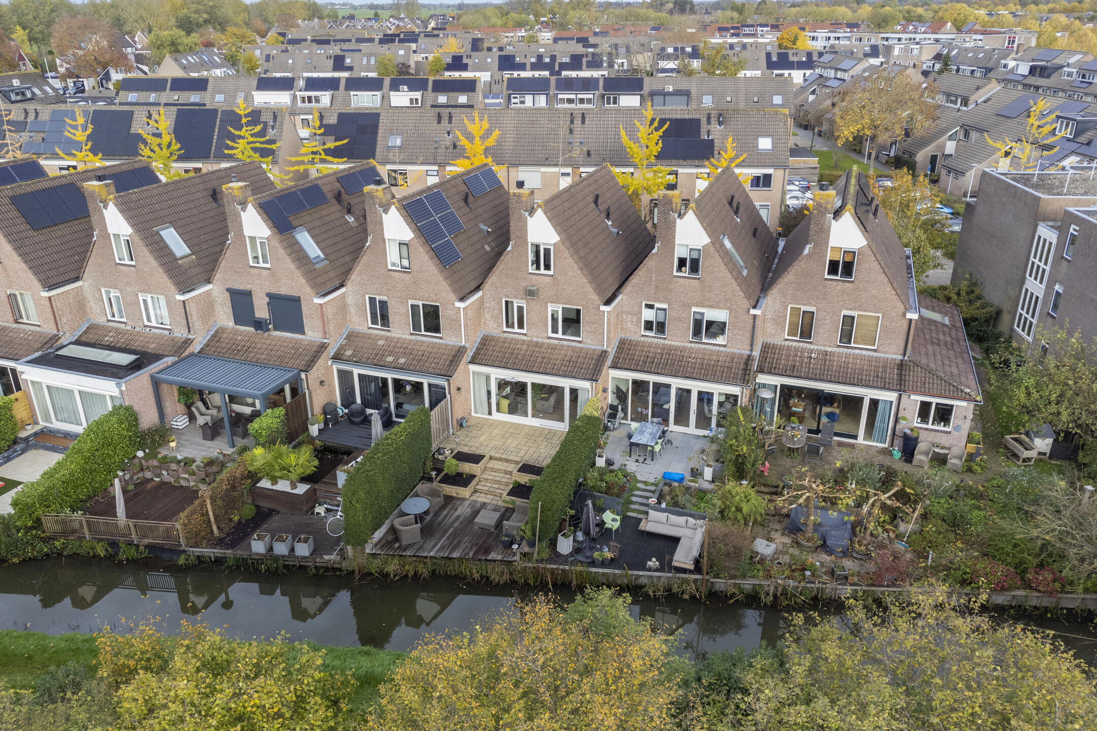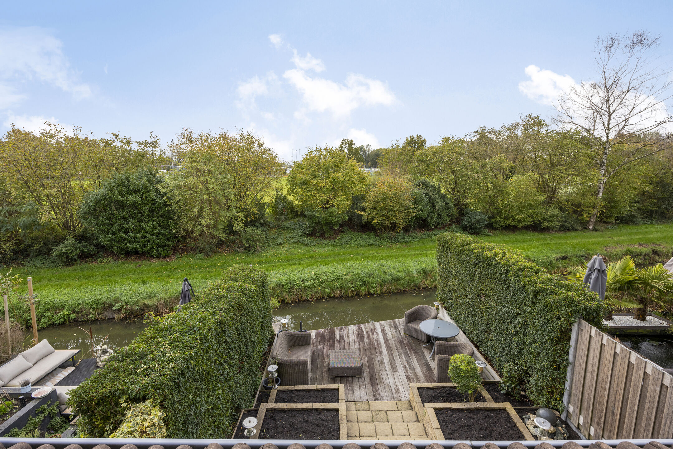 Aan de voorzijde beschikt de woning over een betegelde voortuin met parkeergelegenheid voor twee auto’s. De achtertuin, gelegen op het zonnige zuiden, is onderhoudsvriendelijk ingericht met twee zonneterrassen en diverse borders, waarvan één hardhouten terras gezellig aan de brede sloot ligt. Onder het brede elektrische zonnescherm, met infrarood-heater, is het tot in de late uurtjes heerlijk vertoeven. De gezellige buitenverlichting is vanuit binnen regelbaar.