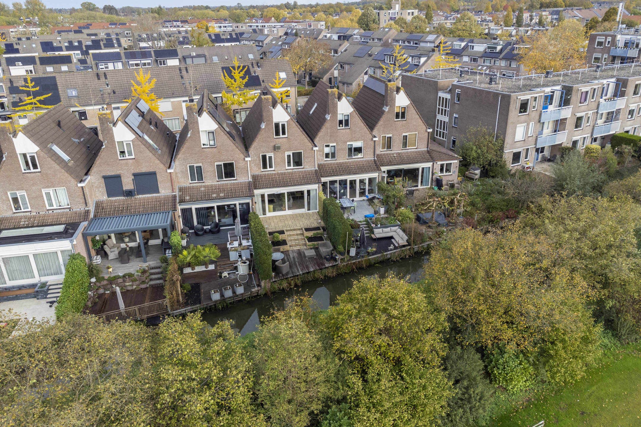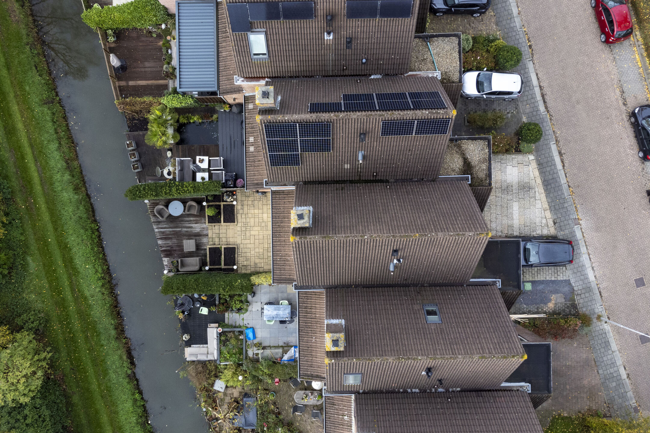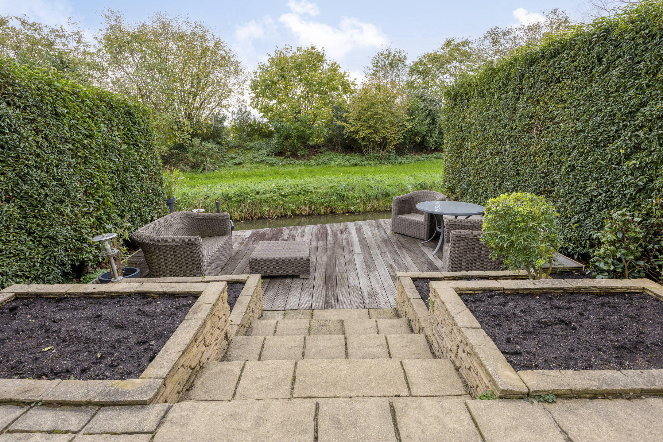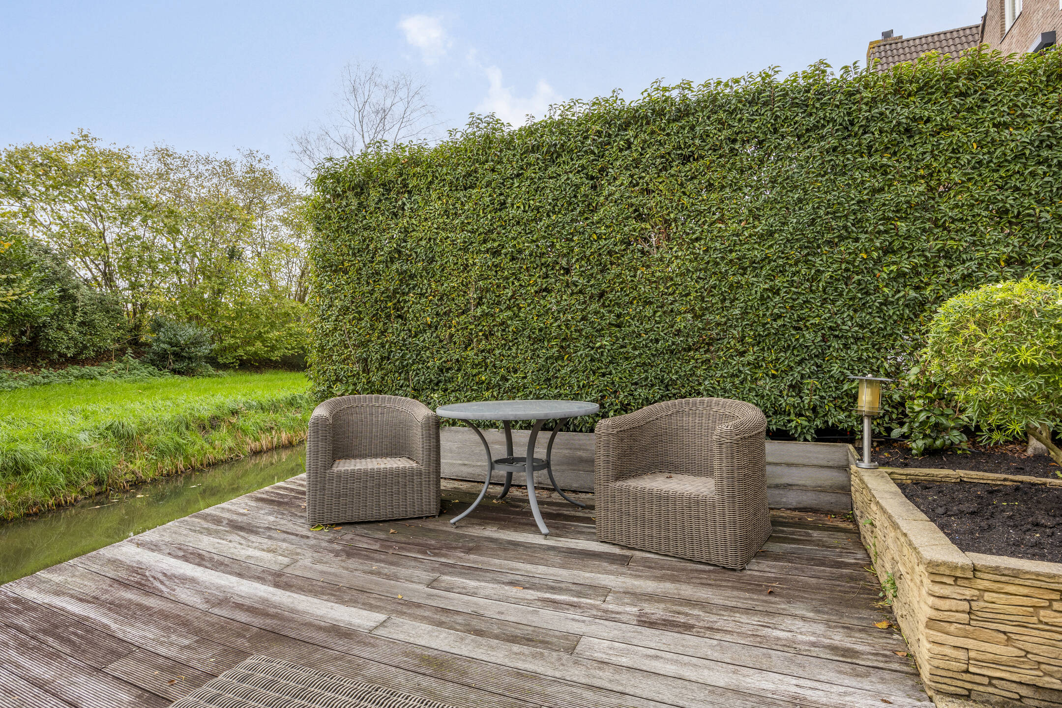 Aan de voorzijde beschikt de woning over een betegelde voortuin met parkeergelegenheid voor twee auto’s. De achtertuin, gelegen op het zonnige zuiden, is onderhoudsvriendelijk ingericht met twee zonneterrassen en diverse borders, waarvan één hardhouten terras gezellig aan de brede sloot ligt. Onder het brede elektrische zonnescherm, met infrarood-heater, is het tot in de late uurtjes heerlijk vertoeven. De gezellige buitenverlichting is vanuit binnen regelbaar.