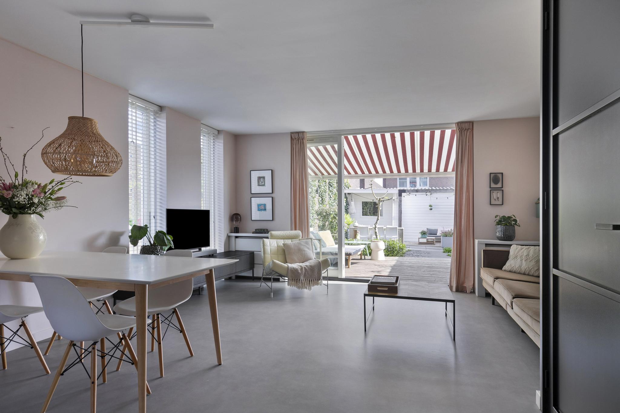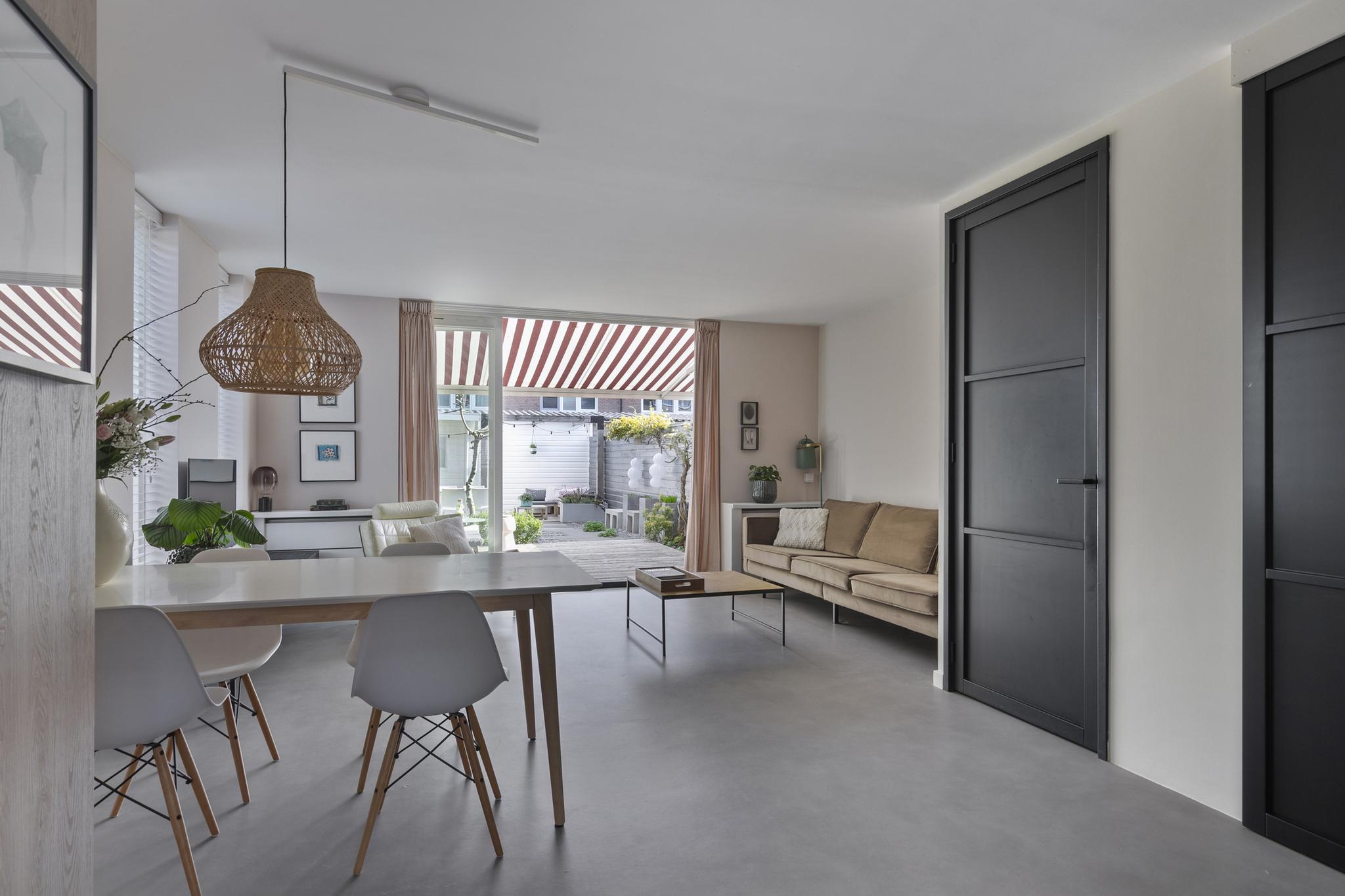 De stijlvolle woon-/eetkamer is ruim en licht, mede dankzij de slimme verbouwing waarbij een deel van de hal bij de woonkamer is getrokken. Aan de voorzijde bevindt zich de prachtige keuken: een combinatie van maatwerk en design, voorzien van Siemens en AEG apparatuur, een schuin afzuigsysteem en een Quooker voor direct kokend water.