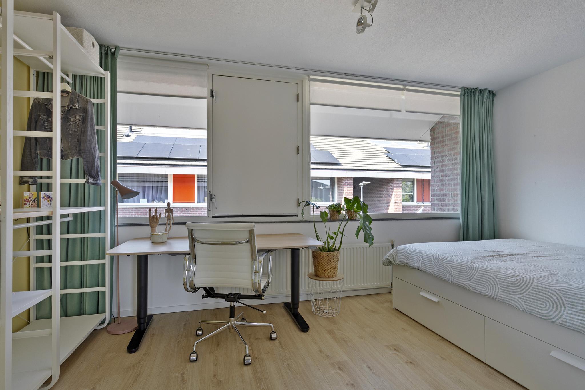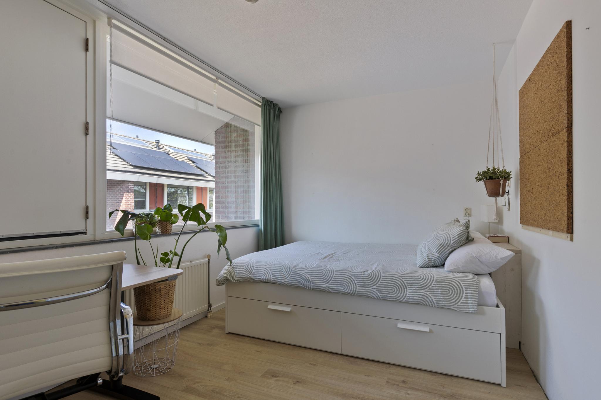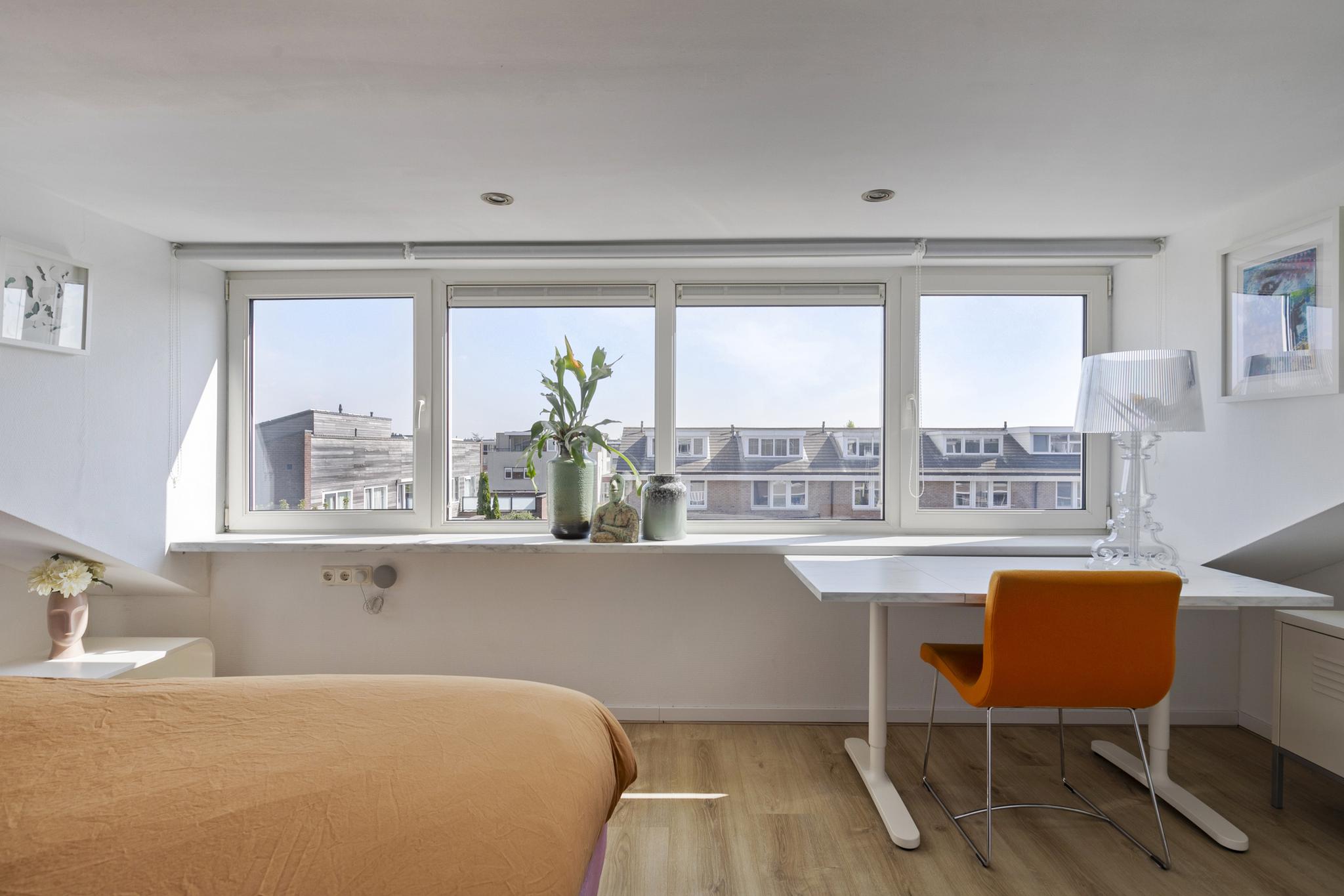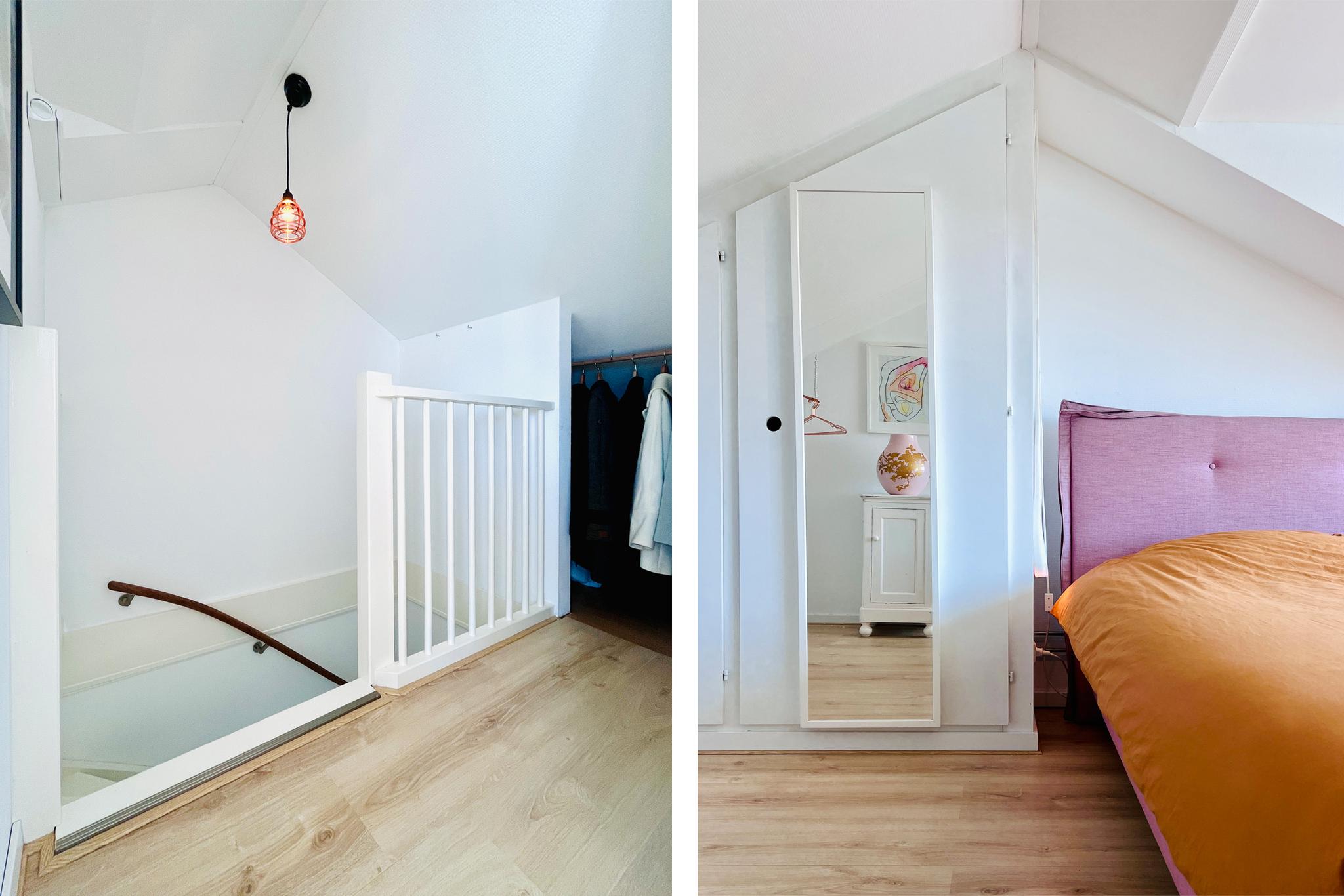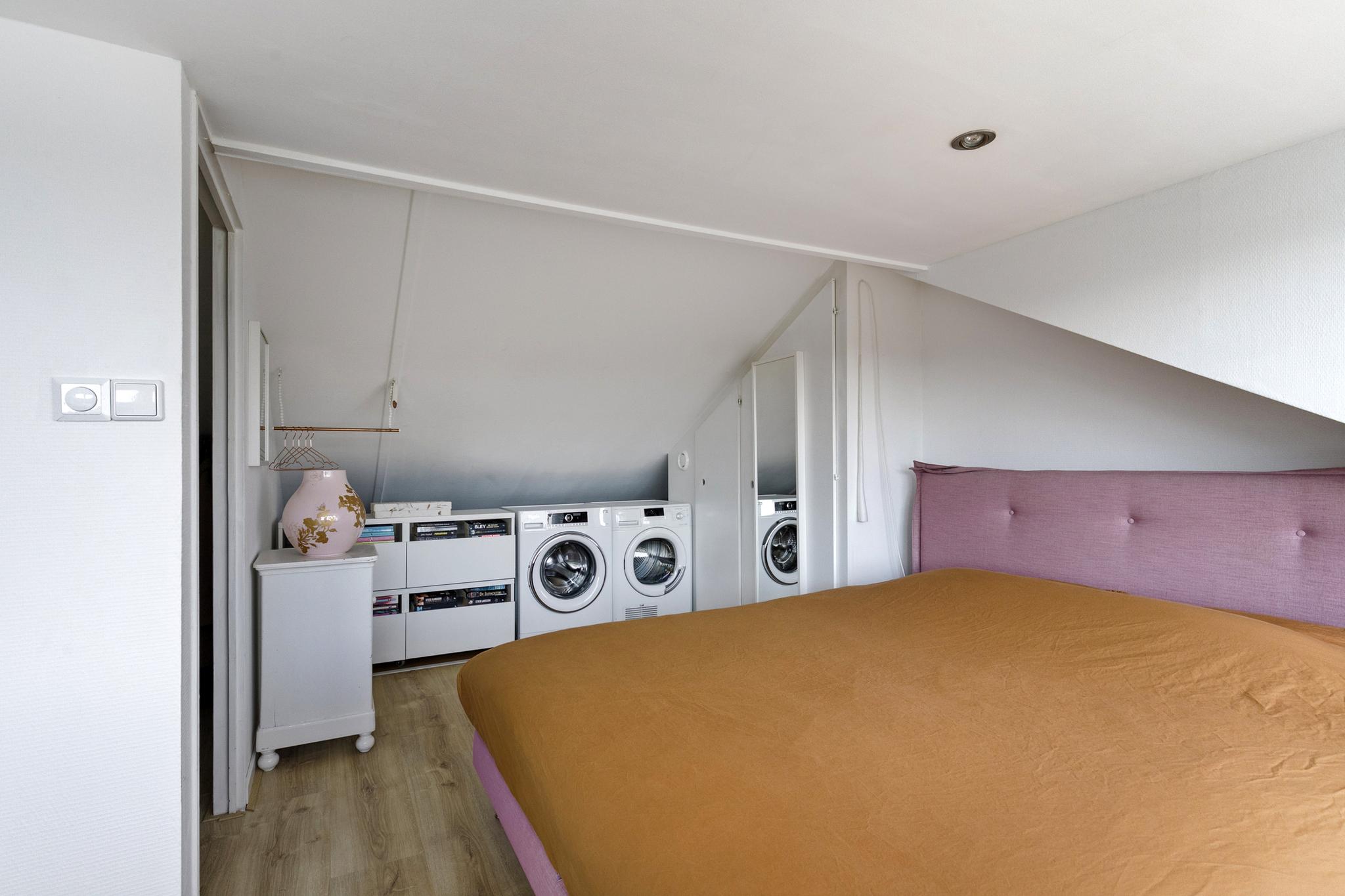 Via een overloop met extra bergruimte bereik je de ruime vierde slaapkamer (ca. 21,5 m²), met een brede dakkapel en dimbare inbouwspots. De kamer is heerlijk licht en heeft een moderne laminaatvloer.