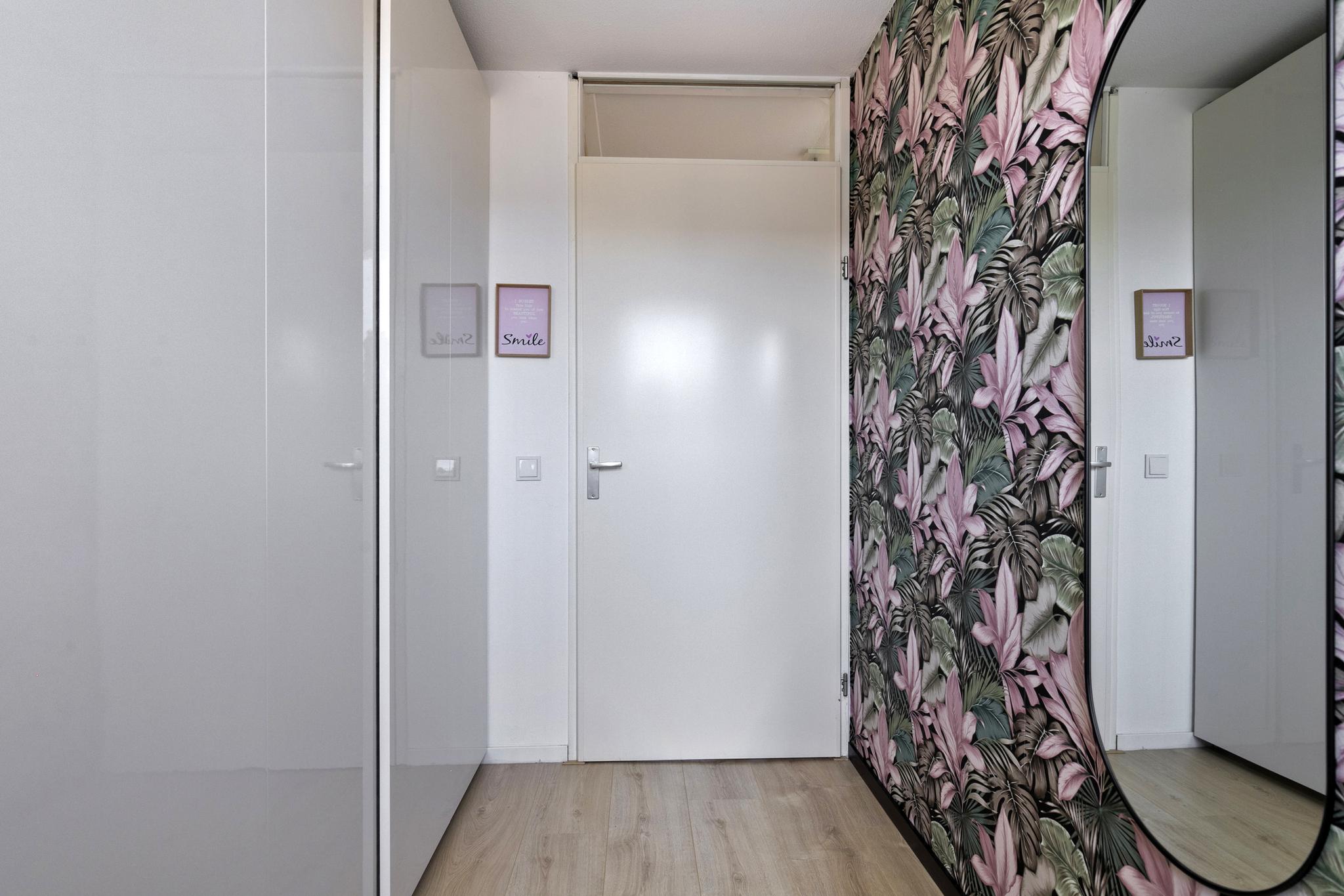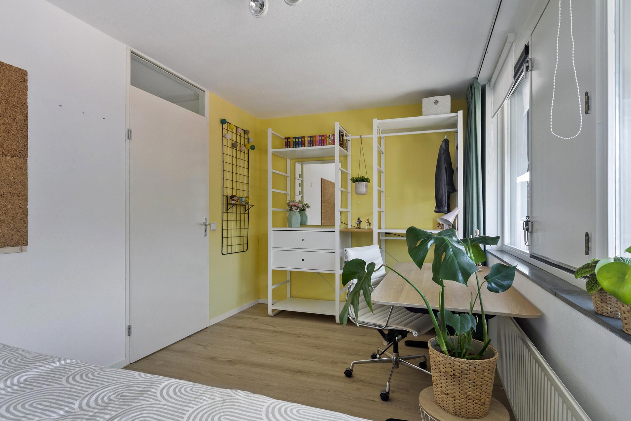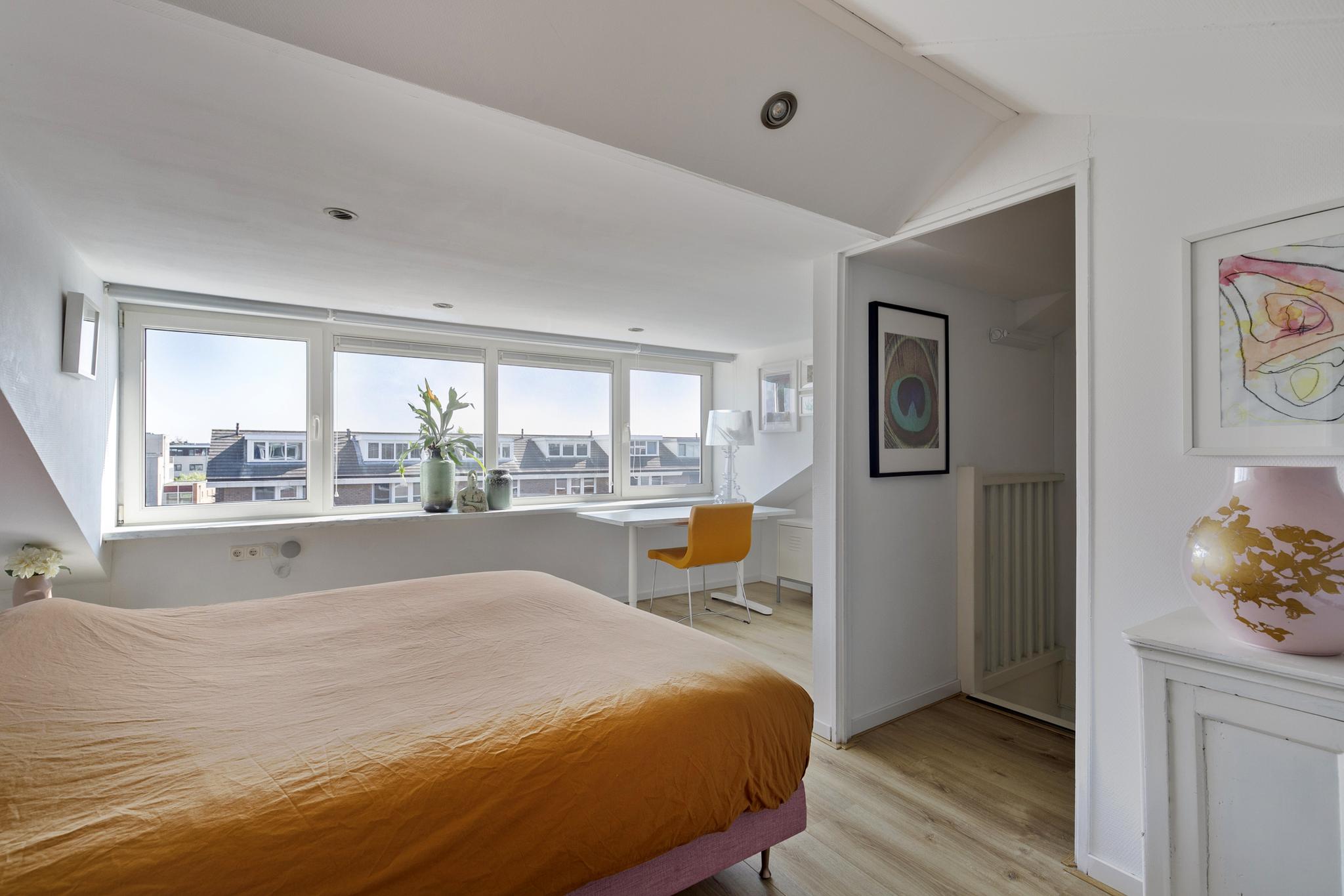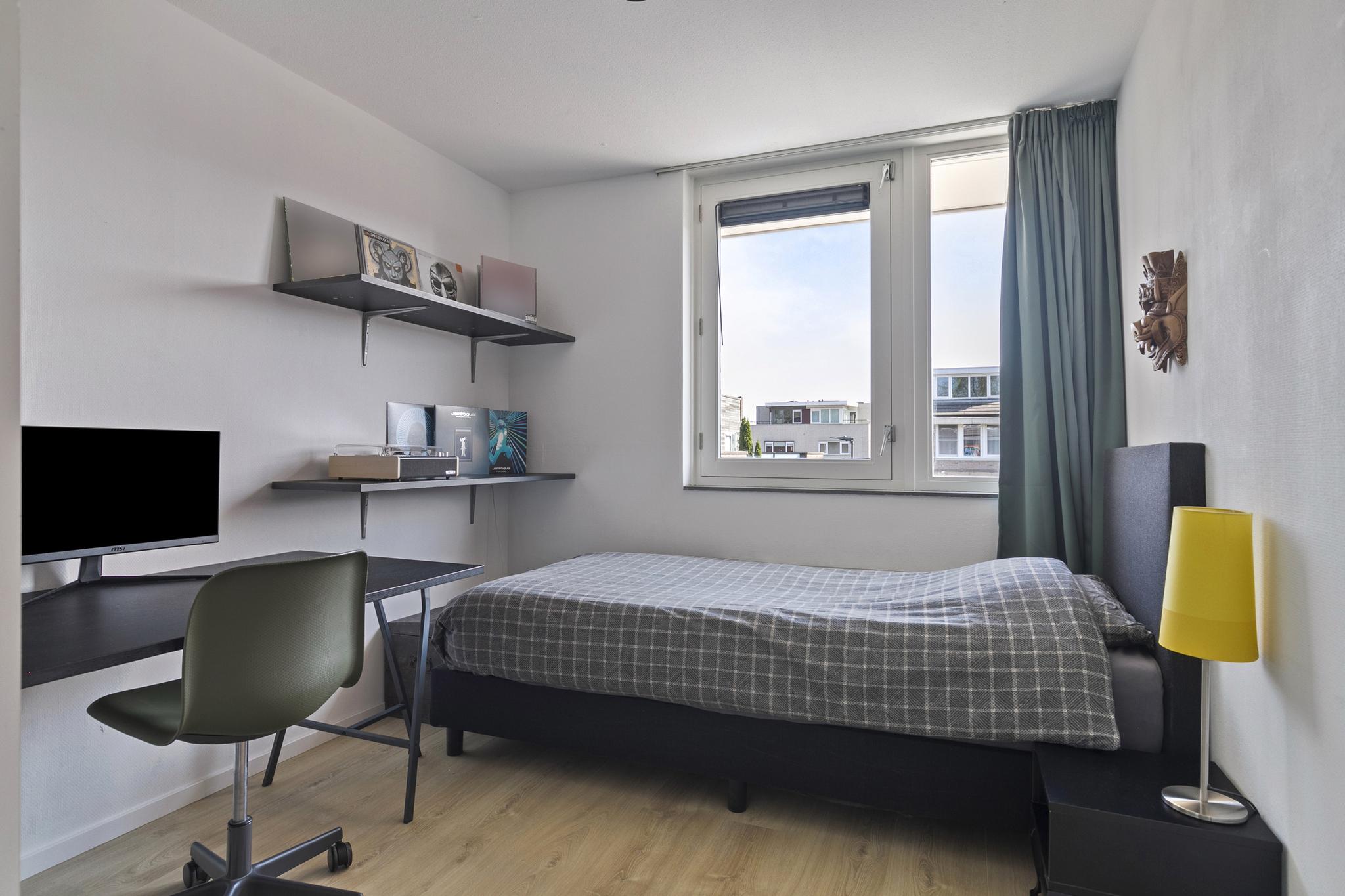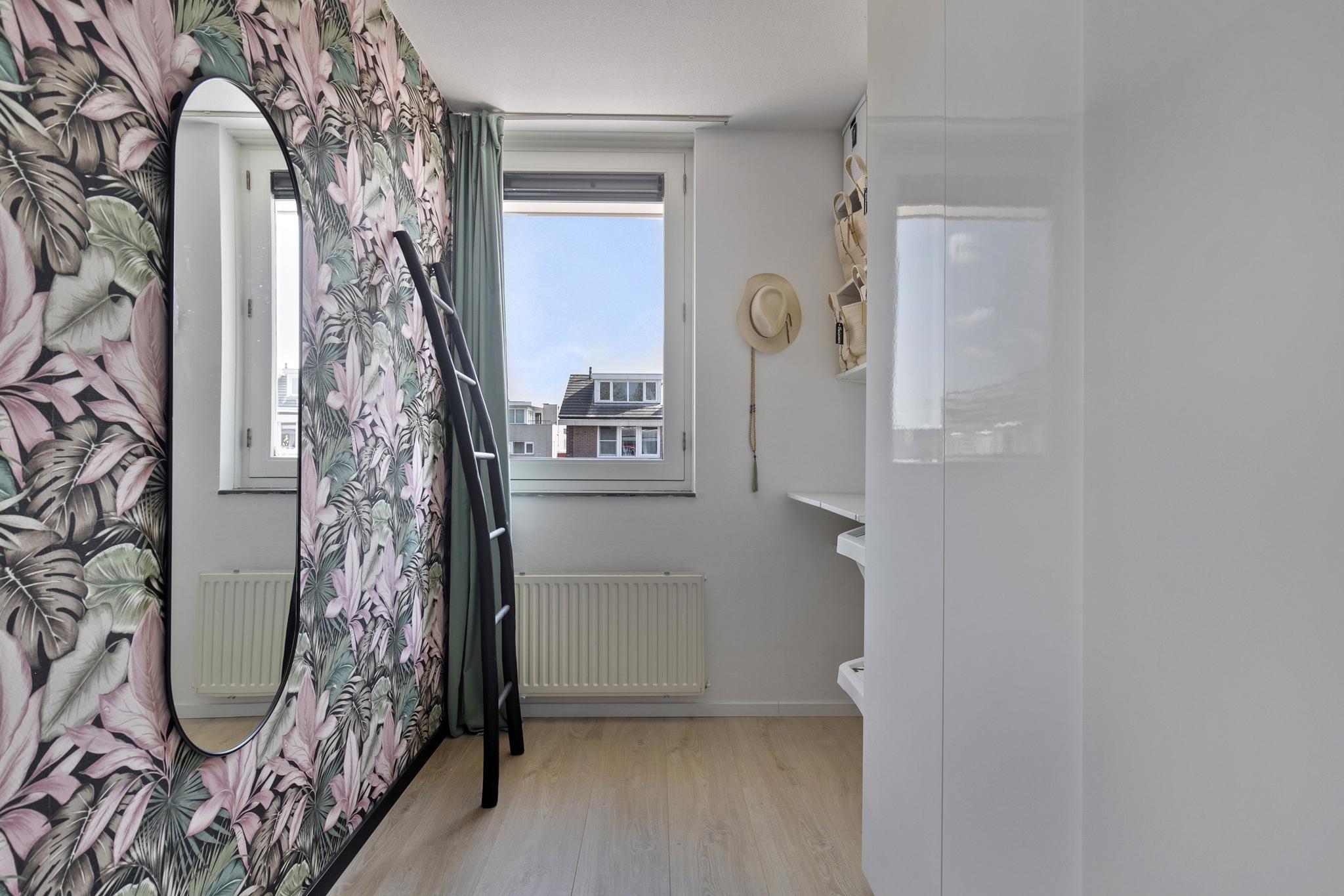 Via een overloop met extra bergruimte bereik je de ruime vierde slaapkamer (ca. 21,5 m²), met een brede dakkapel en dimbare inbouwspots. De kamer is heerlijk licht en heeft een moderne laminaatvloer.