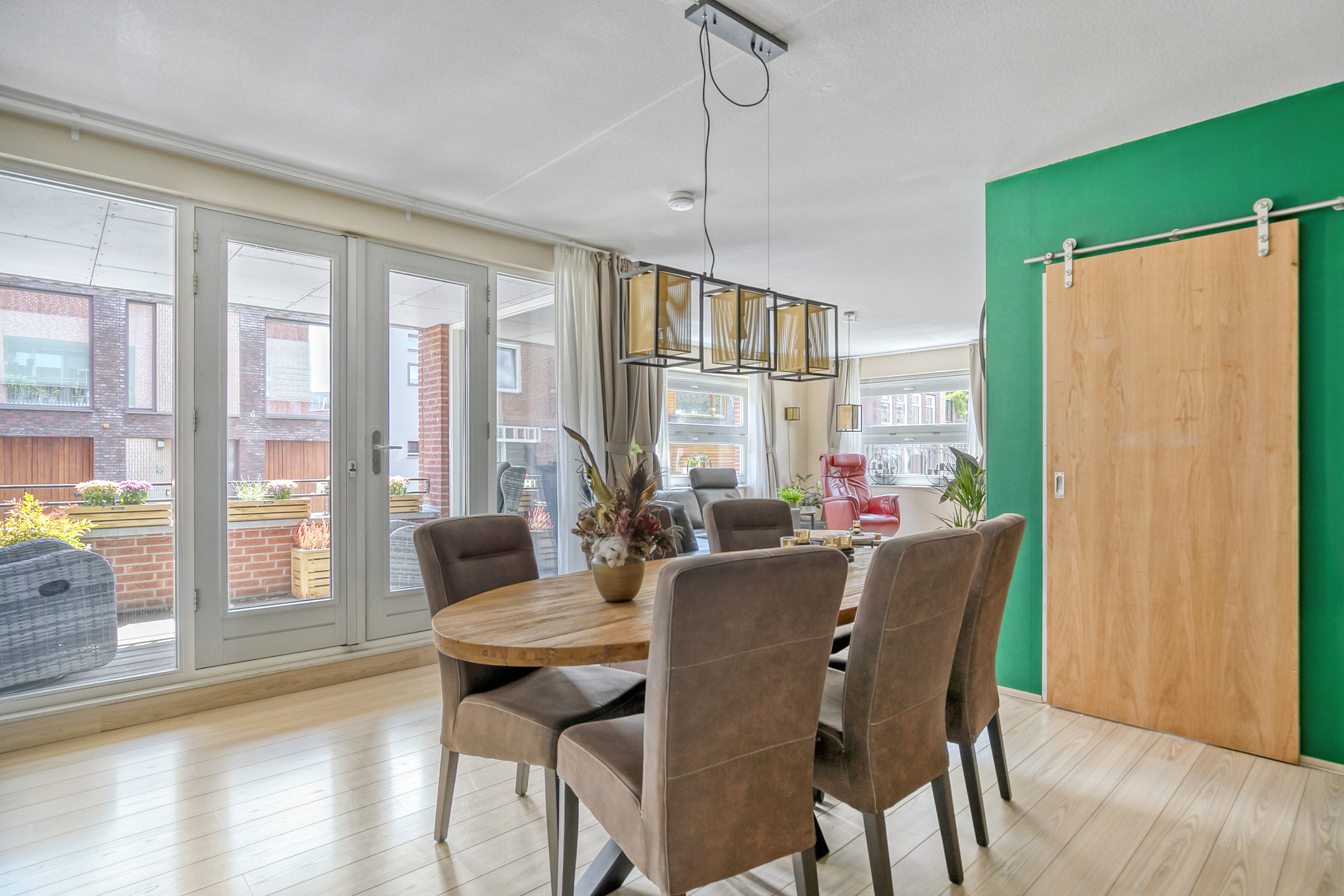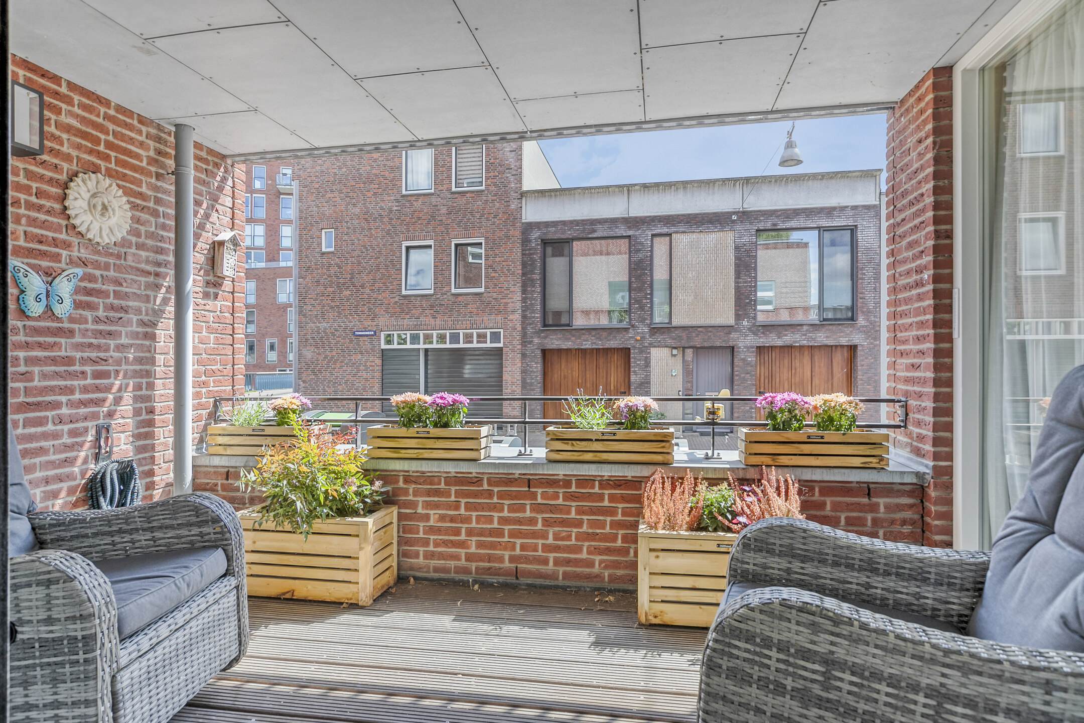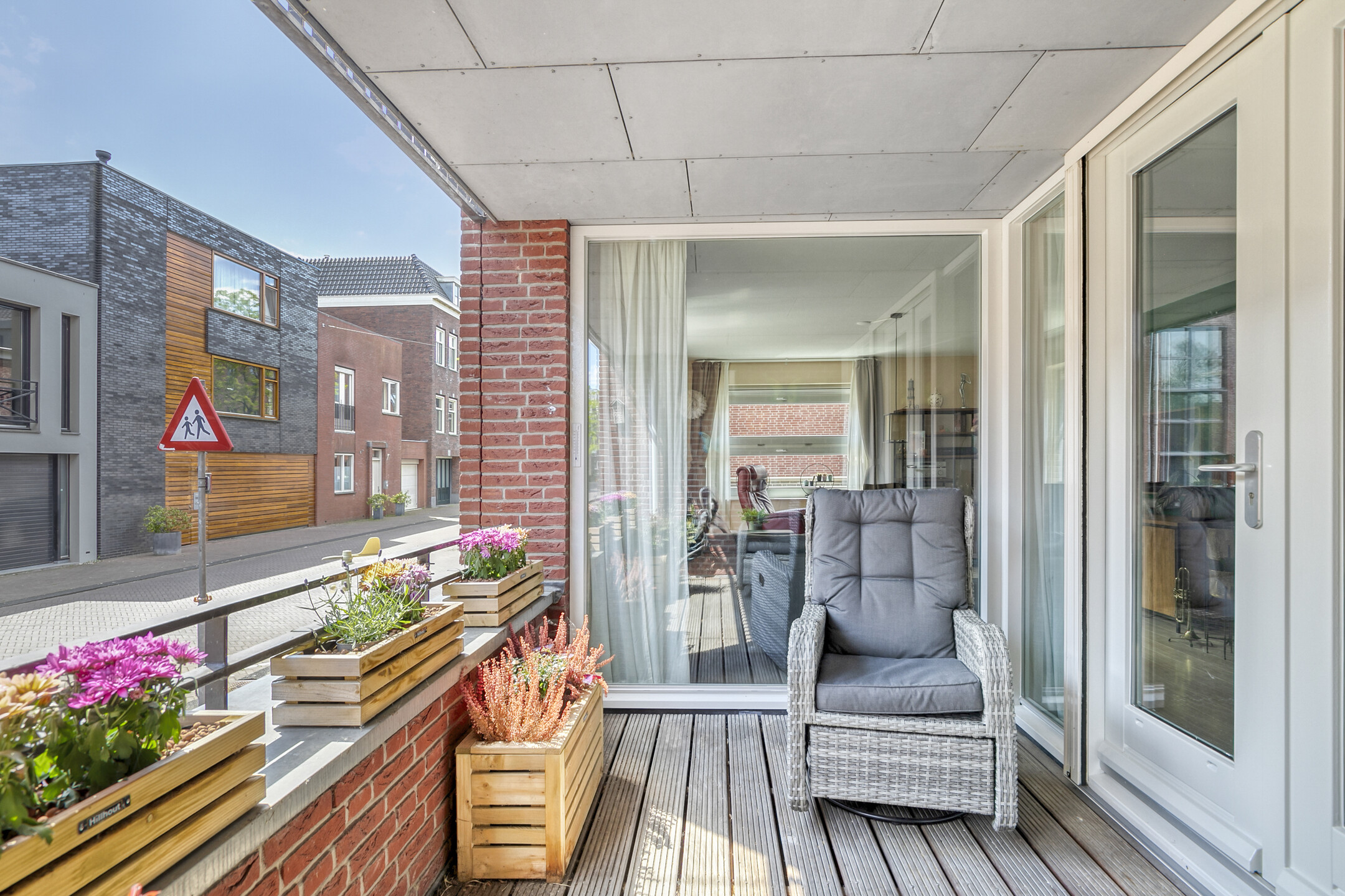 Via openslaande deuren in de eetkamer bereikt u het overdekte balkon (ca. 8 m²), met houten vlonders en een balustrade. Hier kunt u al vroeg in het voorjaar van de zon genieten.