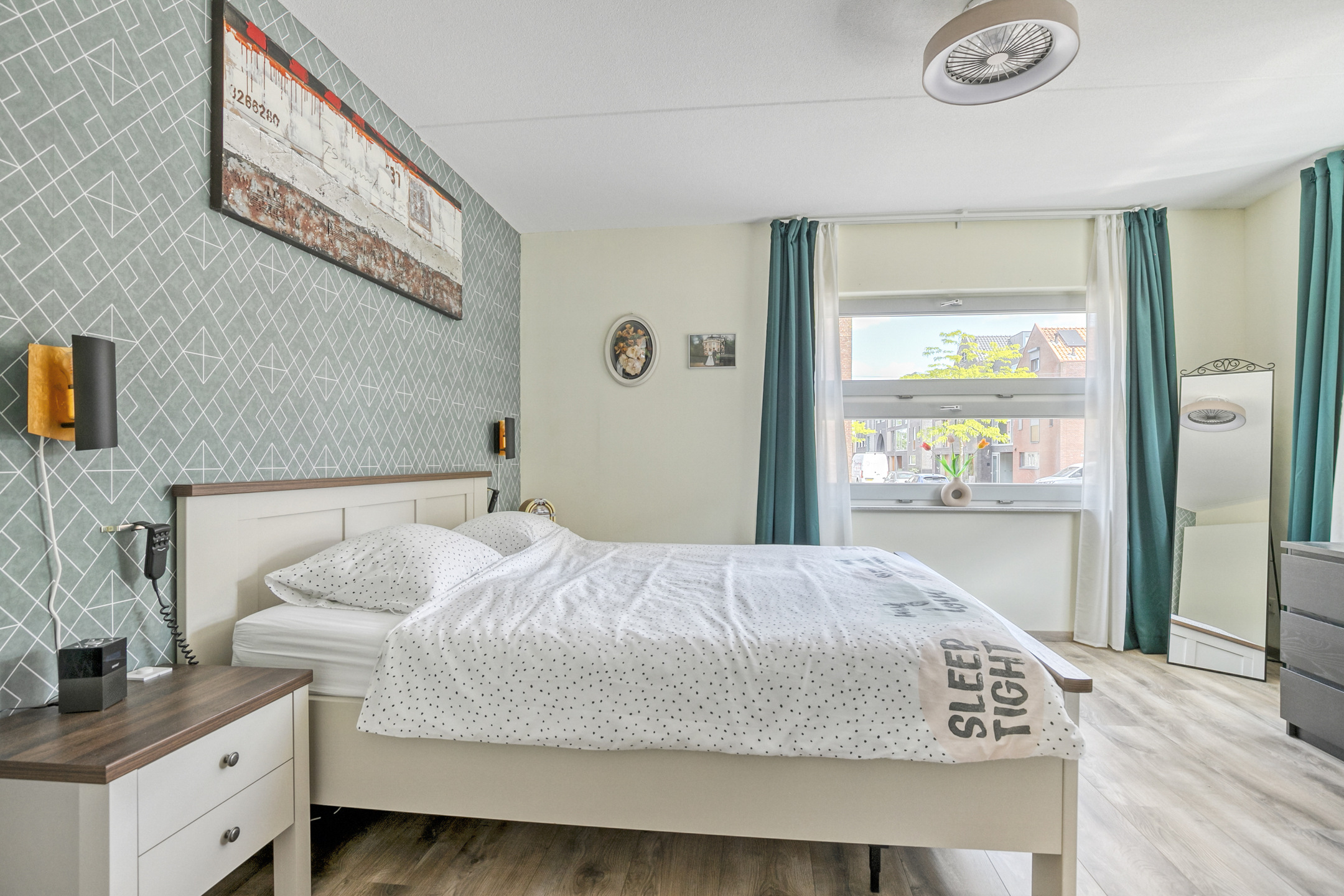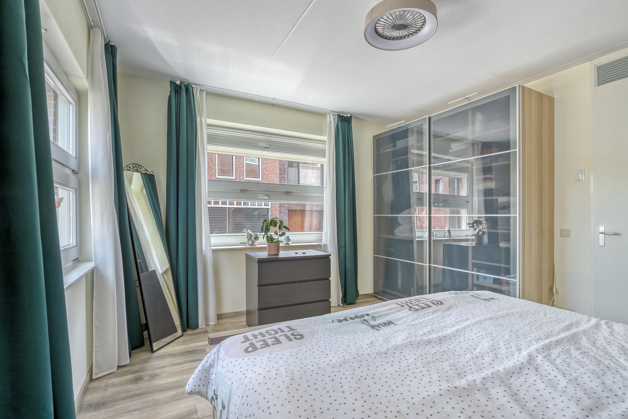 Naast de woonkamer ligt een tweede slaapkamer, momenteel in gebruik als logeerkamer en werkkamer. De ruime hoofdslaapkamer beschikt over een elektrische buitenzonwering (rolluik) en een grote linnenkast met schuifdeuren.