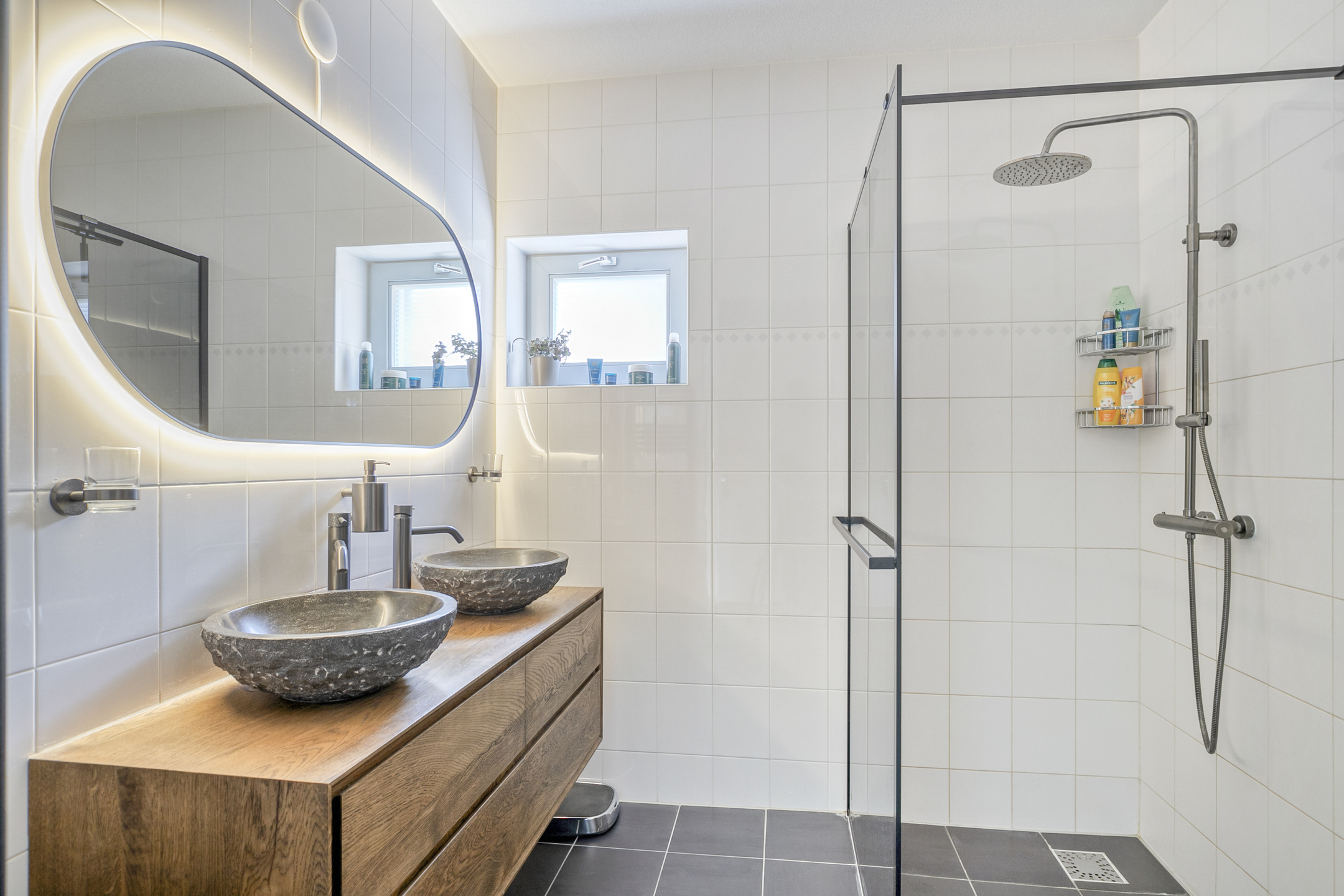 De badkamer, geheel vernieuwd in 2023, is praktisch ingericht met een inloopdouche, wastafelmeubel, handdoekradiator en een raam voor frisse lucht. Het toilet bevindt zich apart in de hal en is voorzien van een wandcloset en fonteintje.